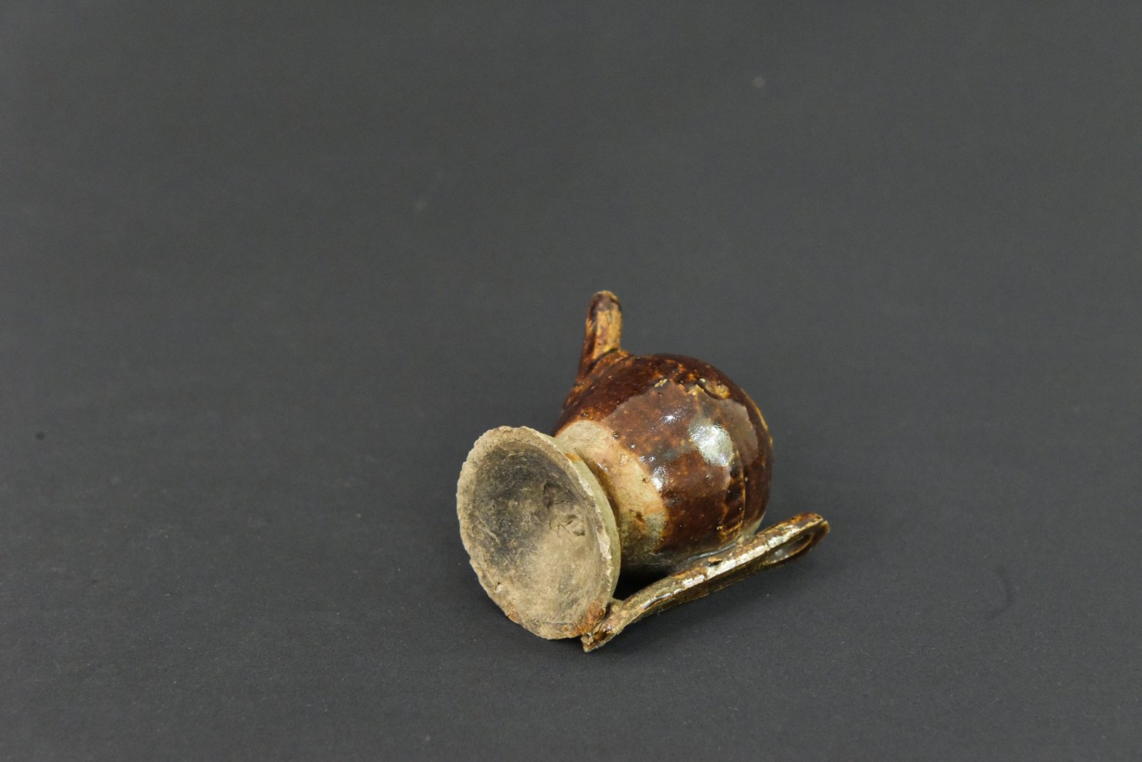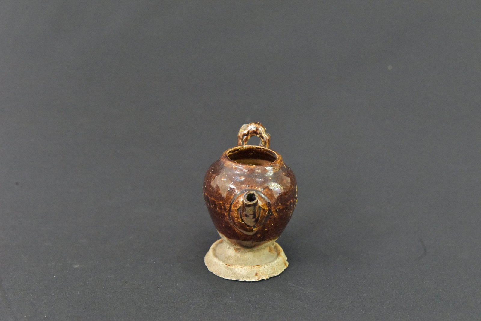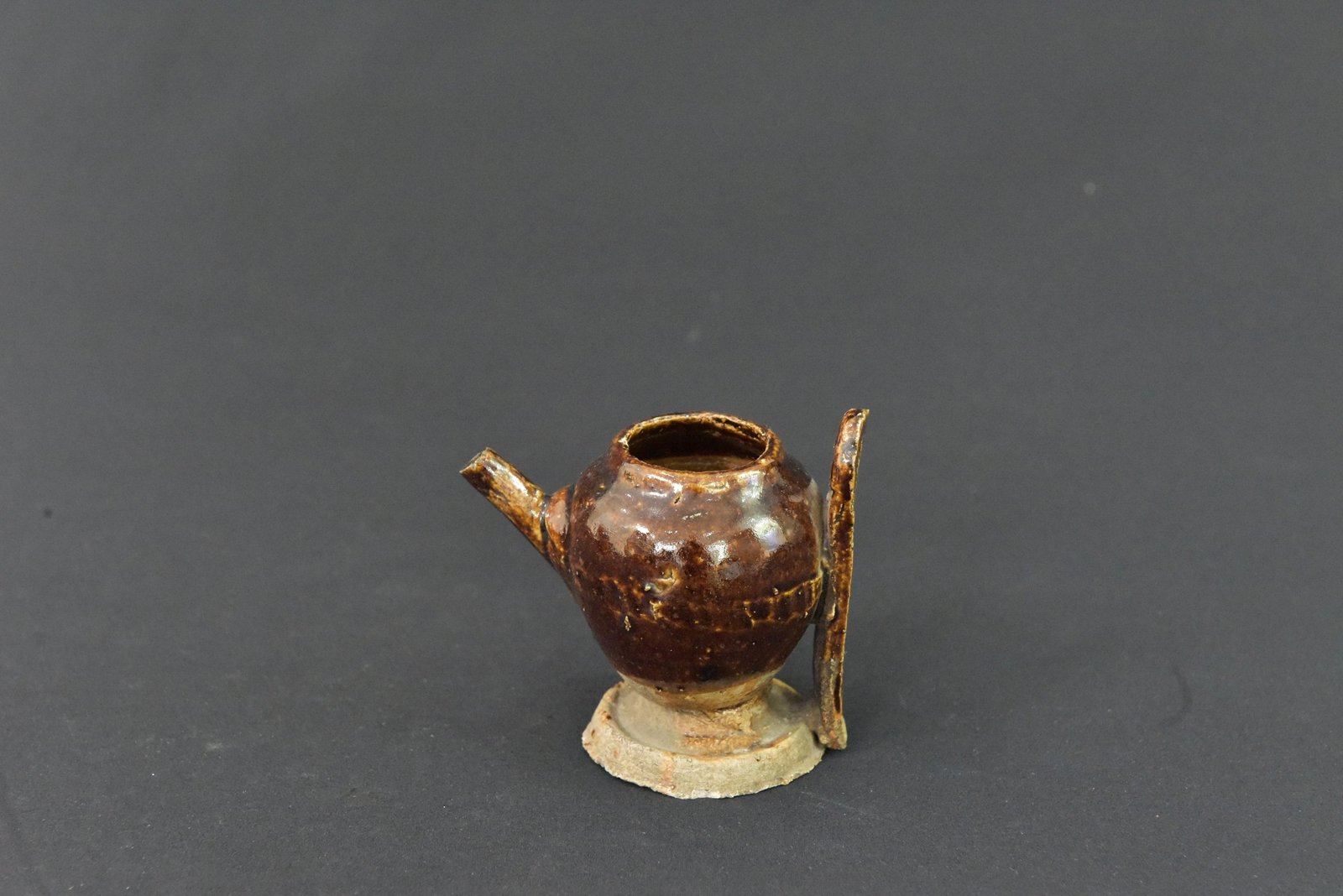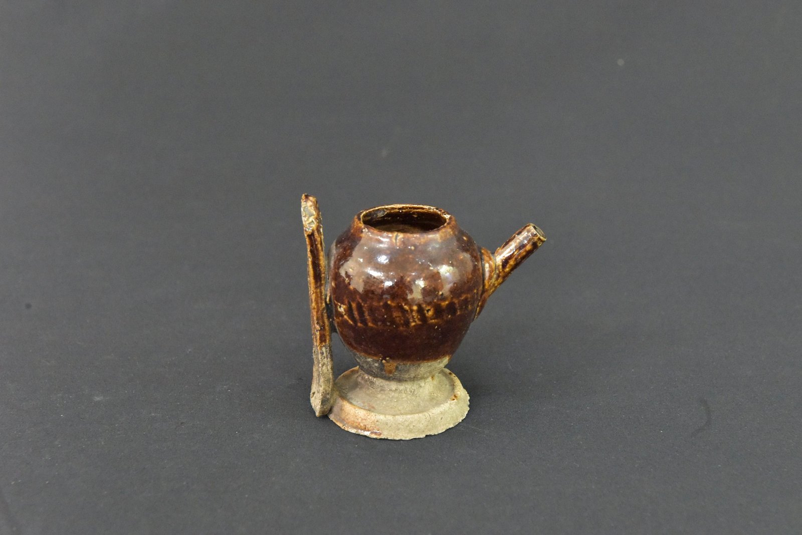 Charming miniature ceramic teapot with a rich brown glaze, showcasing a classic rounded body, short spout, and a vertical handle. The piece features subtle variations in glaze tone, adding depth and character to its appearance. Perfect as a collectible display item or for decorative arrangements.
