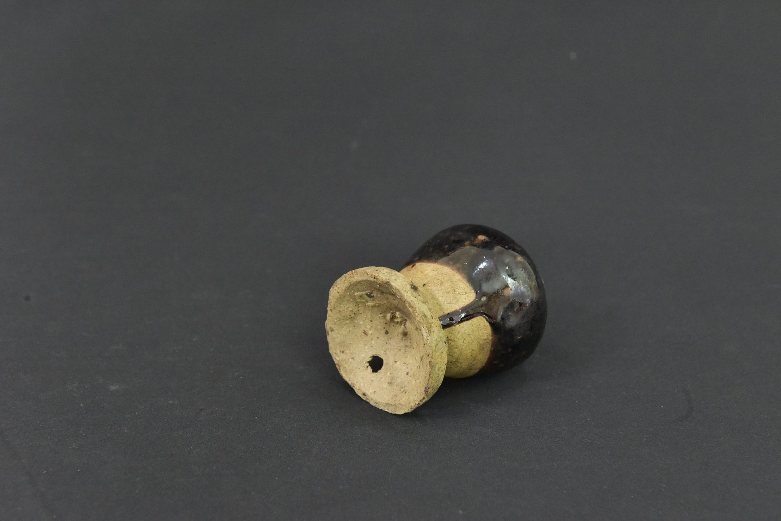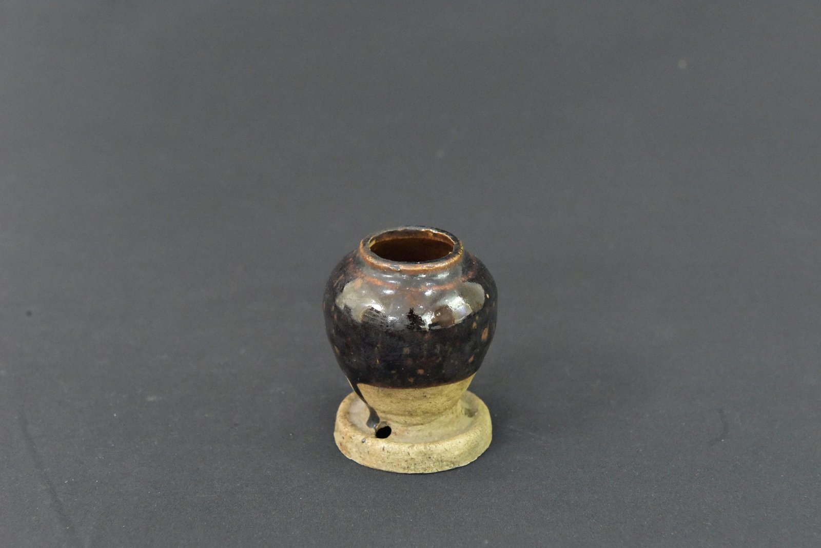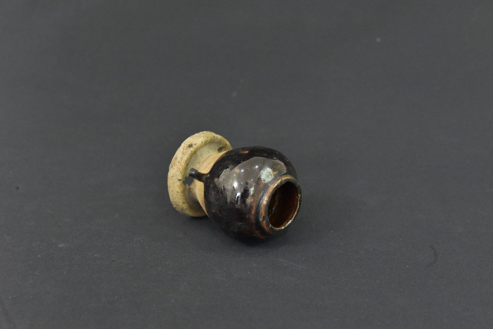 Elegant 1960s ceramic vase with a glossy dark glaze over a rounded body, set on a natural-toned base with integrated stand. Its smooth curves and rich glaze create a timeless mid-century display piece.