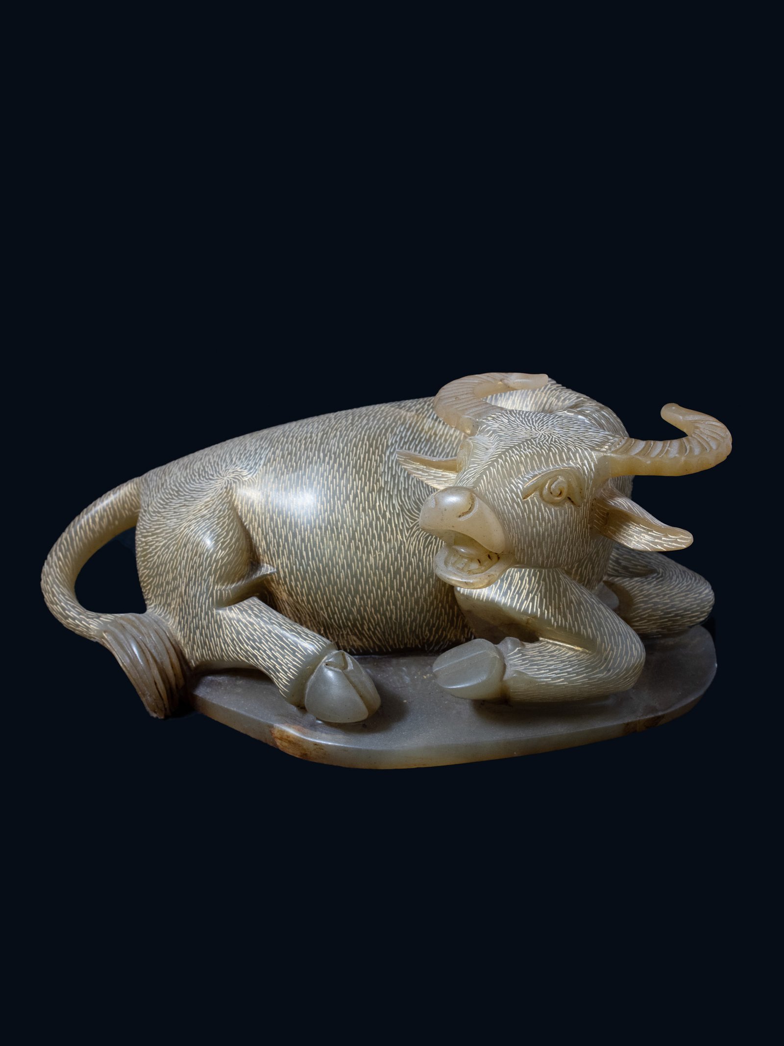 The relaxed, naturalistic pose of the present water buffalo is similar to that of another jade figure illustrated by Jessica Rawson, Chinese Jade from the Neolithic to the Qing, British Museum, 1995, pp. 370-71, no. 26.14, where it is dated Song dynasty or later. The naturalism of the pose can be compared to that of two stone paper weights in the shape of mythical, horned animals shown in a reclining position with heads raised that were found in a Southern Song tomb at Zhejiang Zhuji xian, p. 356, fig. 10. Water buffaloes were not highly represented in the repertoire of pre-Ming jade carvings, but may have become more popular during the Song and Yuan dynasties when ceramic and bronze water droppers in the shape of a water buffalo were popular. See, for example, the Longquan water dropper dated 13th-14th century illustrated in Jenny F.