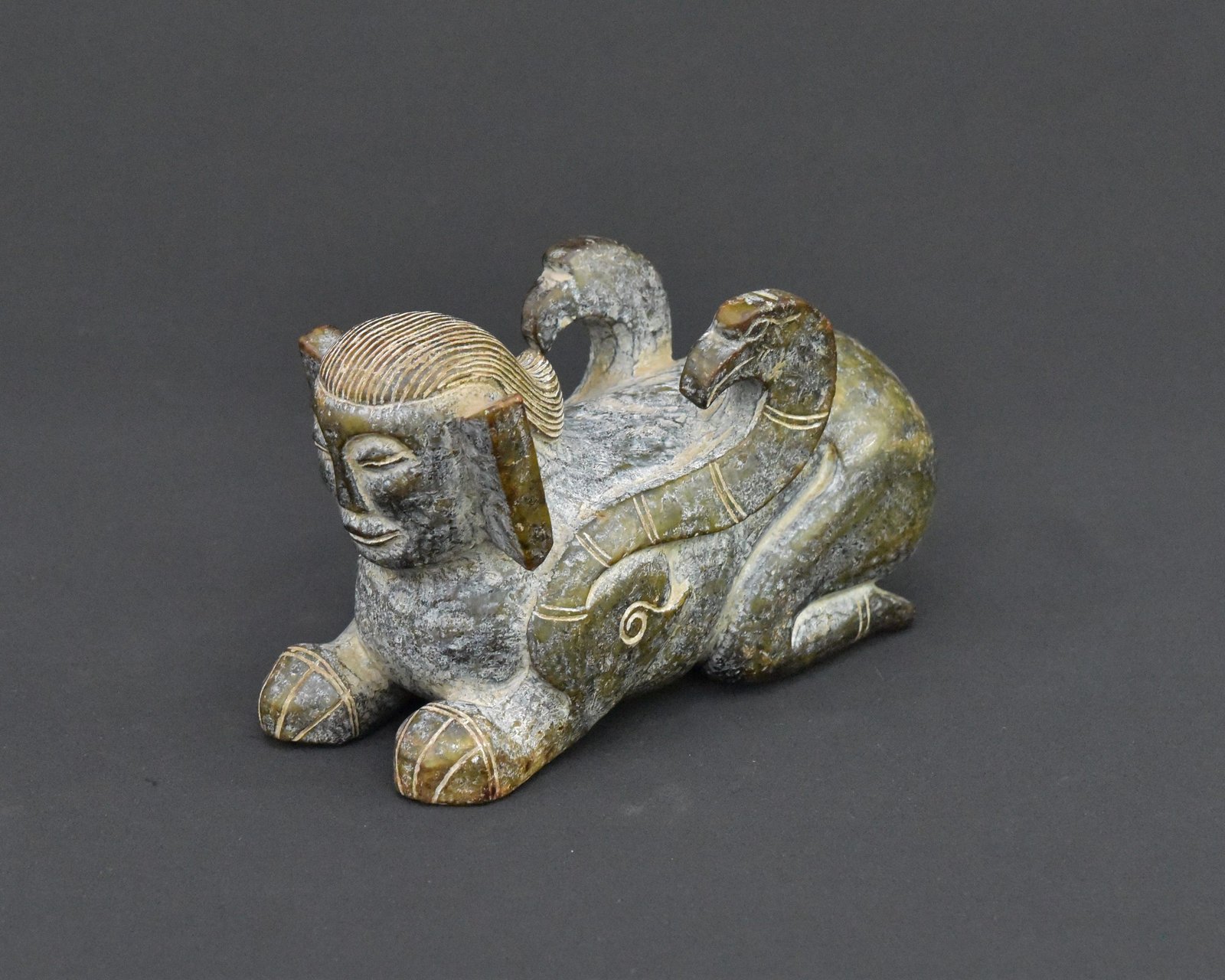 This unique sculpture represents a mythical beast guardian in the traditional ancient Chinese style, carved from what appears to be jade stone. The figure features a powerful lion-like body with a stylized human face and intricate detailing, including two serpentine creatures arching over its back. These hybrid guardian figures were believed to offer protection and spiritual strength, often associated with temple or tomb guardianship in Chinese lore.