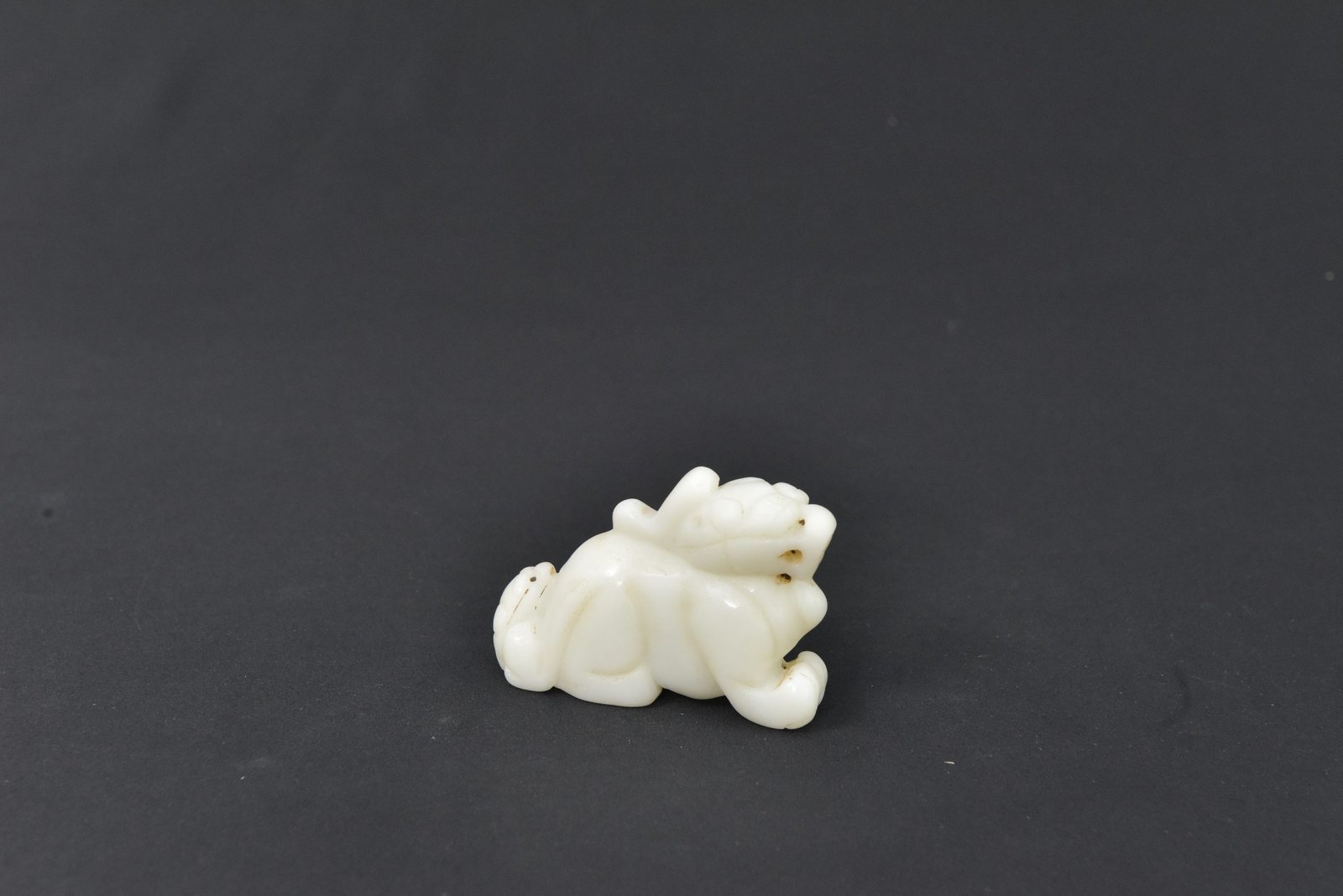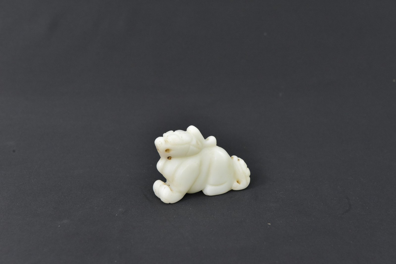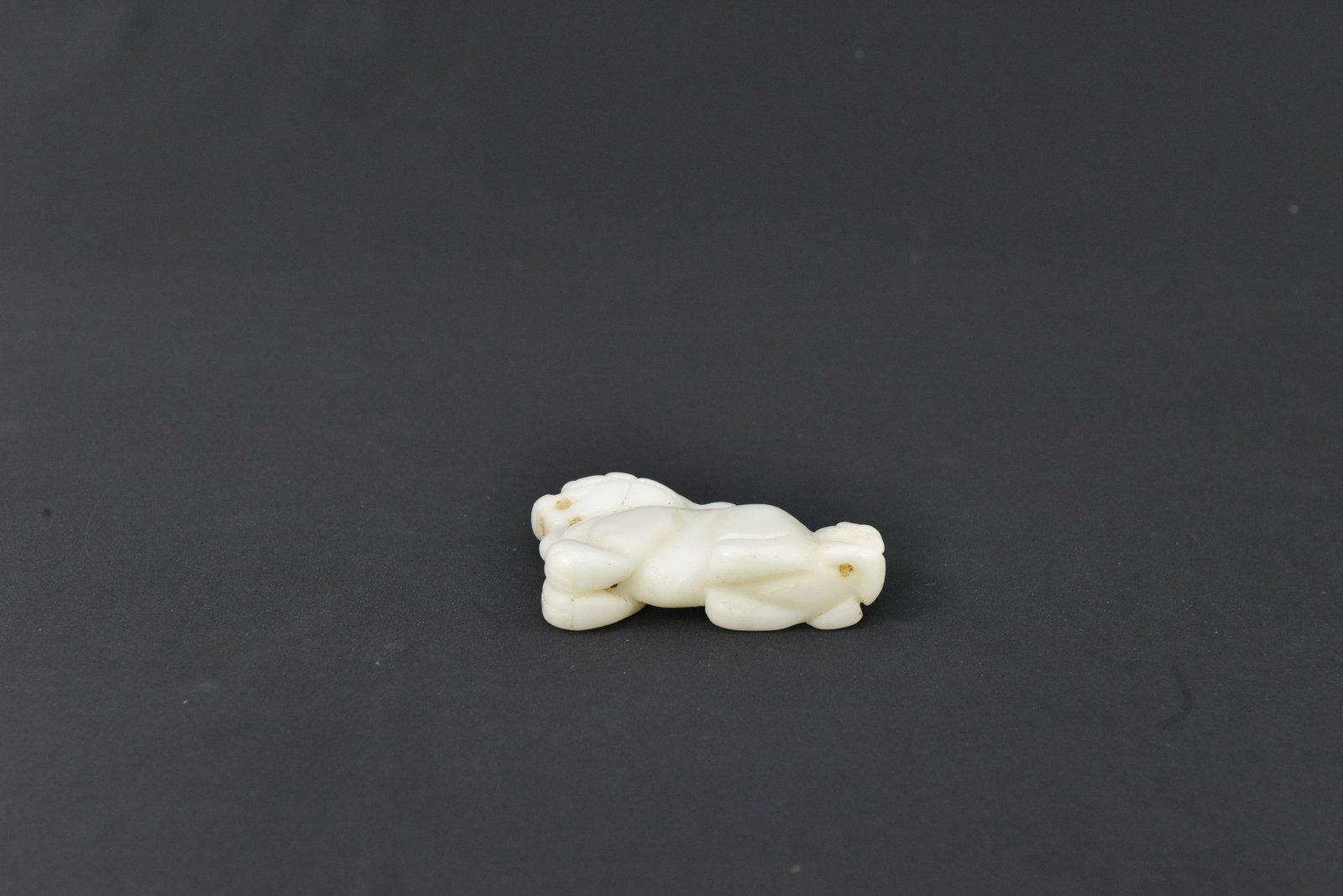 A finely detailed carving in white jade depicting a rabbit, rendered with graceful lines and naturalistic proportions. The piece displays traditional craftsmanship, with smooth contours and subtle incised detailing that enhance its form. The white jade has a soft, lustrous finish, highlighting its fine quality and elegance.
