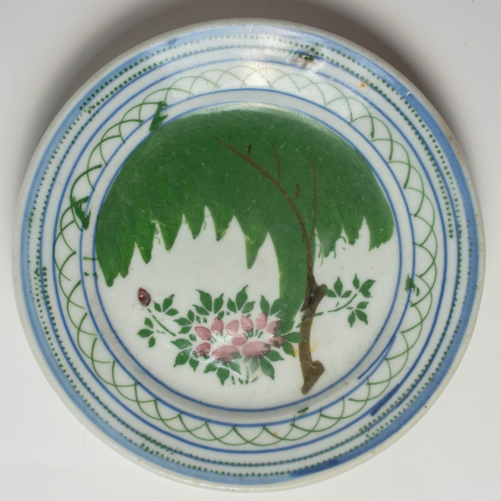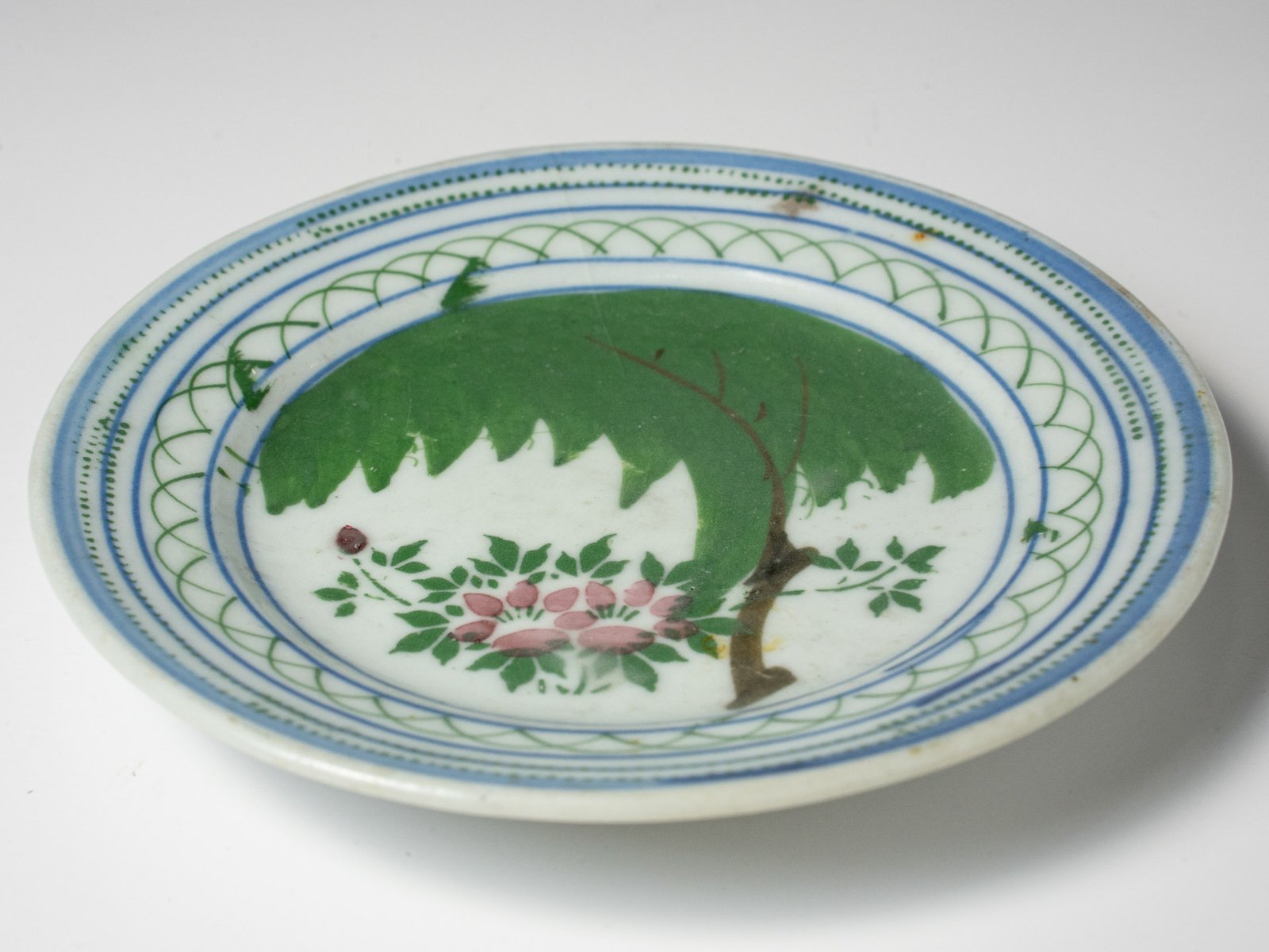 The plate has some glaze contractions and rust spots.
