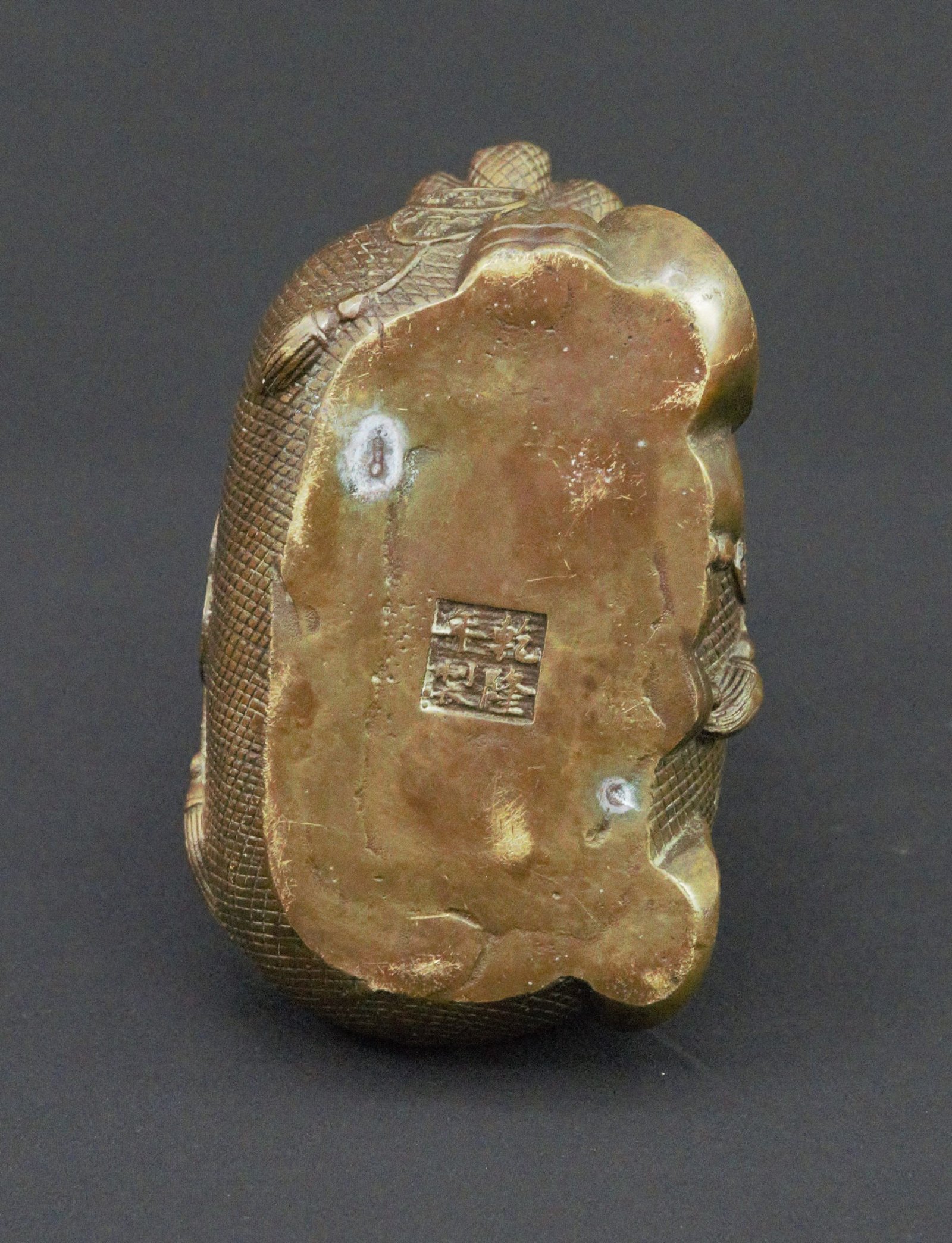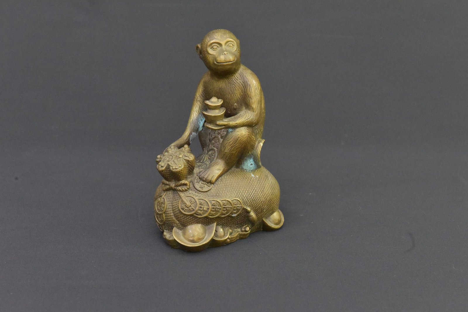 This exquisite copper sculpture features a monkey, believed to be from the Qianlong era, crafted with intricate detail and symbolism. The monkey is shown holding a golden yuanbao ingot and Chinese coins, seated gracefully atop a money sack, symbolizing wealth and good fortune. The piece is made of high-quality copper and displays classic Chinese design elements that reflect prosperity, making it a perfect addition to any collection or display.