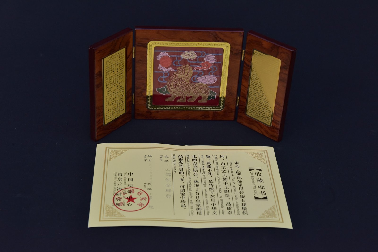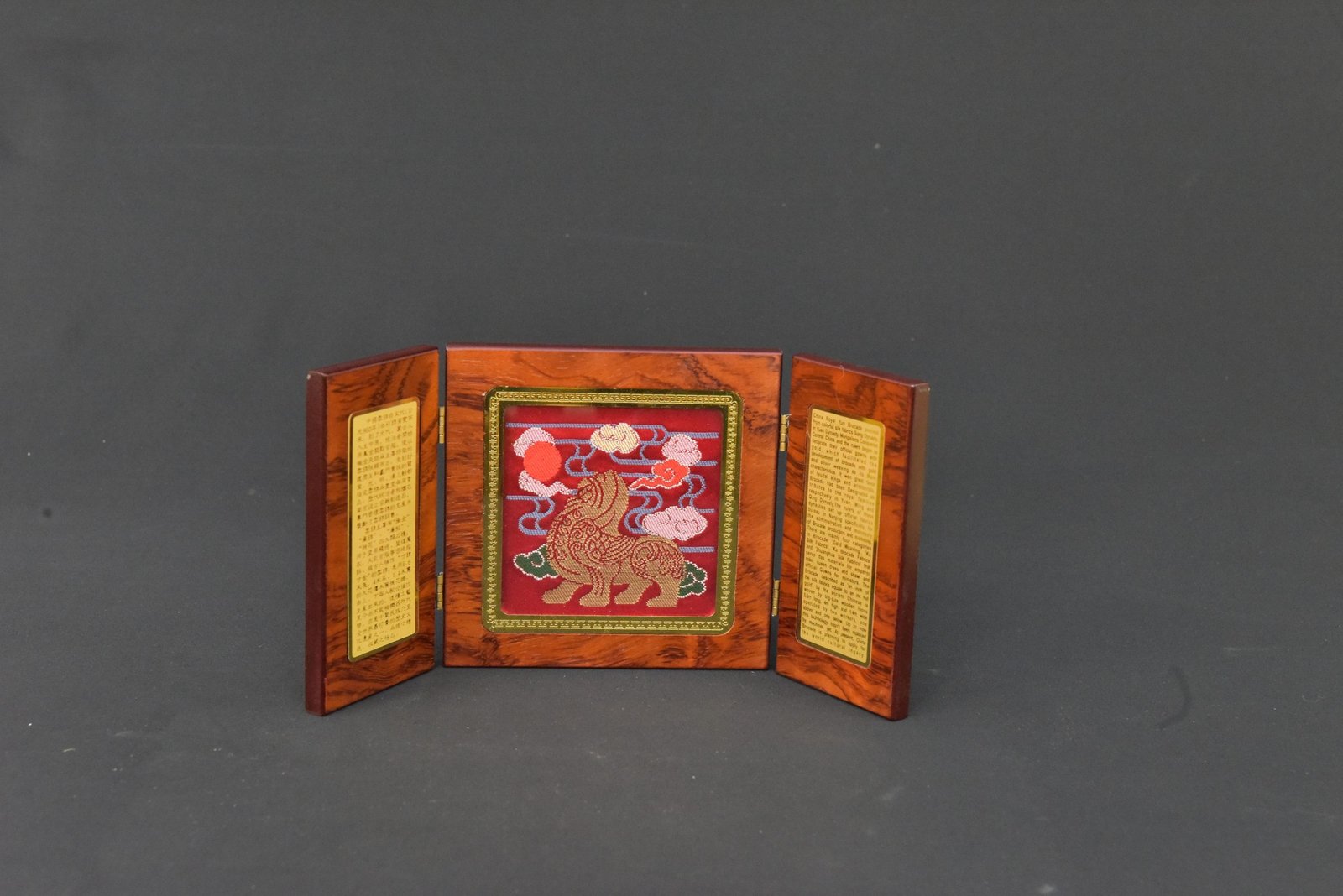 This collectible features a traditional Chinese silk embroidery artwork set within a folding wooden display case. The central embroidery depicts a mythical creature, finely detailed with colorful threads and bordered by a gold-toned frame. The hinged wooden panels open to reveal gold-plated inscriptions in Chinese, enhancing both its cultural and decorative value.