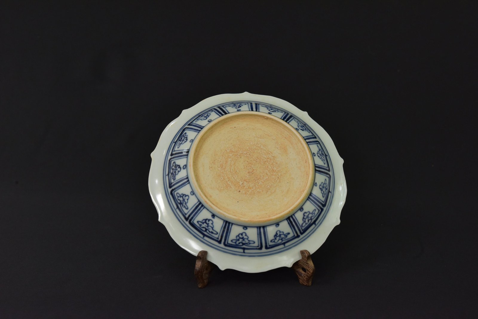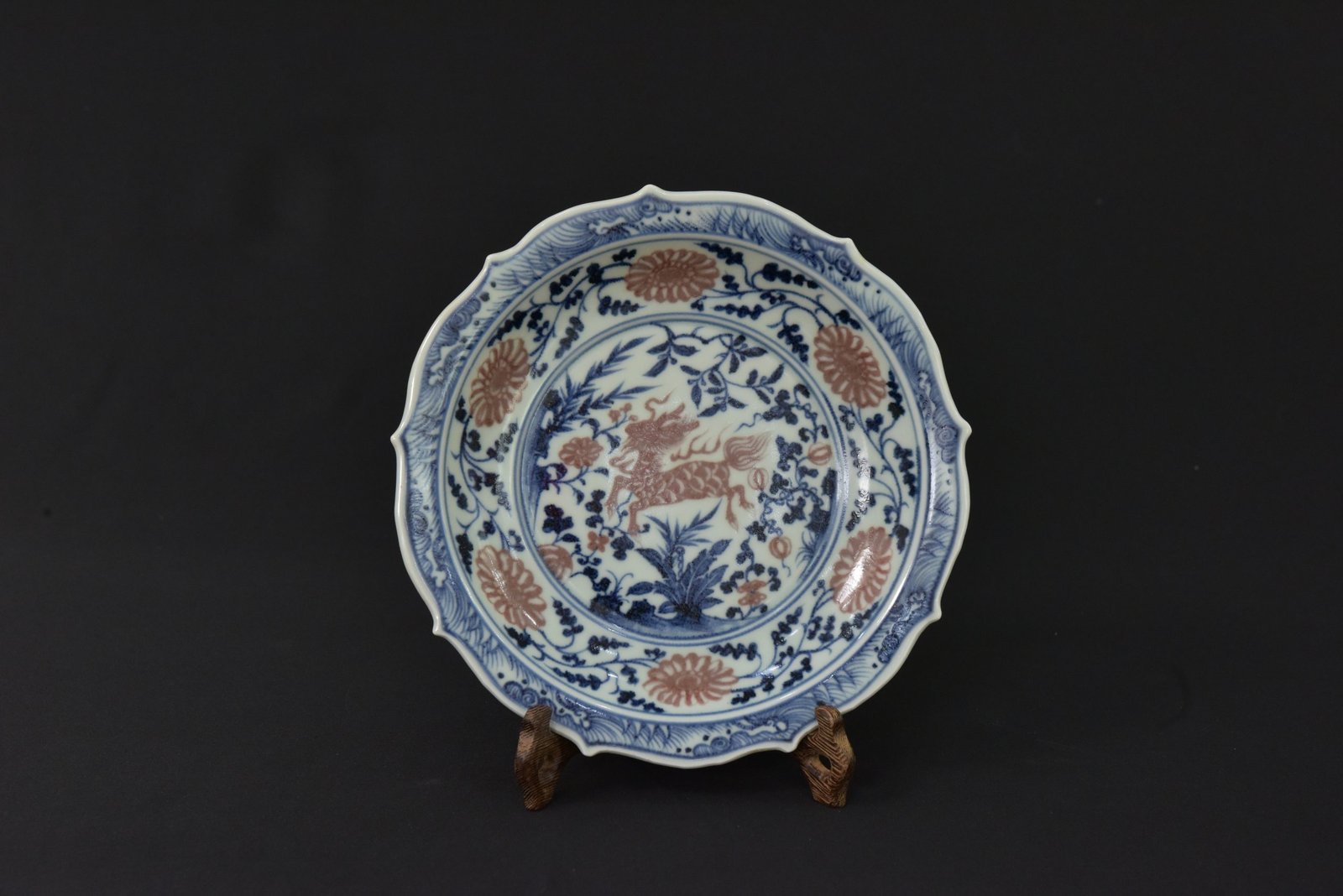 This finely decorated porcelain plate features a central depiction of a qilin, a mythical creature symbolizing prosperity and serenity, surrounded by intricate floral patterns in cobalt blue and iron-red underglaze. The scalloped rim adds elegance to the form, while the detailed botanical border enhances its visual appeal. The artistry and balanced composition make it a striking example of traditional Chinese porcelain craftsmanship.