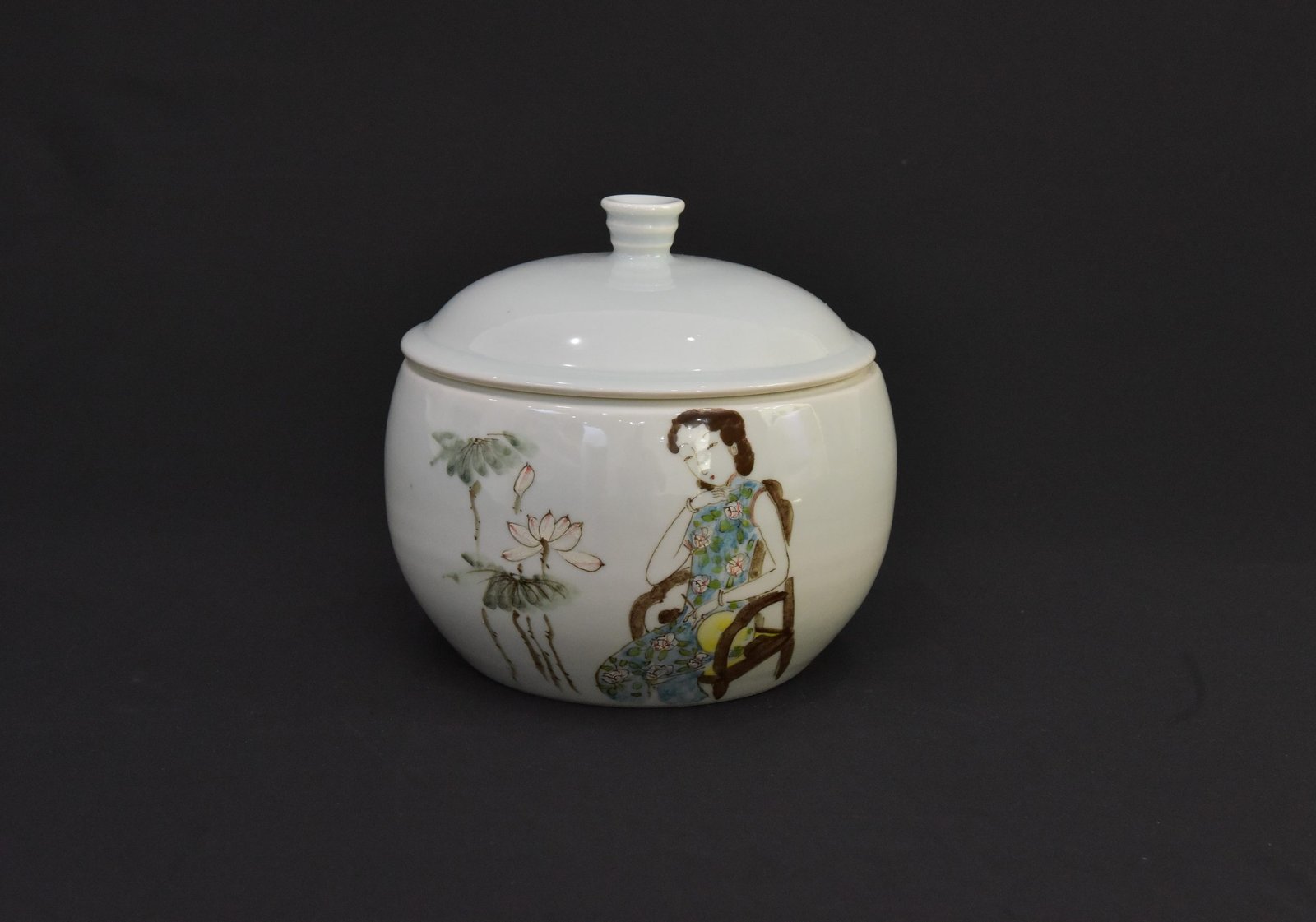 This beautifully crafted Zhong bowl features a lovely design, perfect for collectors or as a decorative piece. Made from high-quality ceramic, this bowl has an elegant pea green color and intricate detailing of a woman in a traditional Chinese dress, surrounded by lotus flowers. Its classic 1980s style adds vintage charm to any space.