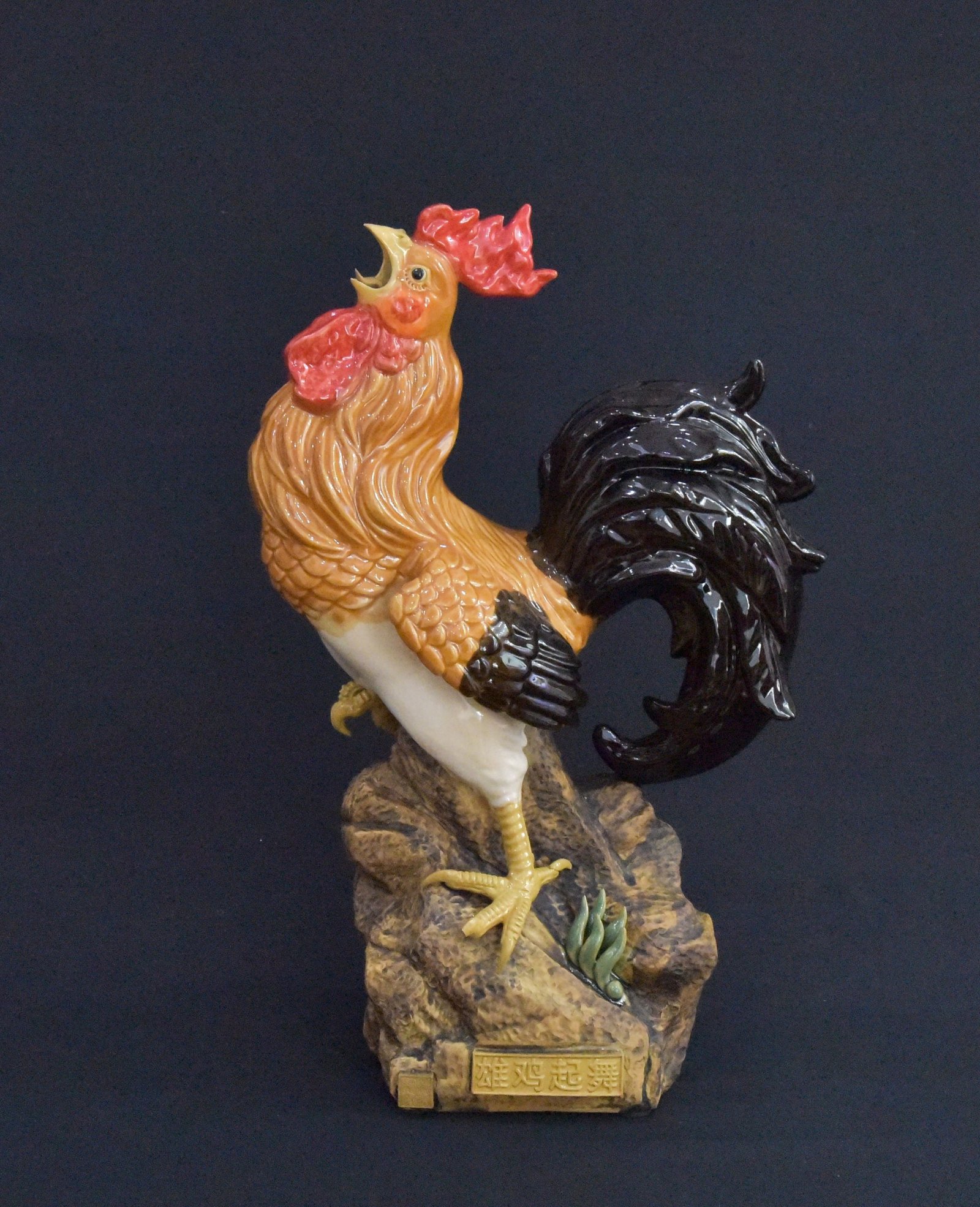 Add a bold and auspicious touch to your space with this beautifully detailed ceramic rooster figurine, dated 2000. The piece features a striking rooster standing confidently atop a textured base, showcasing vibrant colors and intricate feather detailing. A golden plaque with Chinese characters is mounted on the base, enhancing its cultural and ornamental appeal.