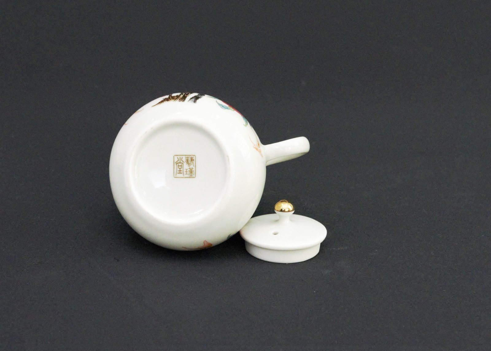This exquisite porcelain teapot is designed with longevity peach motifs, symbolizing prosperity and longevity. Its intricate, vibrant design showcases delicate hand-painted pink peaches, surrounded by lush greenery, making it a beautiful decorative piece or a functional item for any tea lover. The teapot features a gold-toned lid knob, adding a touch of elegance.