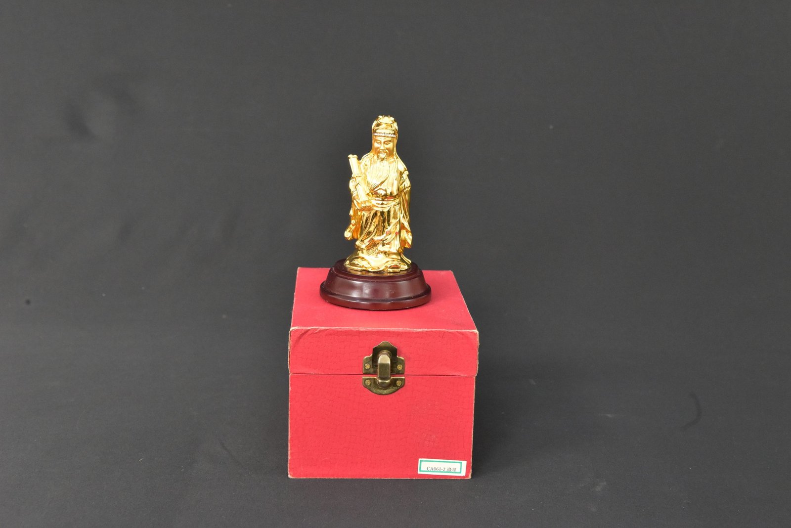 This elegant gold-plated figurine showcases fine detailing and comes mounted on a dark round base. The piece depicts a traditional figure and includes a fitted red storage/display box with a clasp closure. A distinctive collectible from the 1990s, it adds a refined touch to décor or a personal collection.