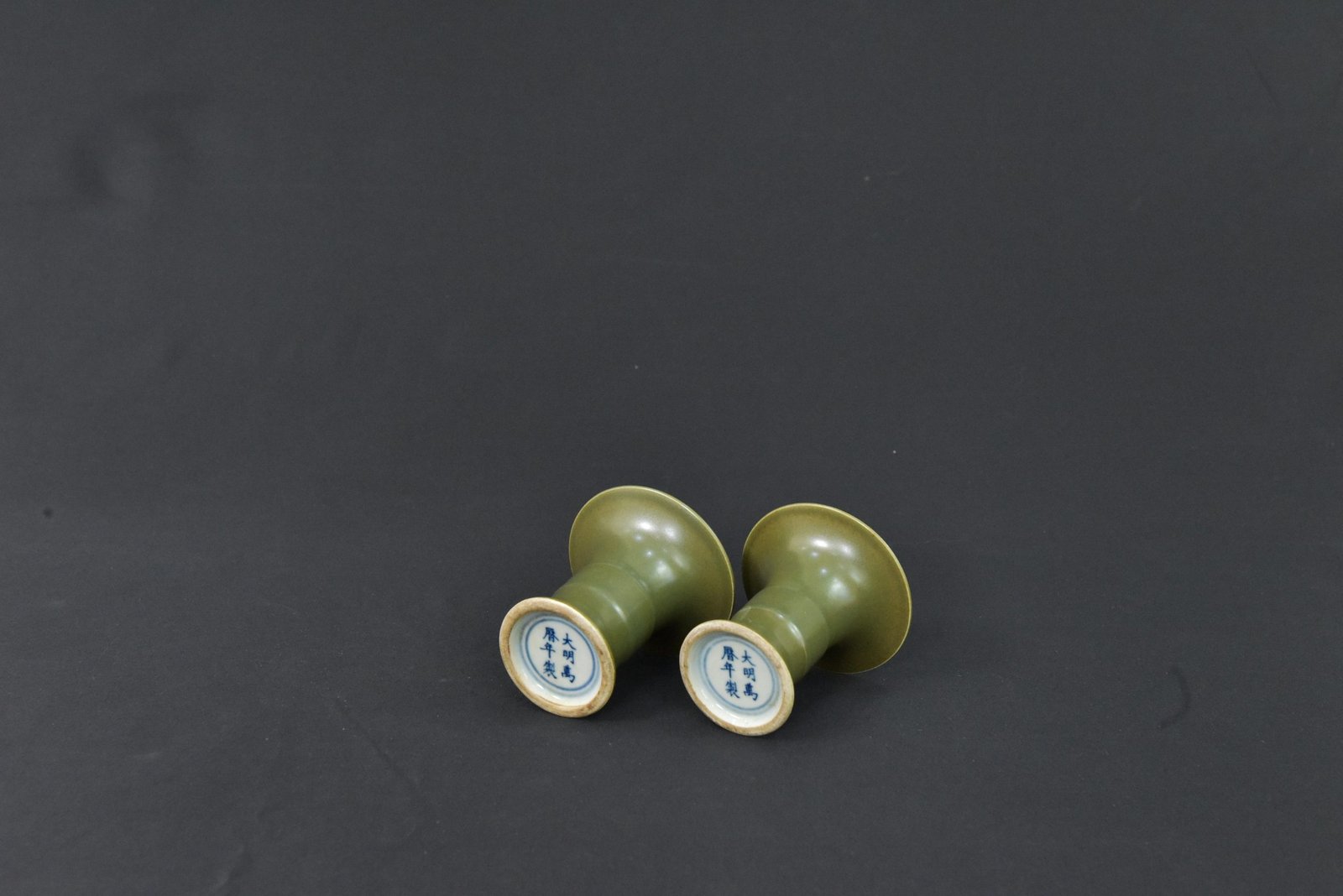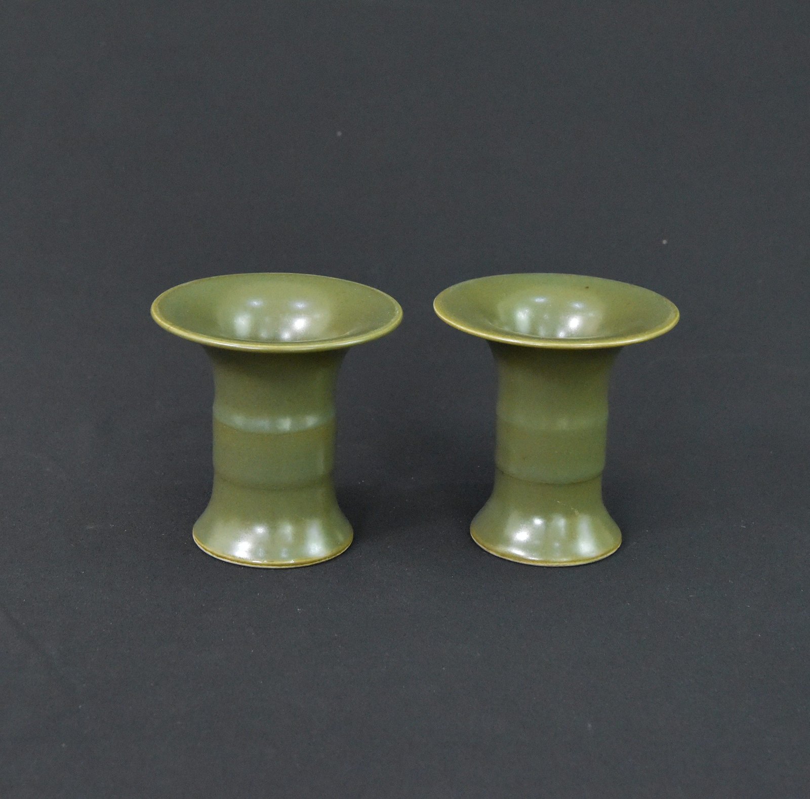 A pair of elegant green-glazed ceramic stands inspired by Qing Dynasty aesthetics. The design features a flared top and base with a smooth, continuous form, finished in a deep olive-green glaze with subtle sheen. These pieces embody traditional Chinese decorative artistry and can serve as distinctive display accents or functional supports for small objects.