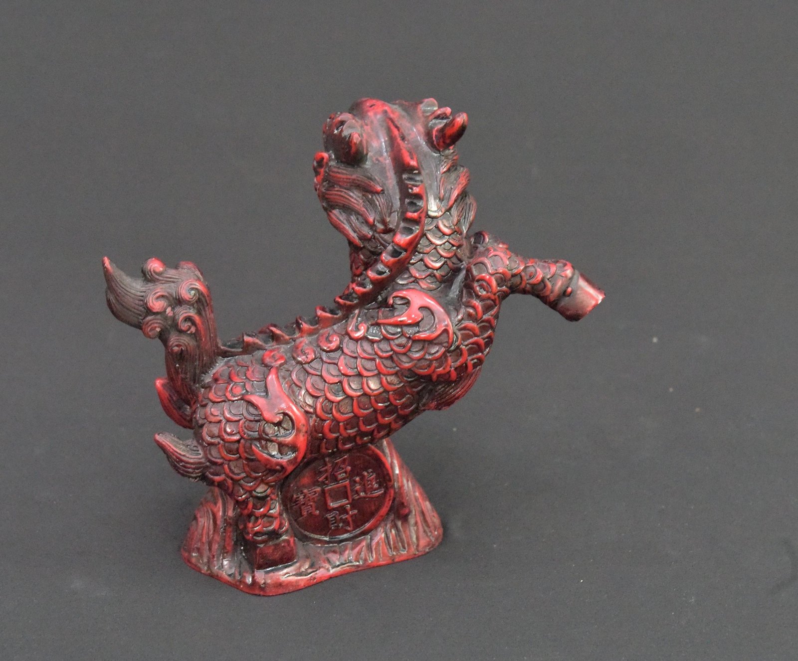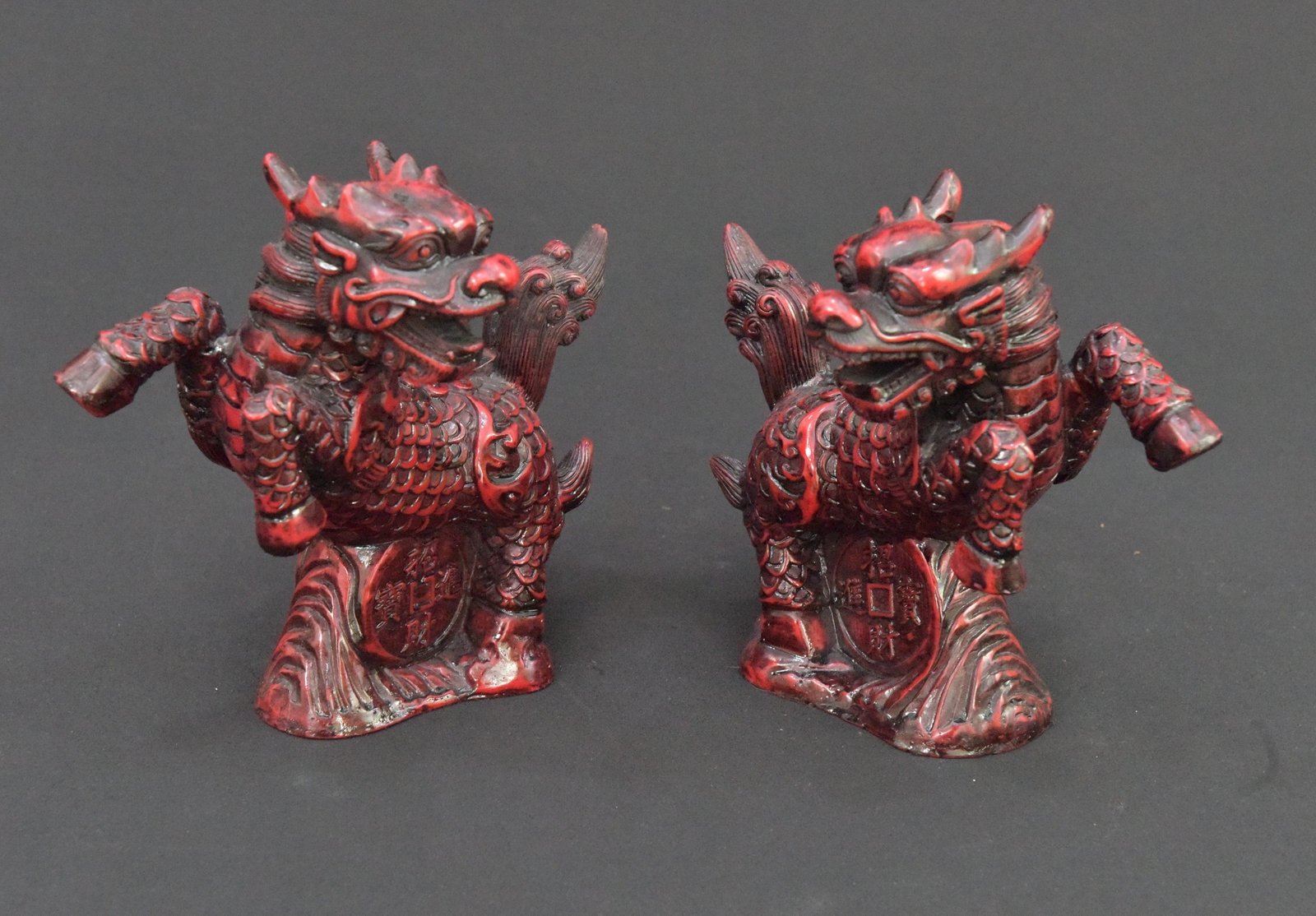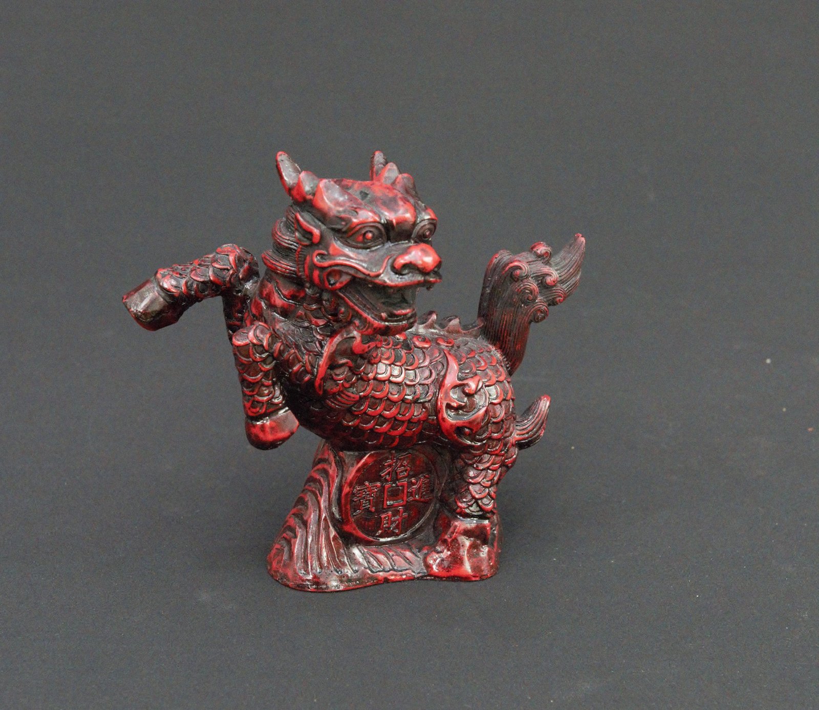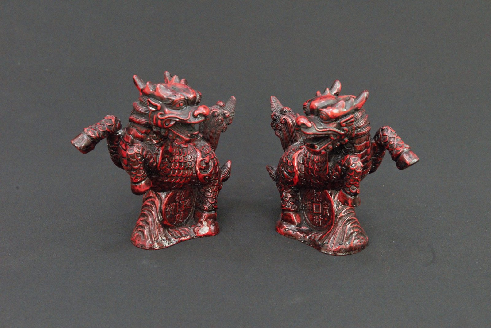Dating back to the 1990s, these figurines are crafted from resin with a rich, deep red finish accented with darker details, giving them a classic and distinguished look. Each Qi Lin is dynamically posed, showcasing intricate carvings that highlight their dragon-like heads, majestic manes, and strong, hooved bodies.