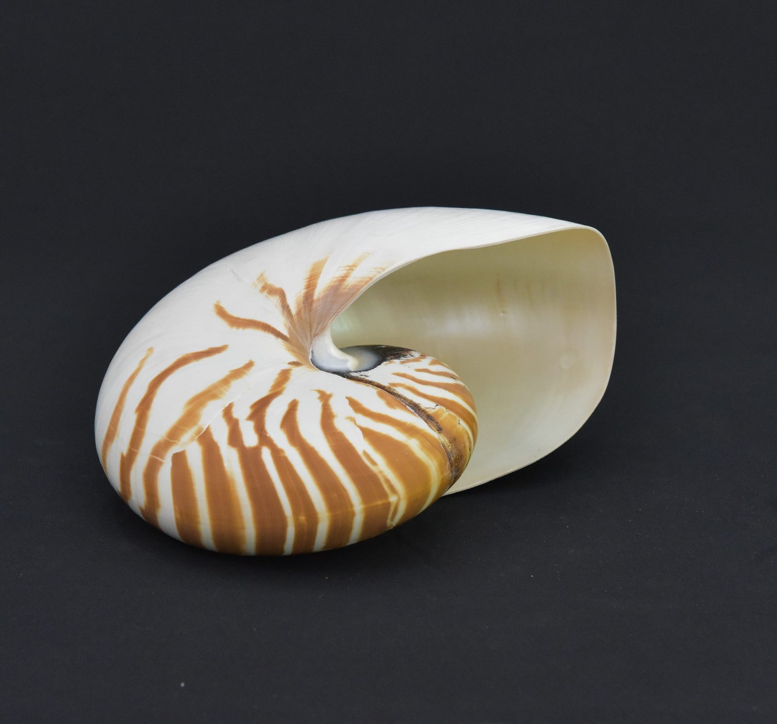 This striking nautilus shell features a smooth, polished surface showcasing its iconic natural spiral and rich brown striping on a creamy white background. The interior reveals a lustrous pearlescent finish, enhancing its organic elegance. Ideal for collectors, home décor, or marine-themed displays, this shell exemplifies the symmetry and beauty of nature’s design.