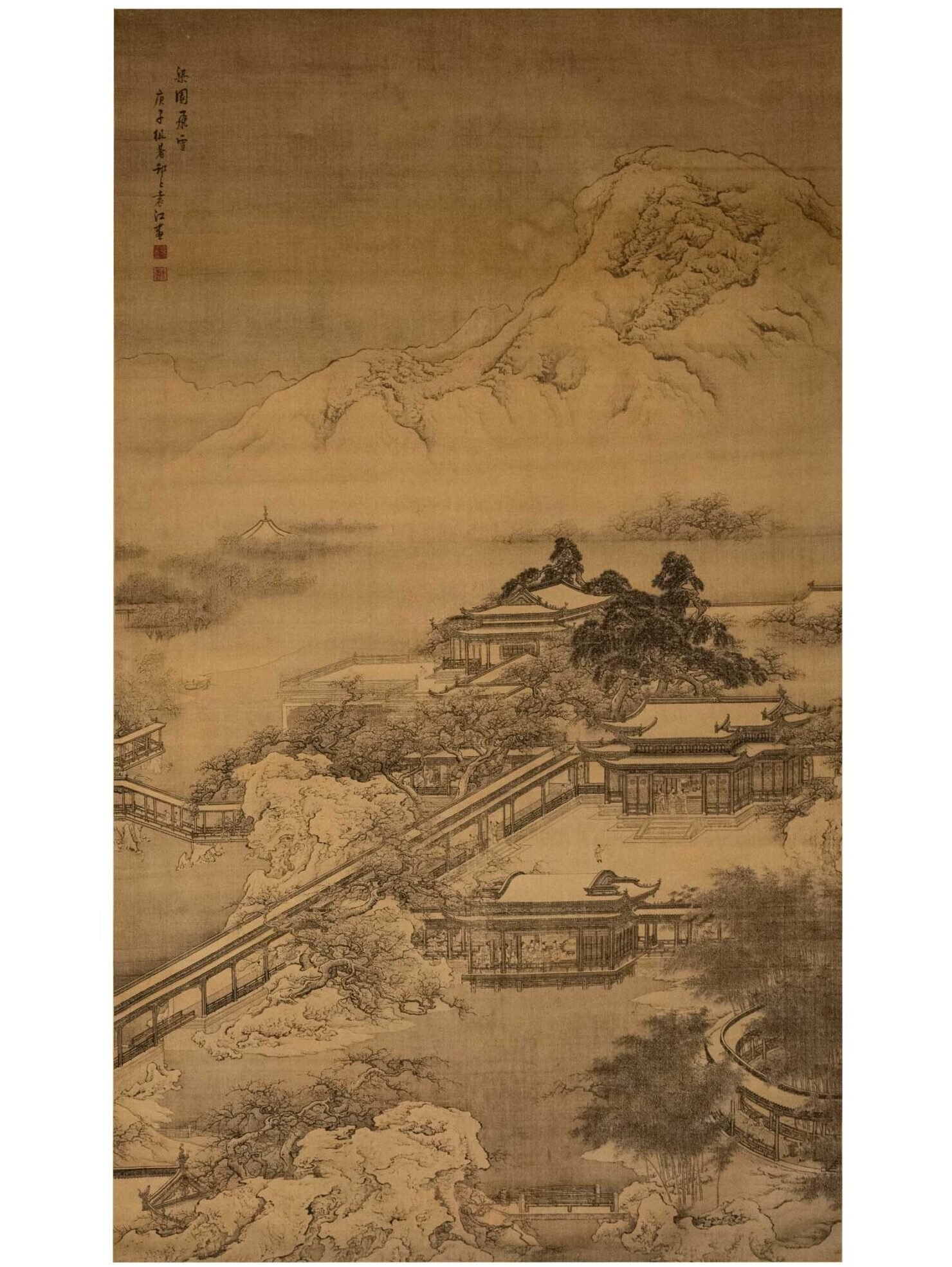 The attention to detail and vibrant hues in this artwork reflects the Qing Dynasty’s appreciation for refined aesthetics and architectural finesse. Each element, from the gracefully arched bridges to the verdant foliage, embodies the dynasty’s pursuit of artistic perfection.