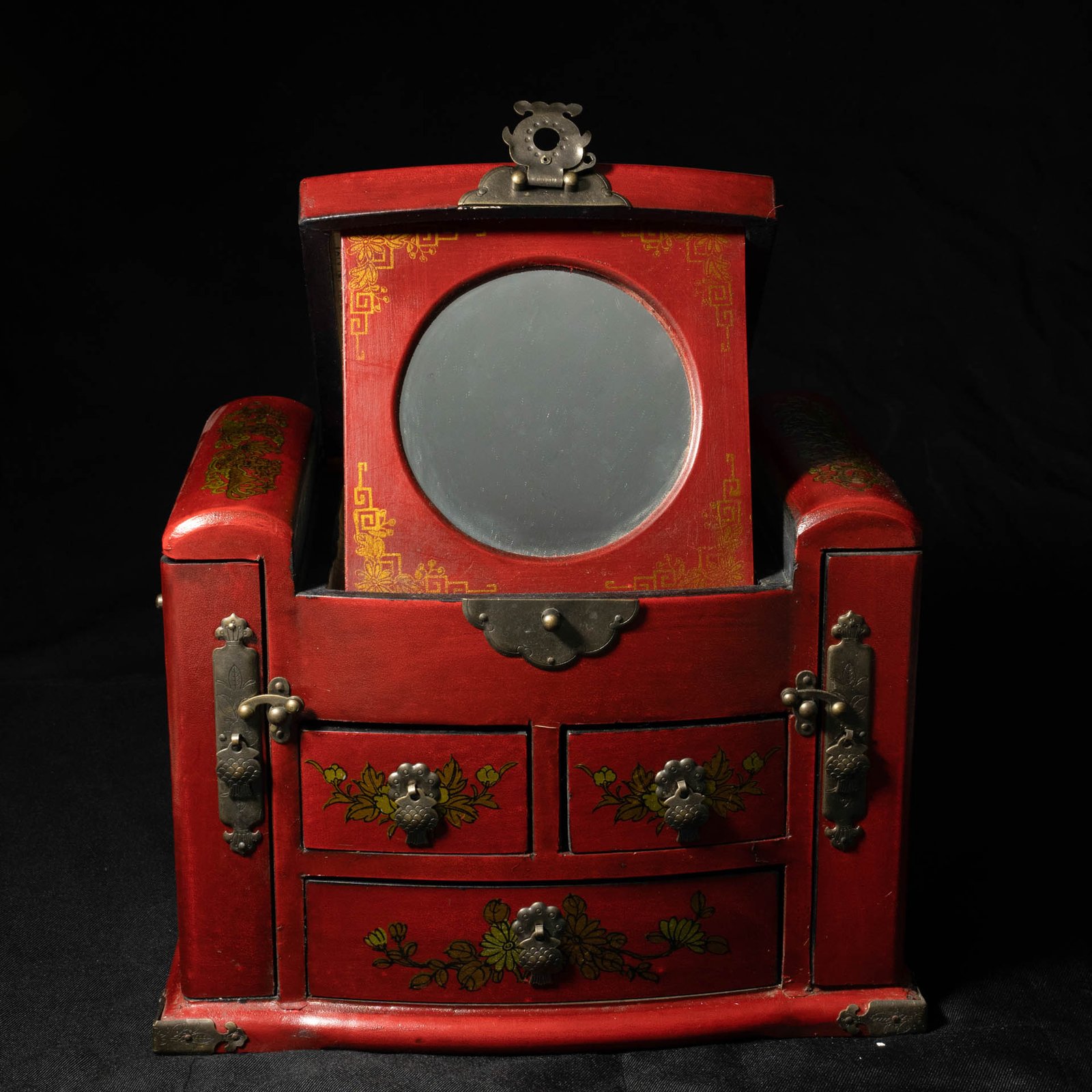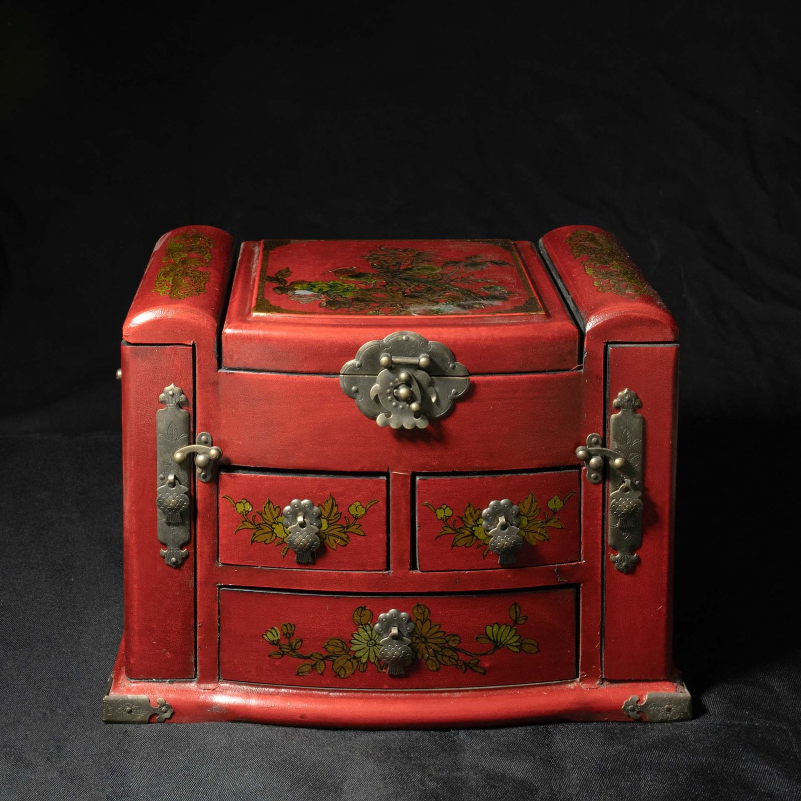 This chest is constructed from painted paulownia wood (tong mu / 桐木). Paulownia trees were often planted at the birth of a daughter and were considered symbols of prosperity, fertility & marital bliss. Upon reaching maturity the tree would be crafted into furniture and given as part of a bride’s dowry symbolising hope for a prosperous & enduring marriage.