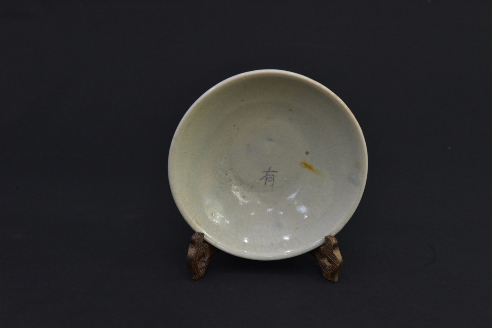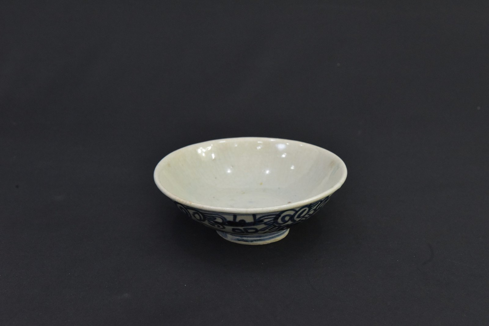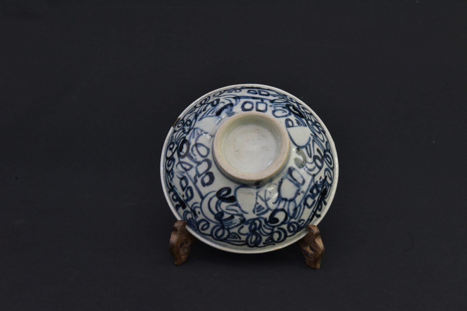 This vintage ceramic bowl features intricate blue designs over a white glaze, reflecting a traditional decorative style. The base shows a classic foot ring and the artwork displays a continuous swirling motif, making it a distinctive display or collection piece.