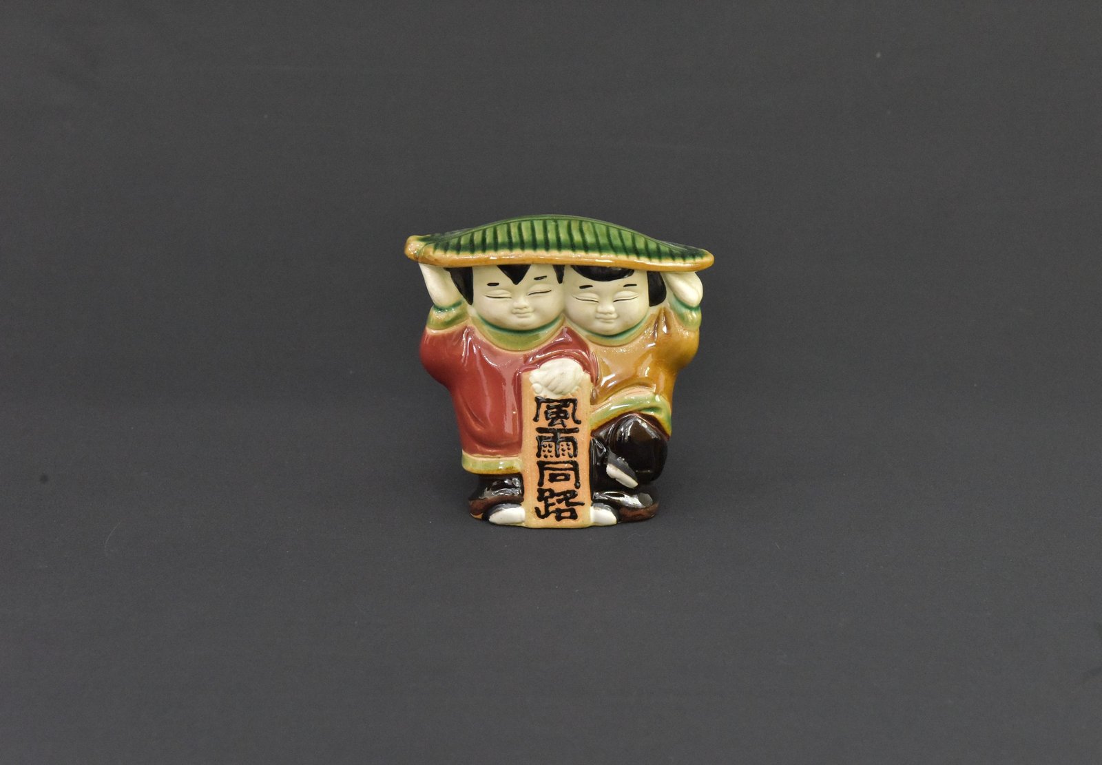 This unique vintage ceramic figurine from the early 1960s features two children standing closely together under a shared leaf-shaped hat. Rendered in a distinctly Japanese artistic style, the piece carries the Chinese phrase “風雨同路” on the sign they hold, which translates to “Together Through Wind and Rain” — symbolizing unity, loyalty, and resilience through hardship.