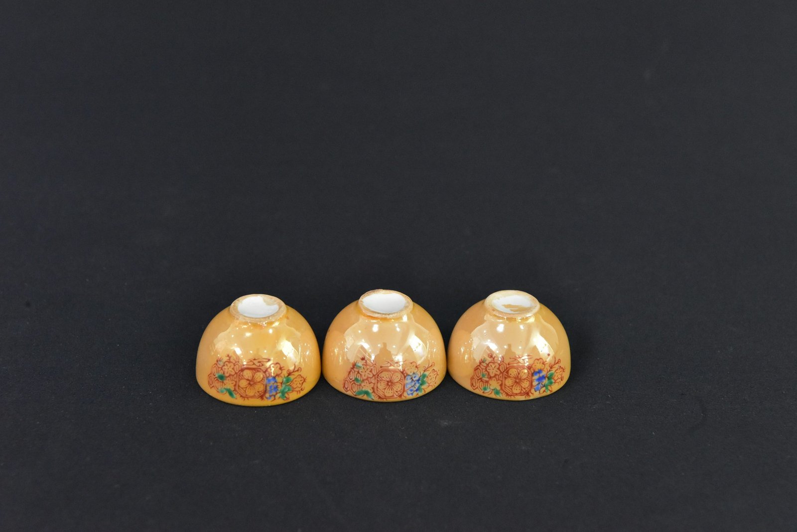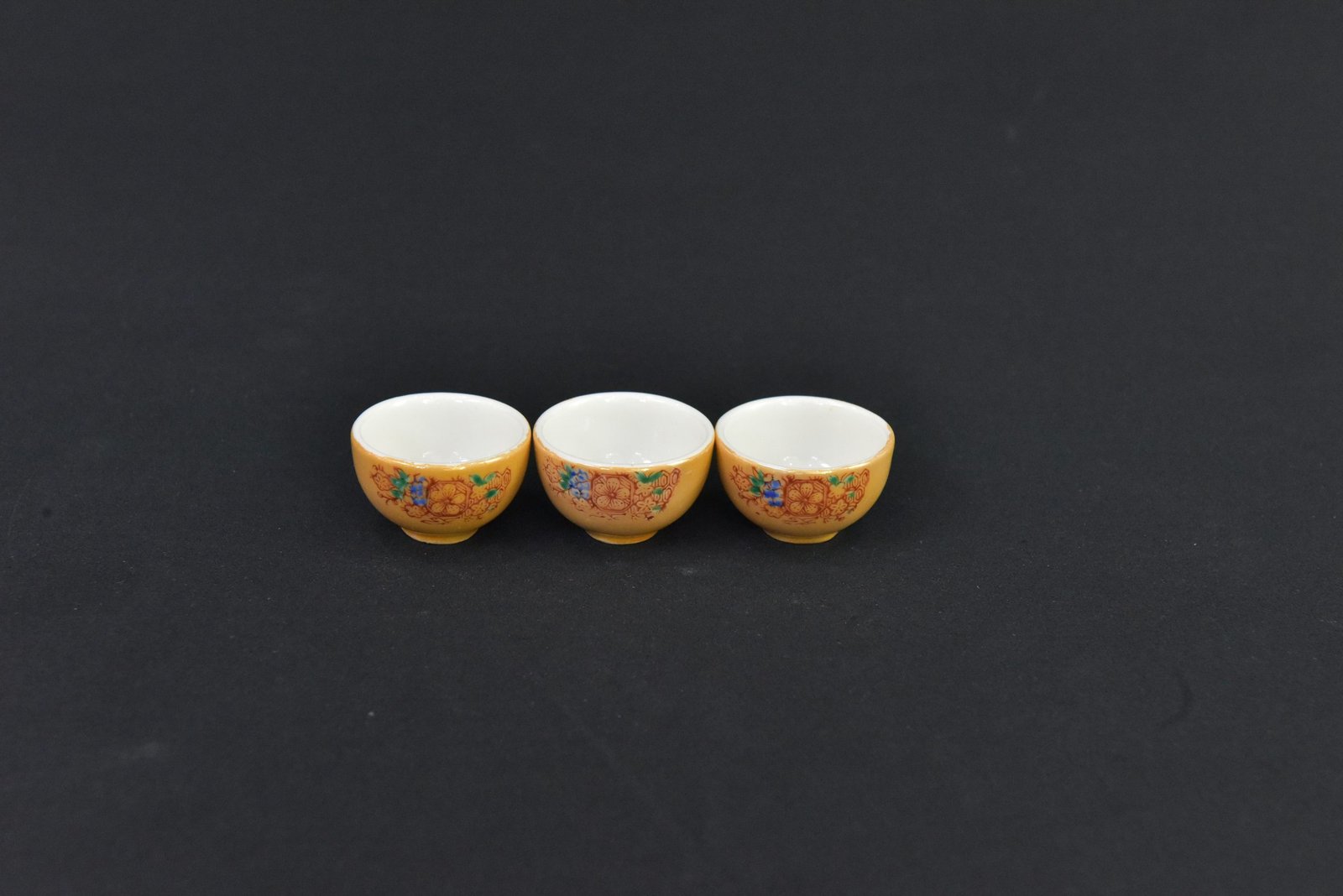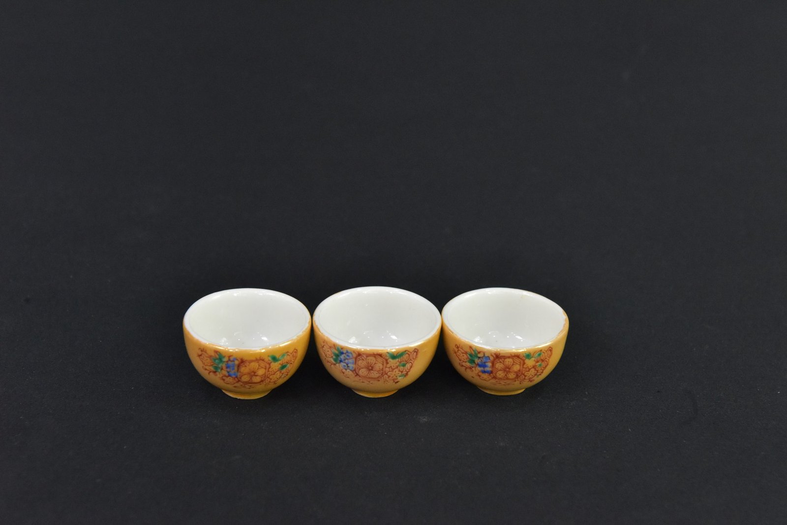 Charming set of three miniature porcelain tea cups featuring a vivid yellow background adorned with intricate floral patterns in red, blue, and green. The interior is finished in smooth white porcelain, creating a striking contrast with the ornate exterior. These petite cups showcase fine craftsmanship and a timeless mid-century aesthetic, ideal for collectors of vintage tableware or decorative miniatures.