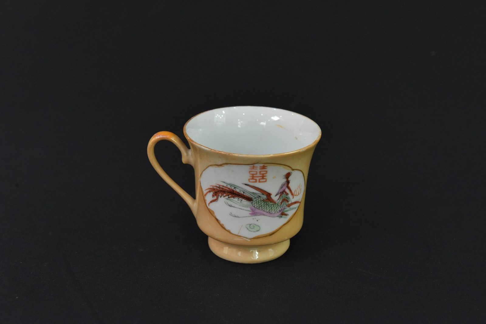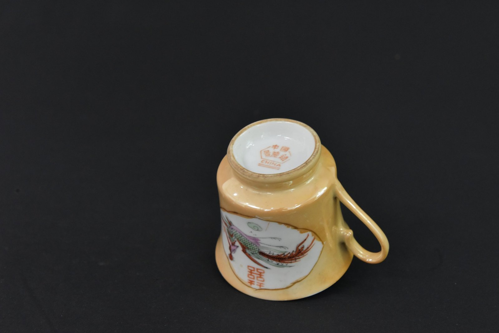 Elegant porcelain tea cup featuring a golden-yellow exterior with a detailed red dragon design and traditional Chinese characters. The inside is a smooth white glaze, contrasting beautifully with the ornate outer artwork. Its gently flared rim and curved handle add to the refined silhouette, making it a perfect piece for display or collection.