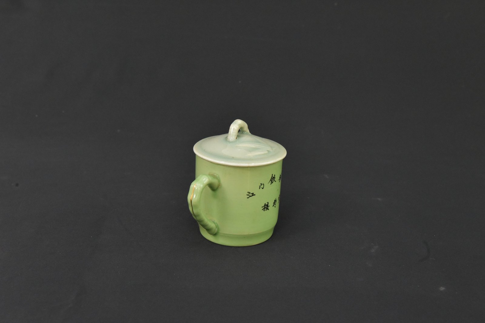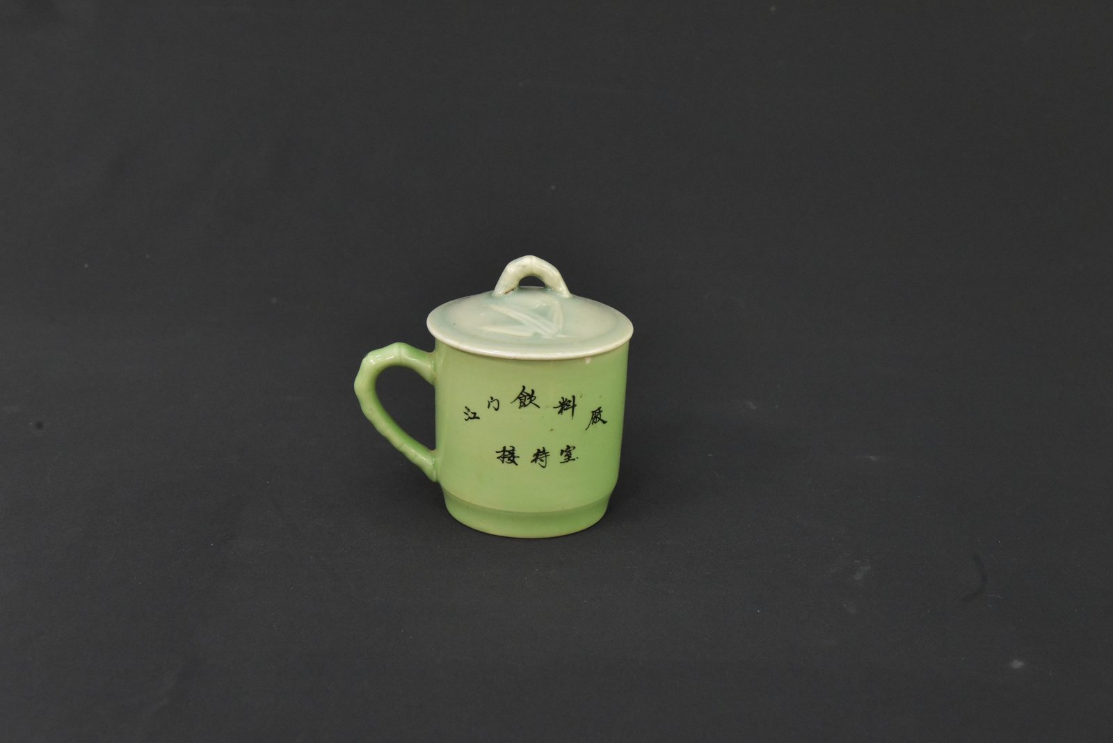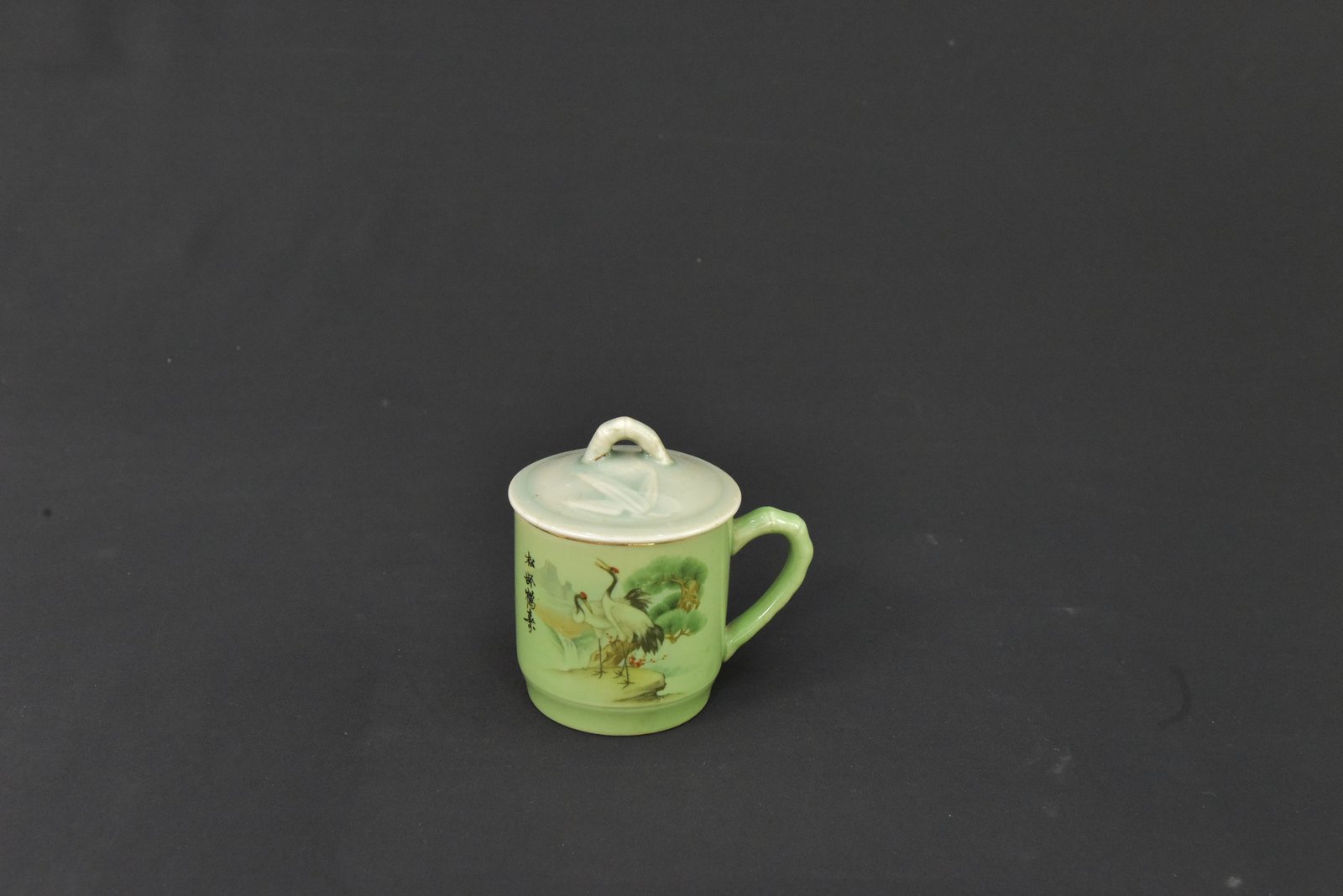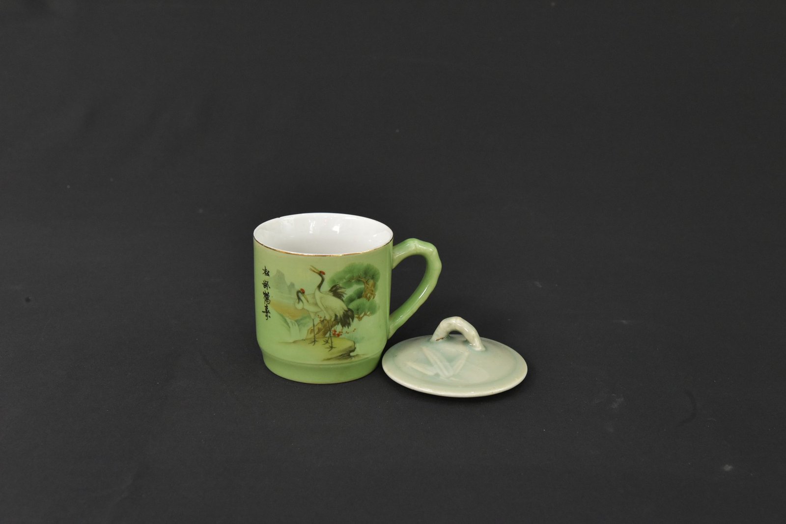 This vintage porcelain mug with lid from the 1970s features a beautiful green glaze with a detailed crane and nature design, accented by traditional Chinese script. The handle is styled with a naturalistic bamboo-like form, and the lid includes a looped handle for easy use.