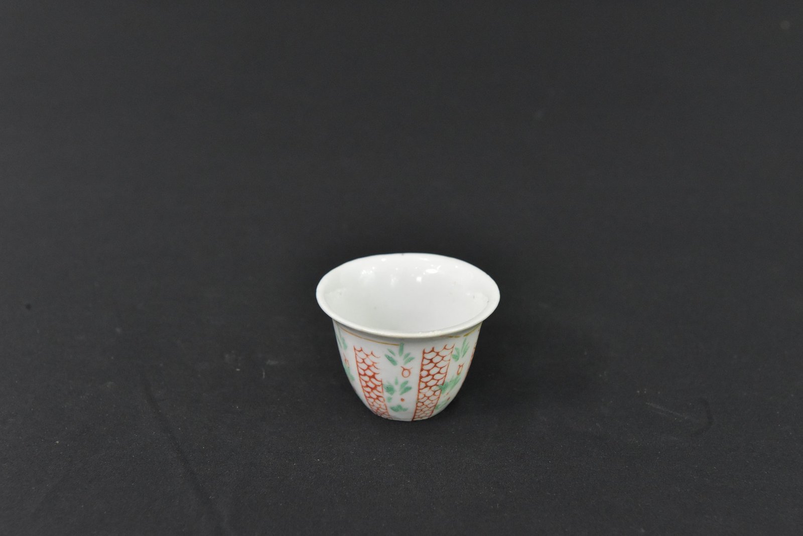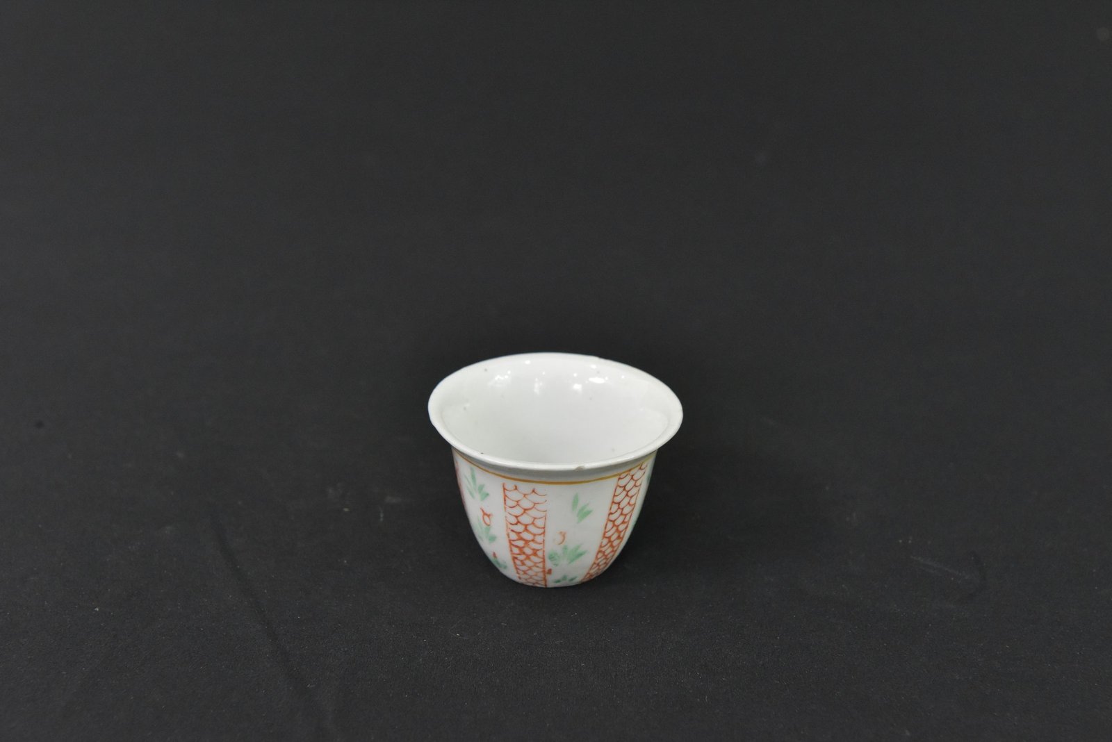 Charming vintage porcelain cup featuring an intricate red scale motif with delicate green floral accents. The flared rim and fine detailing reflect classic mid-century decorative style, making it an appealing piece for collectors or as a unique display item.