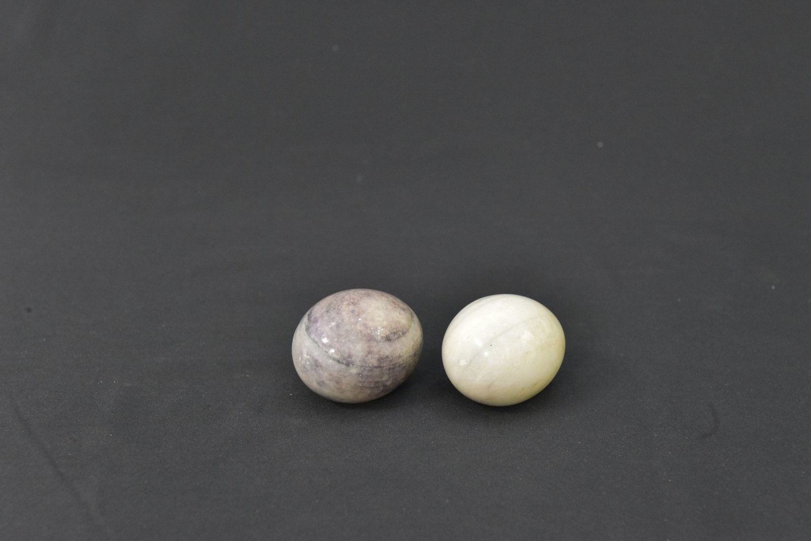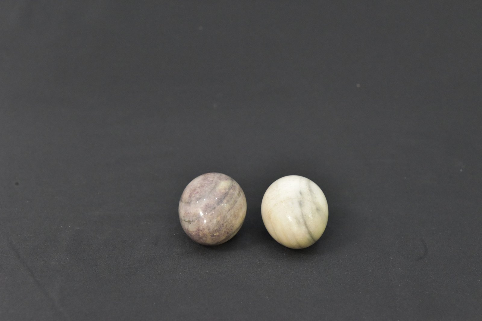 This pair of vintage Baoding balls, originating from the 1980s, is crafted from polished natural stone. Each ball features unique natural color variations and veining patterns, making them visually appealing as well as functional. Traditionally used for hand exercise, stress relief, and meditation, Baoding balls are rotated in the hand to improve dexterity, strengthen muscles, and promote relaxation.