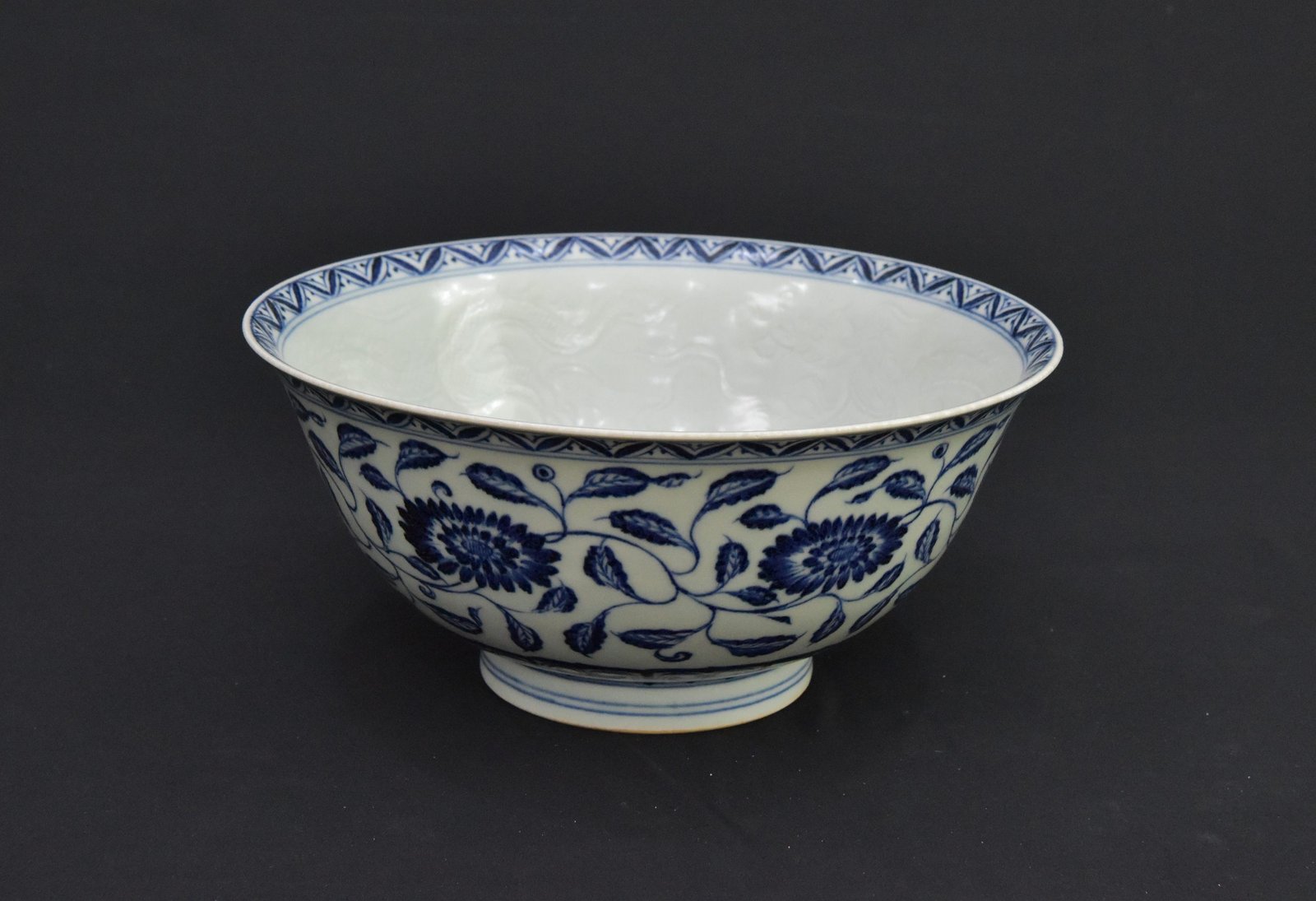 Vintage 1980s Blue and White Porcelain Bowl – Lotus Scroll & Incised Dragon Design | 仿大明宣德 青花瓷大碗