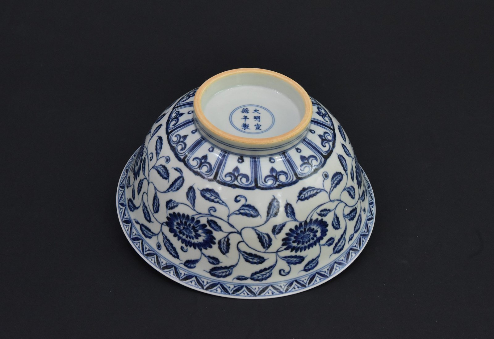 This striking blue and white porcelain bowl features a classic design inspired by the Ming Dynasty Xuande style (仿大明宣德). Decorated with intricate underglaze blue lotus scroll patterns (缠枝莲), the exterior showcases rich floral motifs, while the interior subtly reveals a beautifully incised dragon (暗刻龙纹), adding depth and historical elegance.