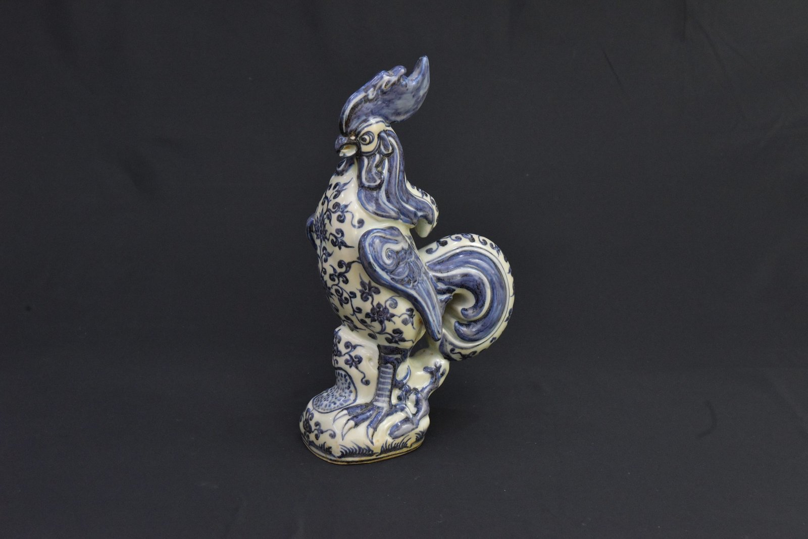 This striking porcelain rooster figurine is a beautiful representation of one of the twelve animals in the Chinese zodiac. Crafted in the classic blue and white pottery style, it showcases intricate floral patterns and elegant detailing throughout. Dating back to the 1980s, this piece embodies traditional charm and cultural symbolism, making it an ideal collectible or decorative centerpiece.