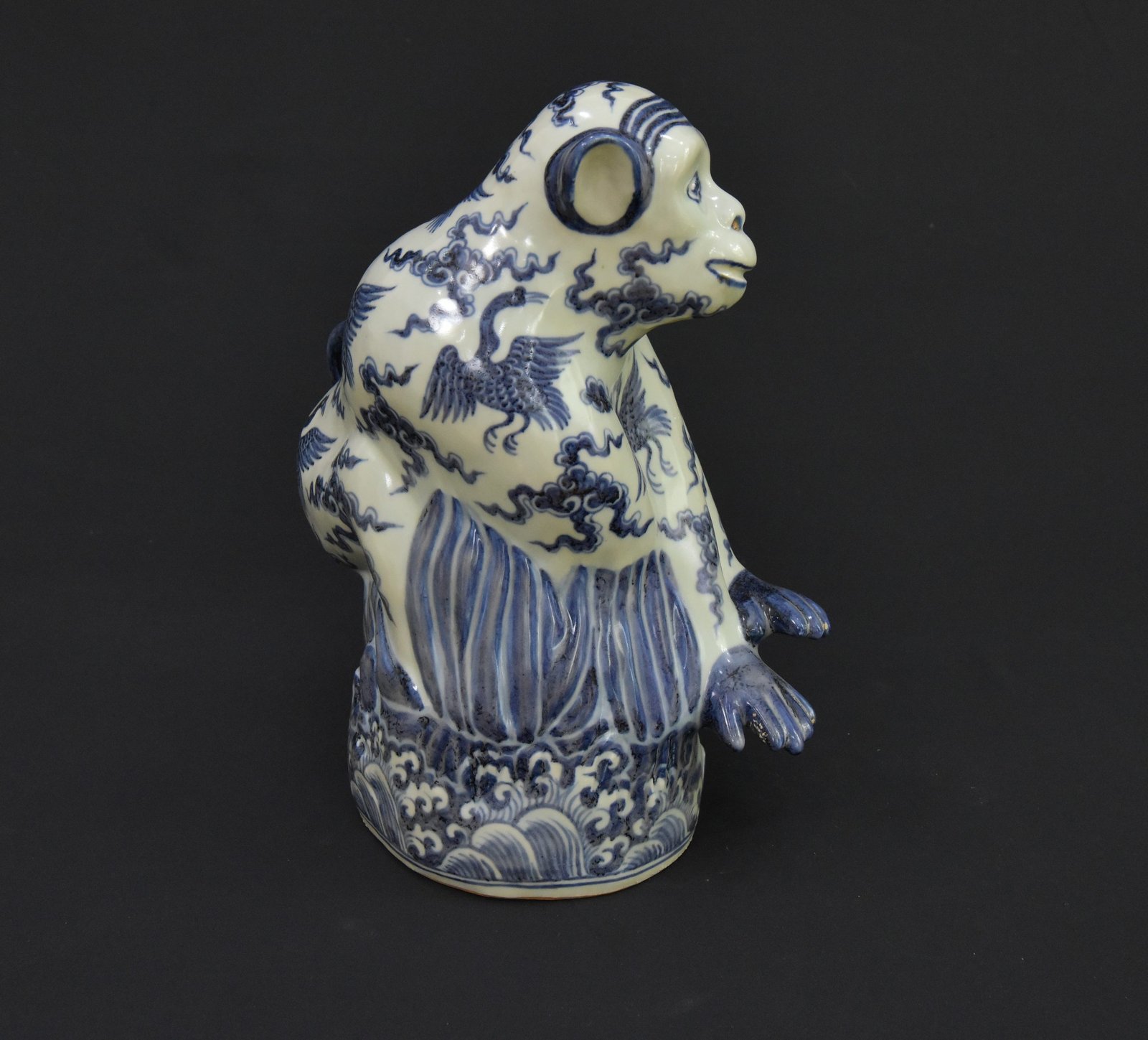 This striking blue and white ceramic figurine represents the Monkey from the Chinese Zodiac and dates to the 1980s. Expertly crafted with intricate patterns featuring cranes and clouds, the piece showcases traditional Chinese design elements in a bold yet elegant form. The monkey is seated atop a textured base, giving the sculpture a sense of grounded presence and visual interest from all angles.