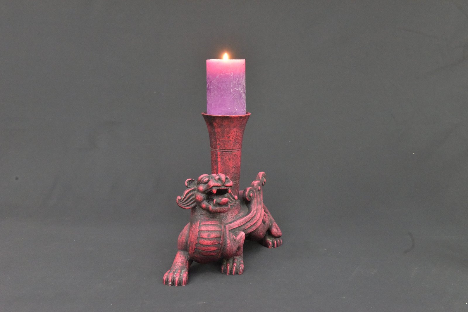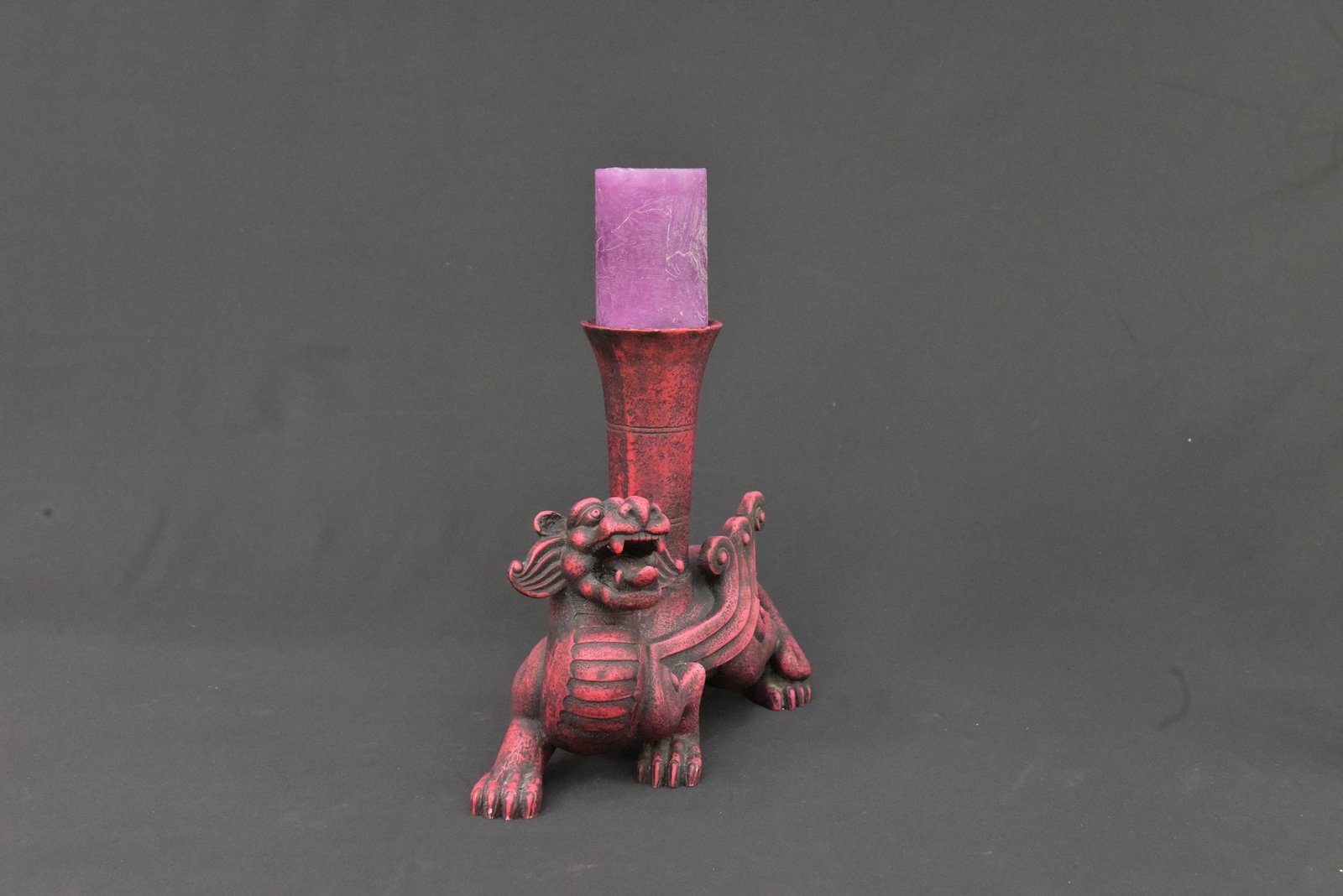 “Vintage 1990s Clay Dragon Candle Holder with Purple Pillar Candle