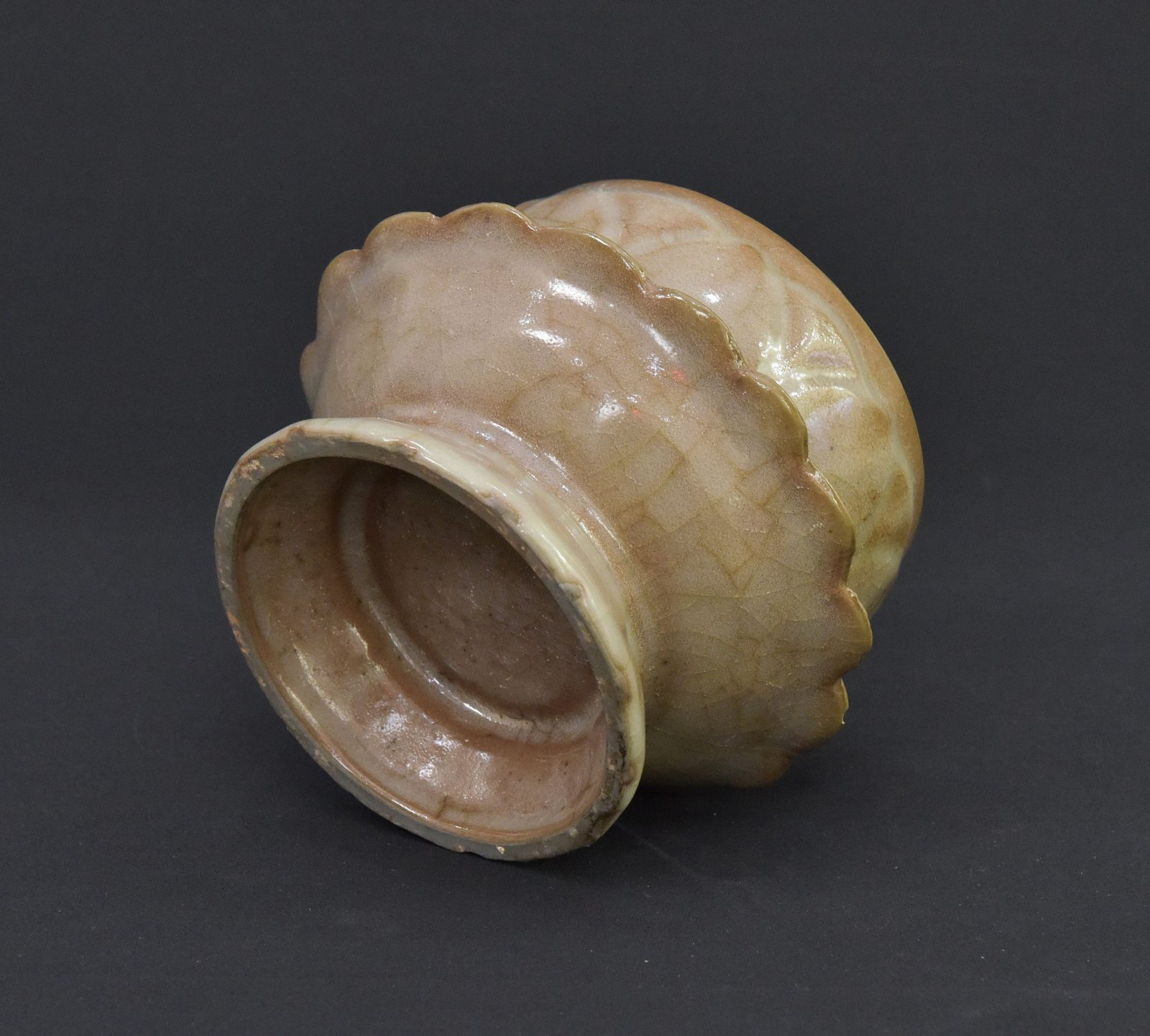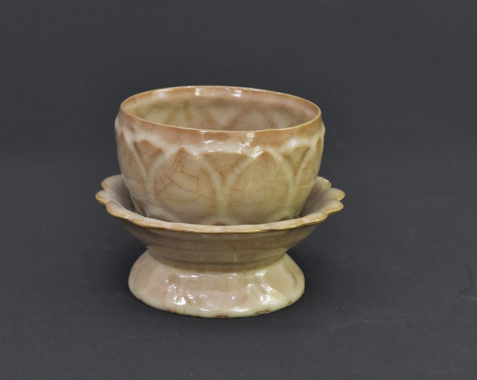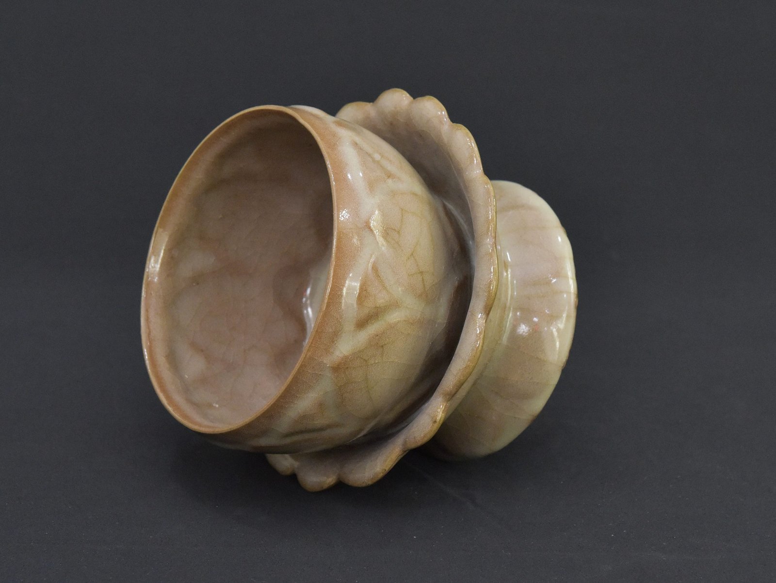 This distinctive bowl features a lotus-inspired design and is set on an elegant pedestal base. Crafted in the 1990s, it reflects traditional aesthetics commonly associated with ceremonial or ritual use. The piece showcases a warm, earthy glaze with natural crackle patterns that enhance its vintage character. The lotus motif around the bowl’s exterior adds symbolic and artistic value, making it an appealing item for collectors or those interested in spiritual or cultural artifacts.