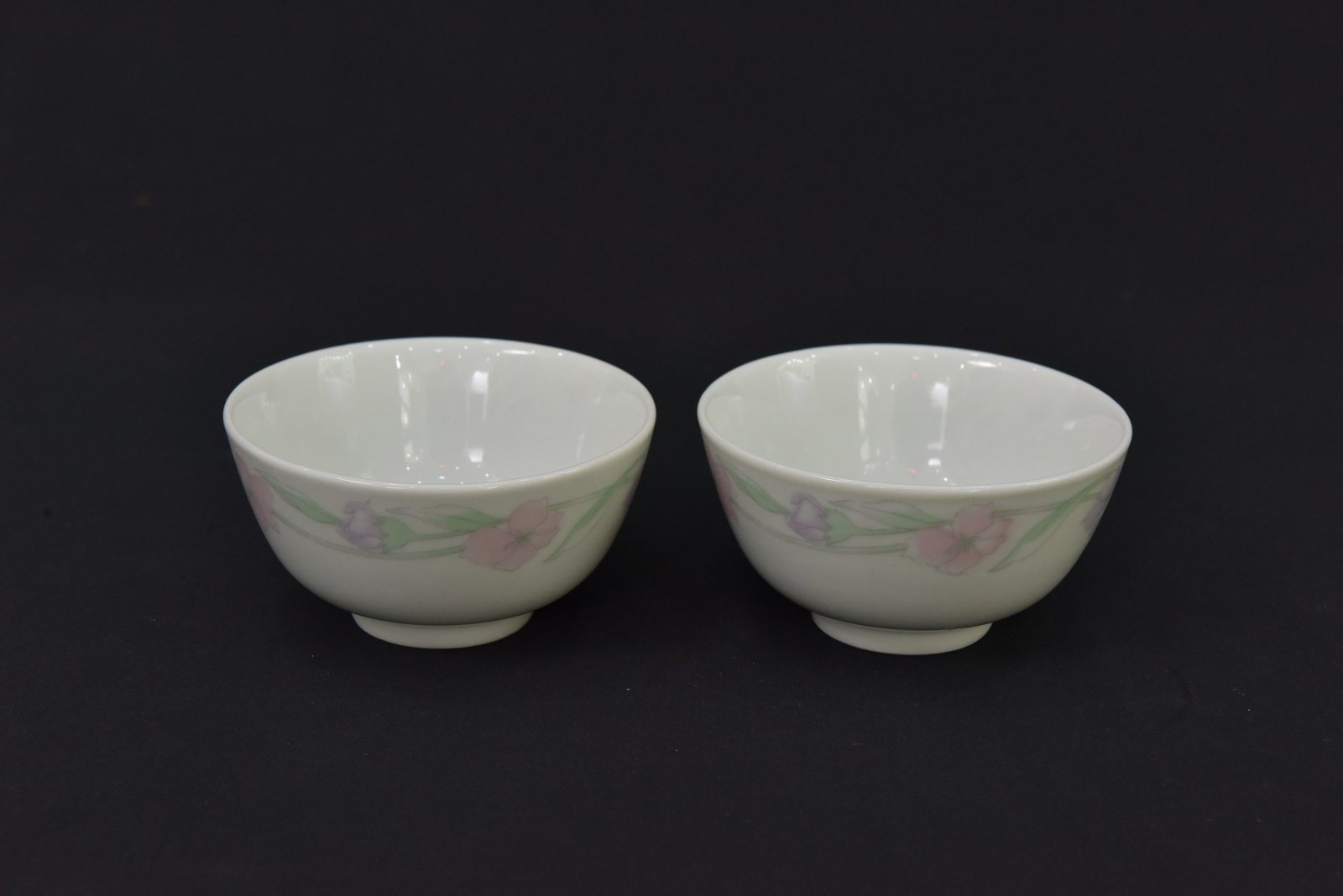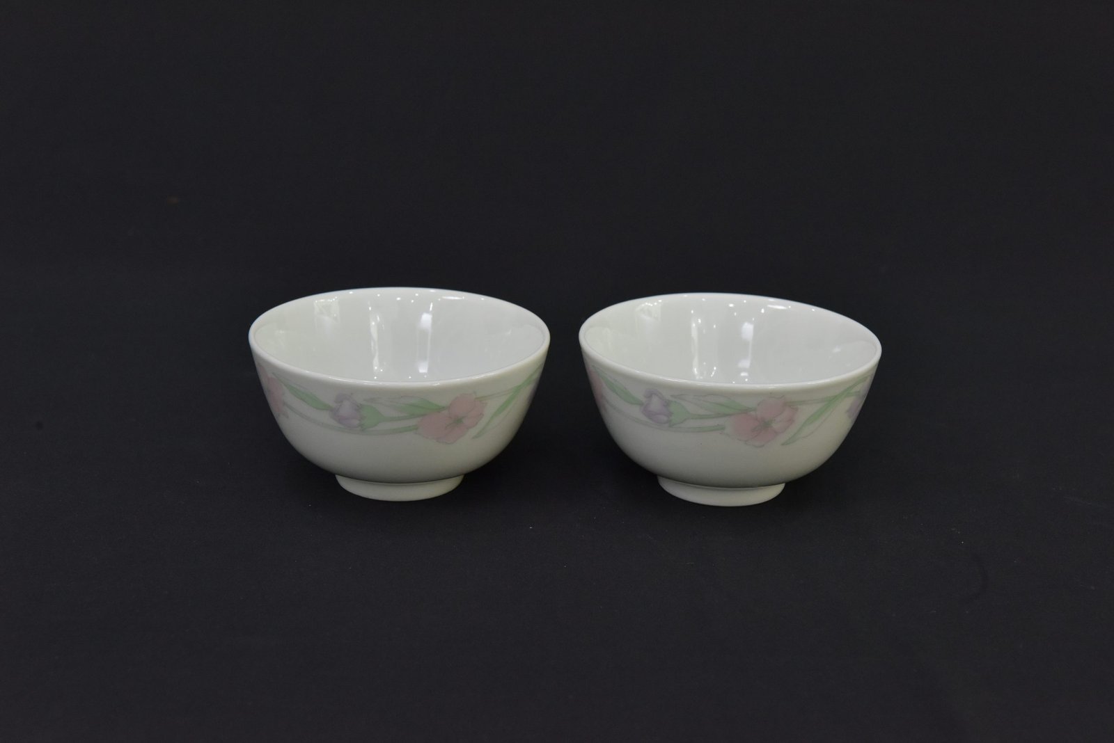 Elegant set of two porcelain bowls featuring a soft pastel floral motif with green leaves and light pink flowers. The smooth white glaze and gentle curves make them perfect for serving rice, soup, desserts, or for display as part of a vintage kitchen collection.