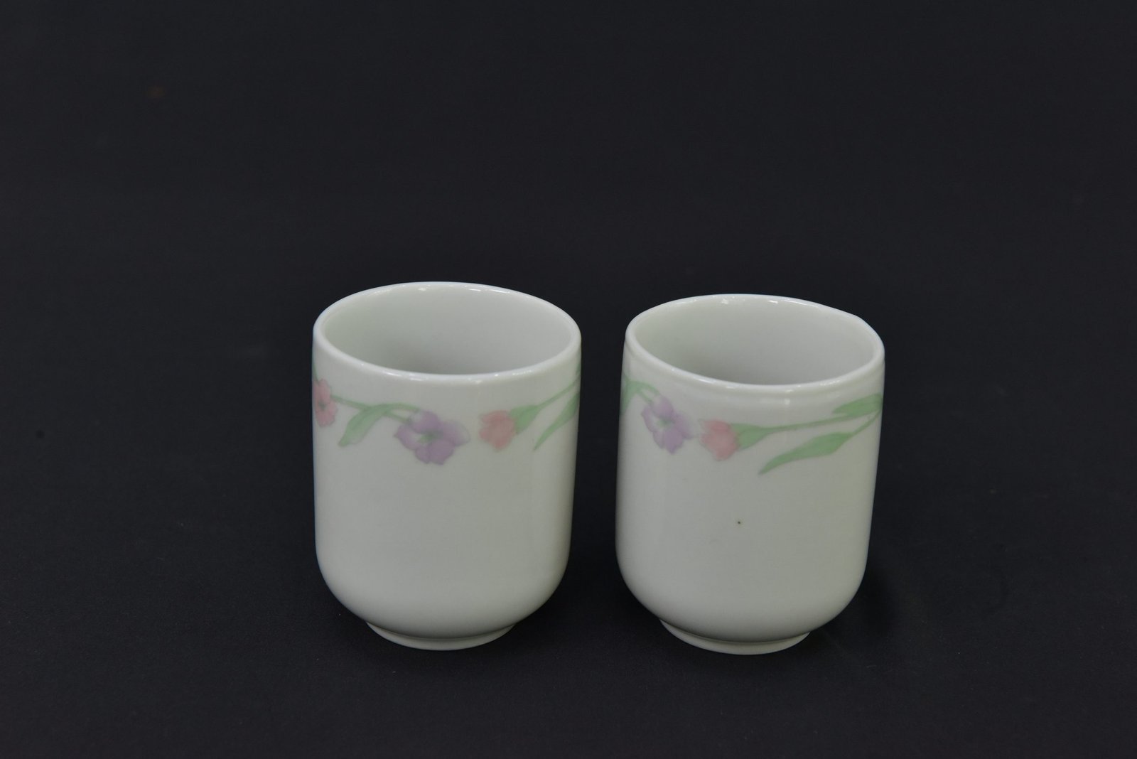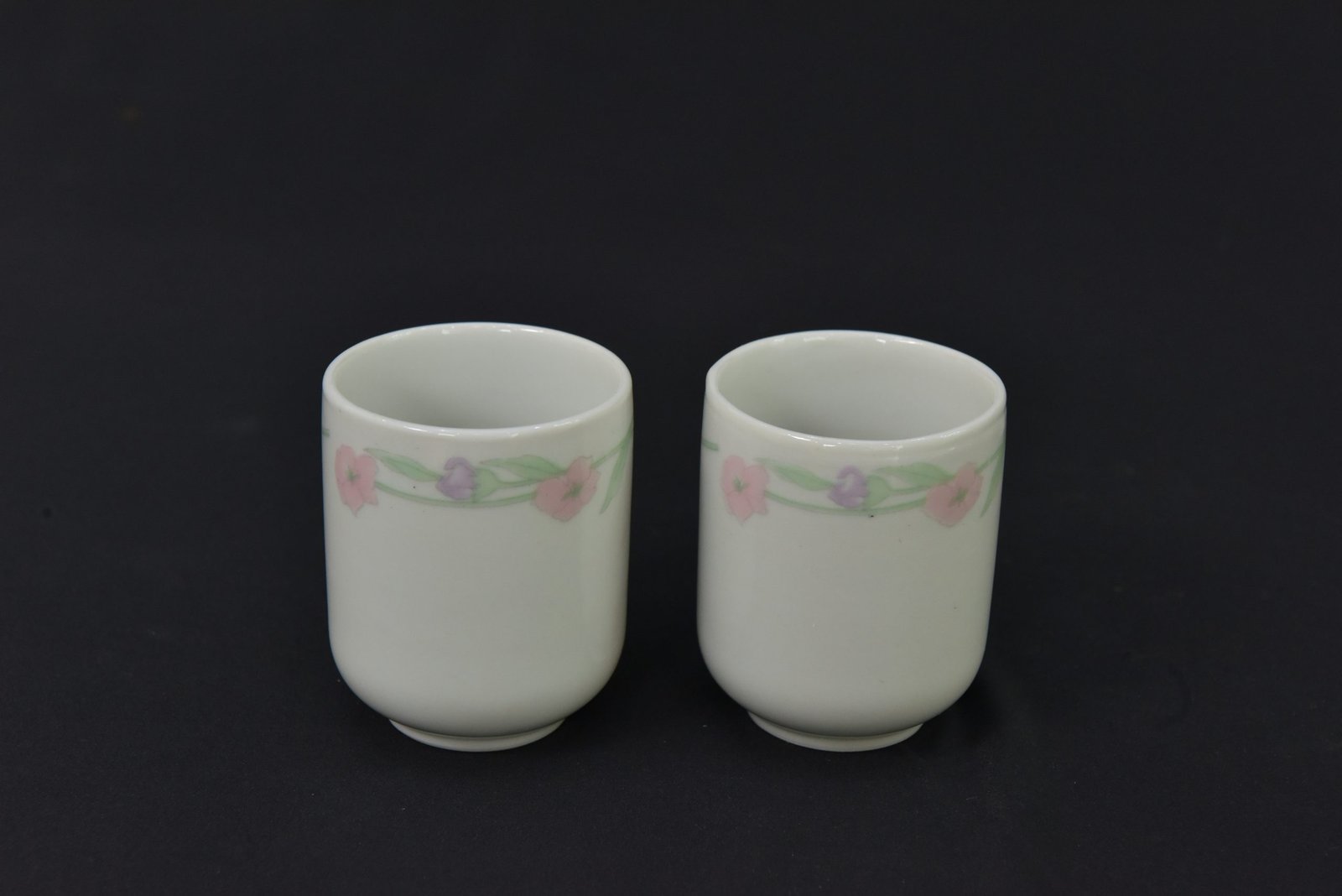 Add a touch of nostalgic elegance to your tea collection with this charming set of two porcelain tea cups from the 1990s. Featuring a delicate pastel floral garland in soft pink and lavender tones with green leaf detailing, these cups are perfect for collectors or those who appreciate vintage kitchenware with a subtle, graceful design.