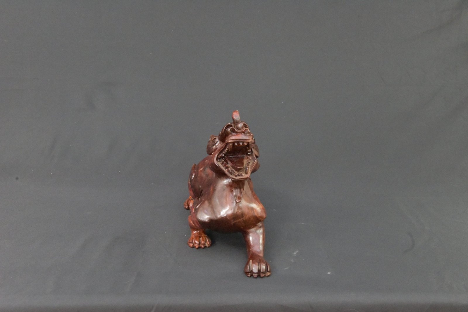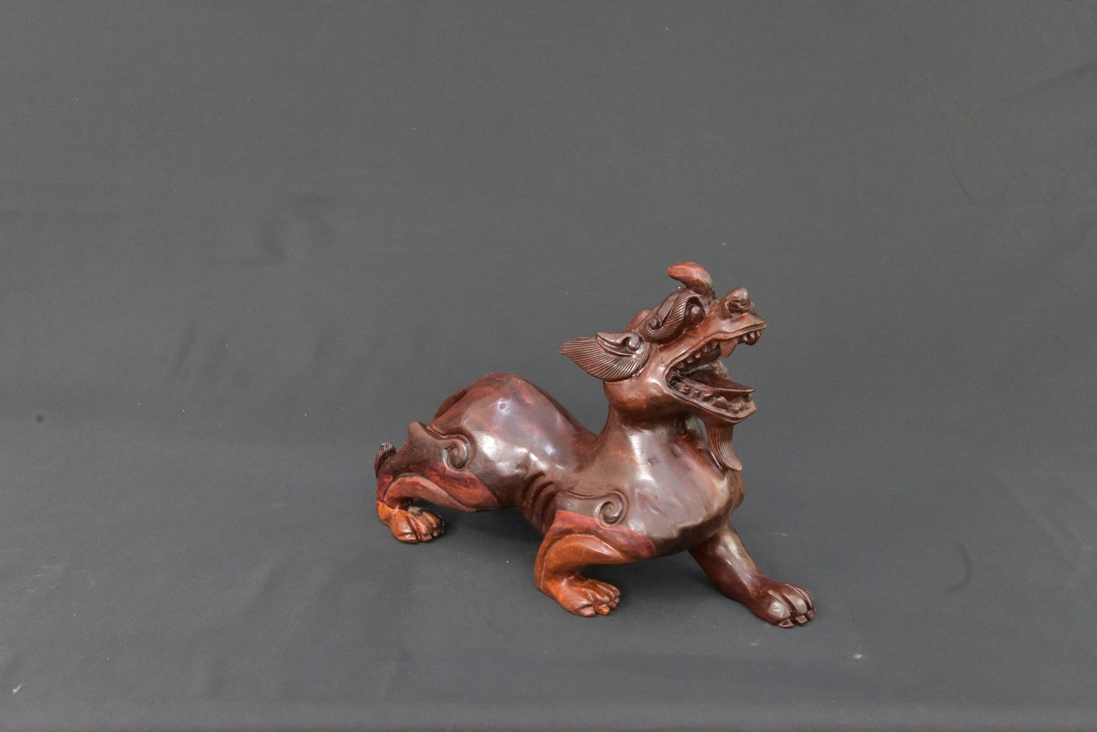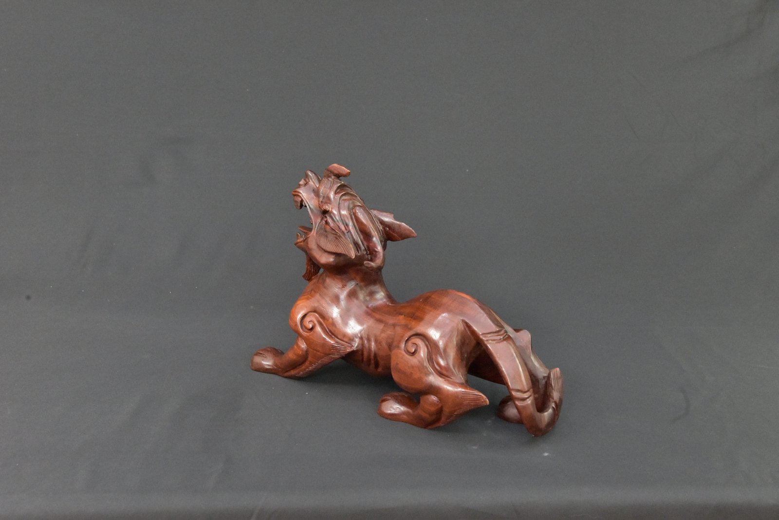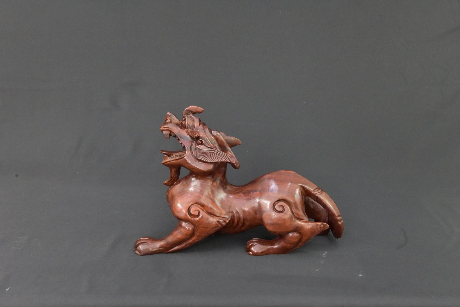 A striking wooden sculpture depicting a mythical beast, intricately carved with detailed facial features, flowing mane, and curled accents along its body. The figure showcases a dynamic stance with an expressive open mouth and finely shaped limbs, reflecting traditional artistry and craftsmanship. The polished finish enhances the natural grain of the wood, adding depth and character to the piece.