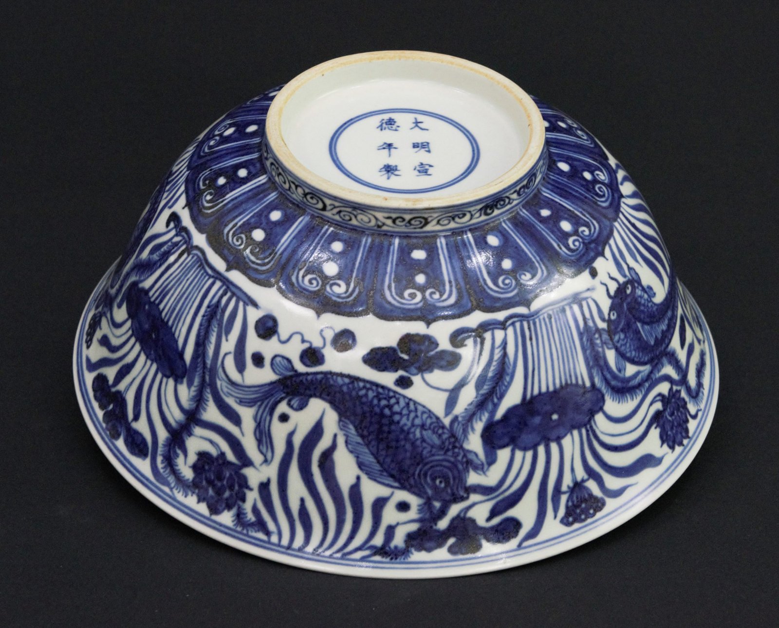 This is a large vintage blue and white porcelain bowl featuring an intricate fish and aquatic plant design, inspired by the Ming dynasty Xuande period style. The underside bears a six-character “大明宣德年製” (Made in the Xuande reign of the Great Ming) mark in underglaze blue.