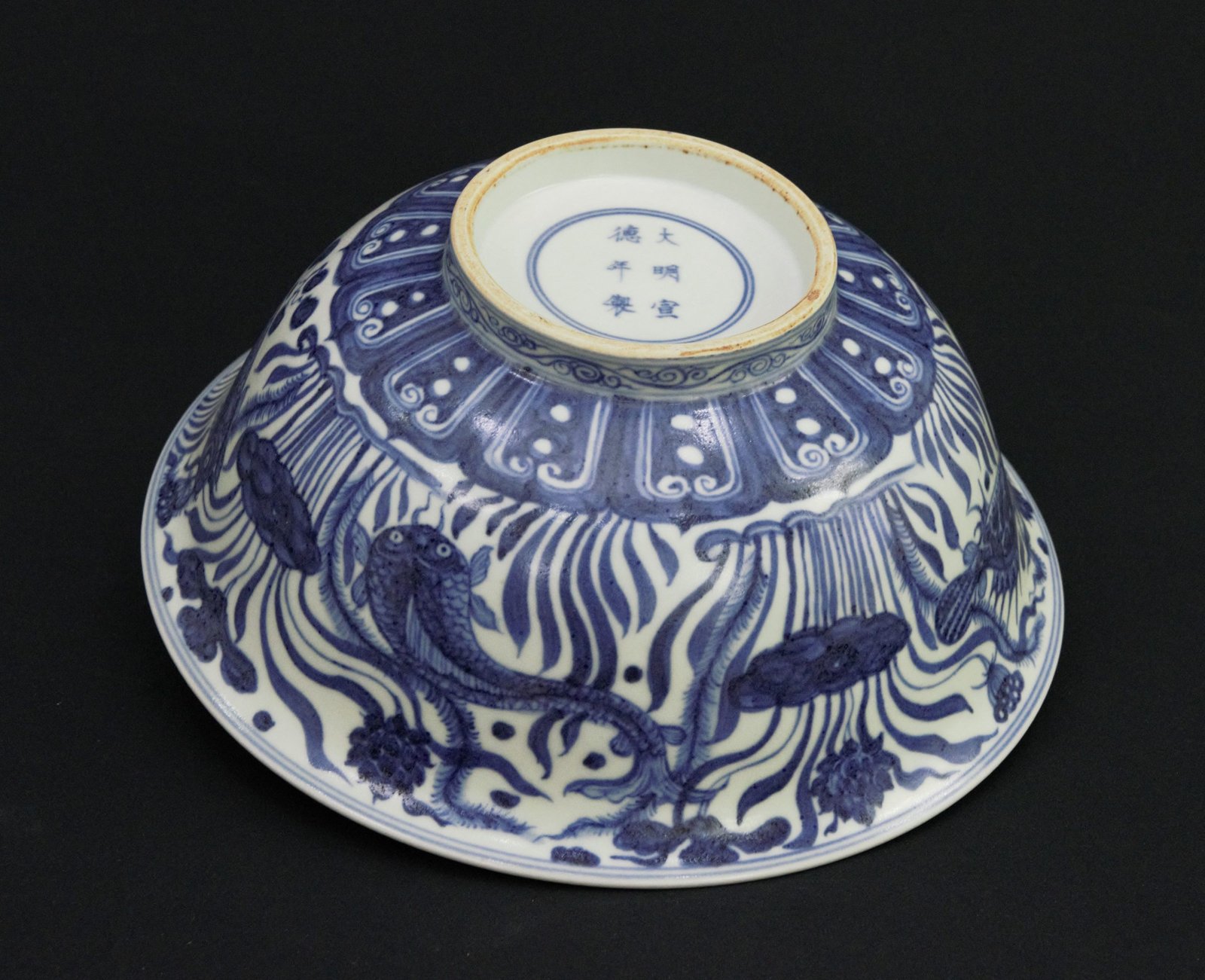 This is a large vintage blue and white porcelain bowl featuring an intricate fish and aquatic plant design, inspired by the Ming dynasty Xuande period style. The underside bears a six-character “大明宣德年製” (Made in the Xuande reign of the Great Ming) mark in underglaze blue.