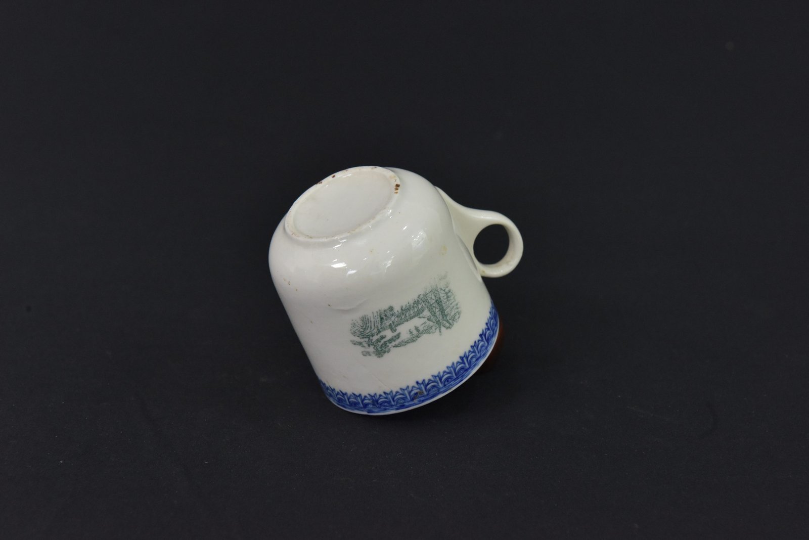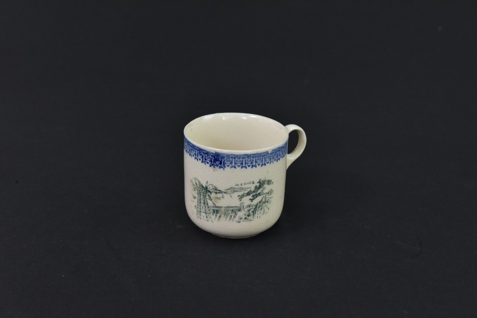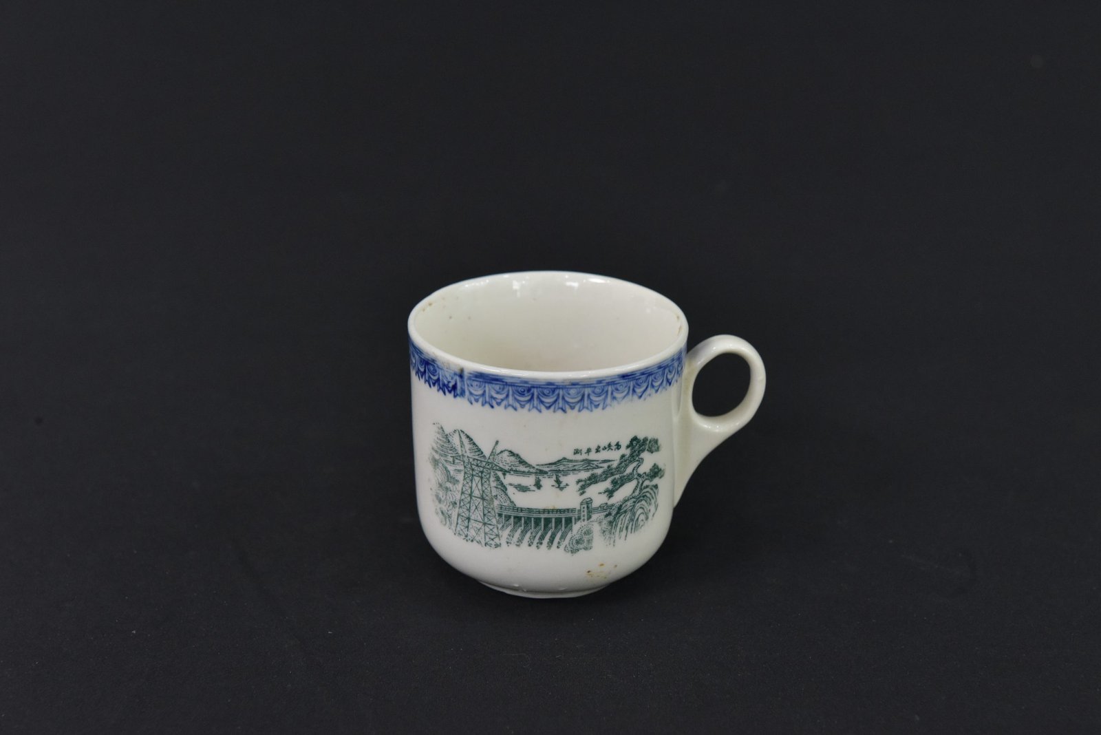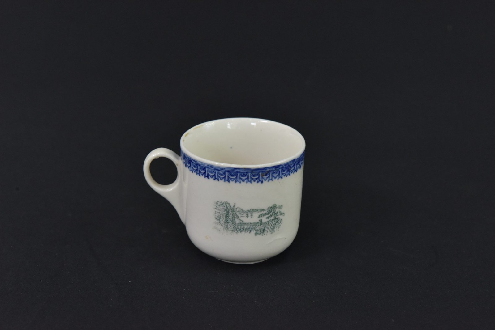 Charming 1960s porcelain cup featuring a classic rural scene in subtle green on the front, accented by an ornate blue border pattern along the rim. The simple, rounded form and loop handle give it a timeless appeal, perfect for collectors of vintage kitchenware or traditional ceramics.