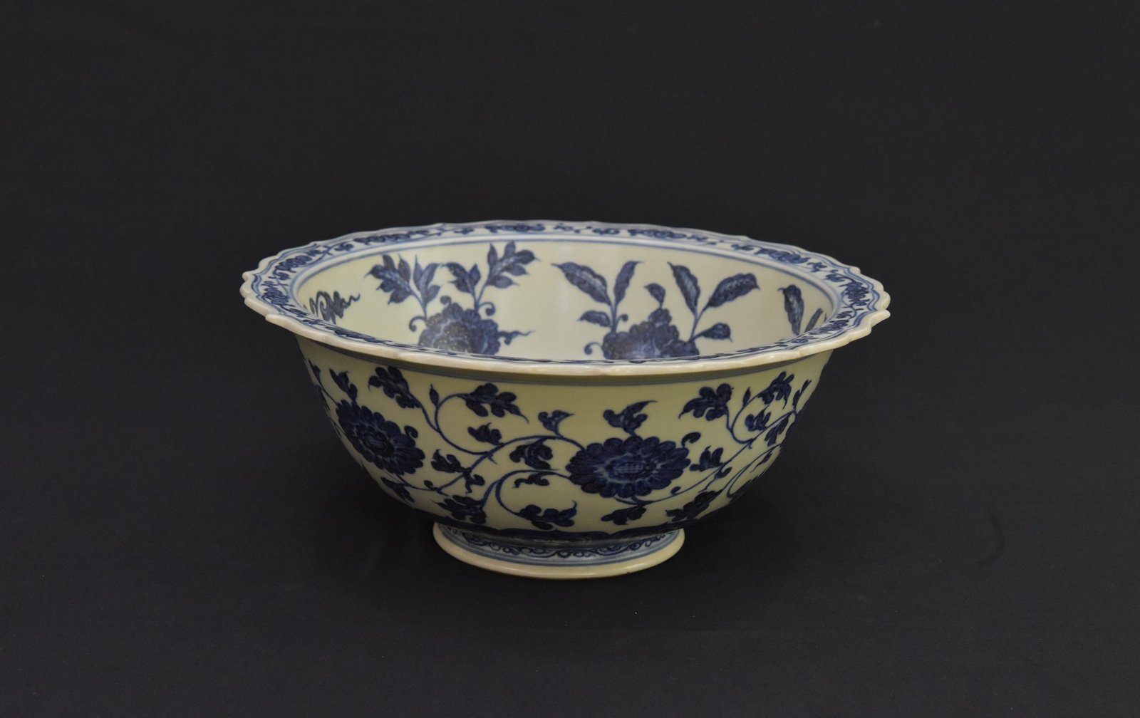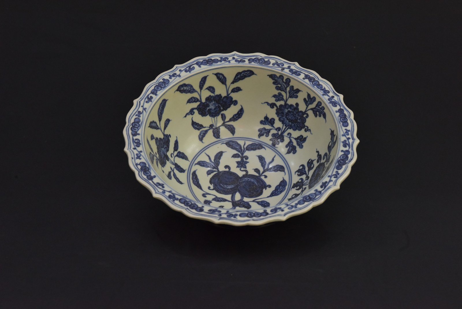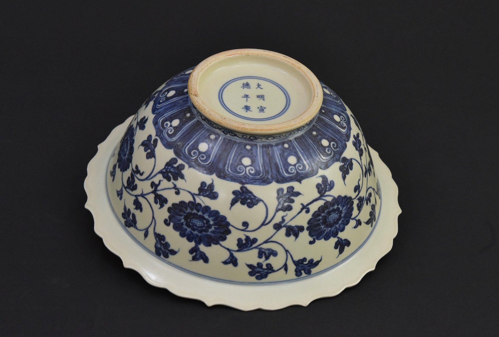 Offered is a finely crafted vintage Chinese blue and white porcelain bowl in the style of the Ming Dynasty Xuande period (仿大明宣德). This large decorative bowl features intricate floral scroll (缠枝莲) patterns inside and along the rim, executed in deep cobalt blue underglaze. The center medallion displays twin pomegranates, a traditional symbol of abundance and prosperity in Chinese culture. The gently scalloped rim adds elegance to the classic design.