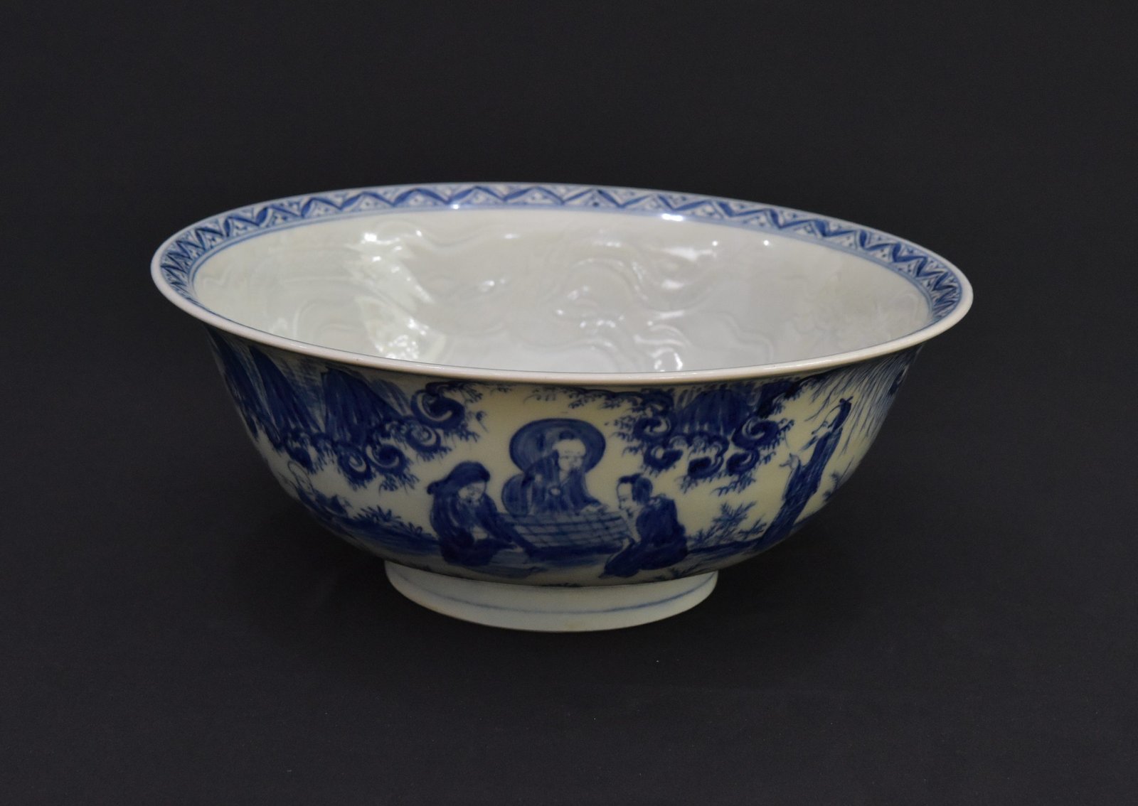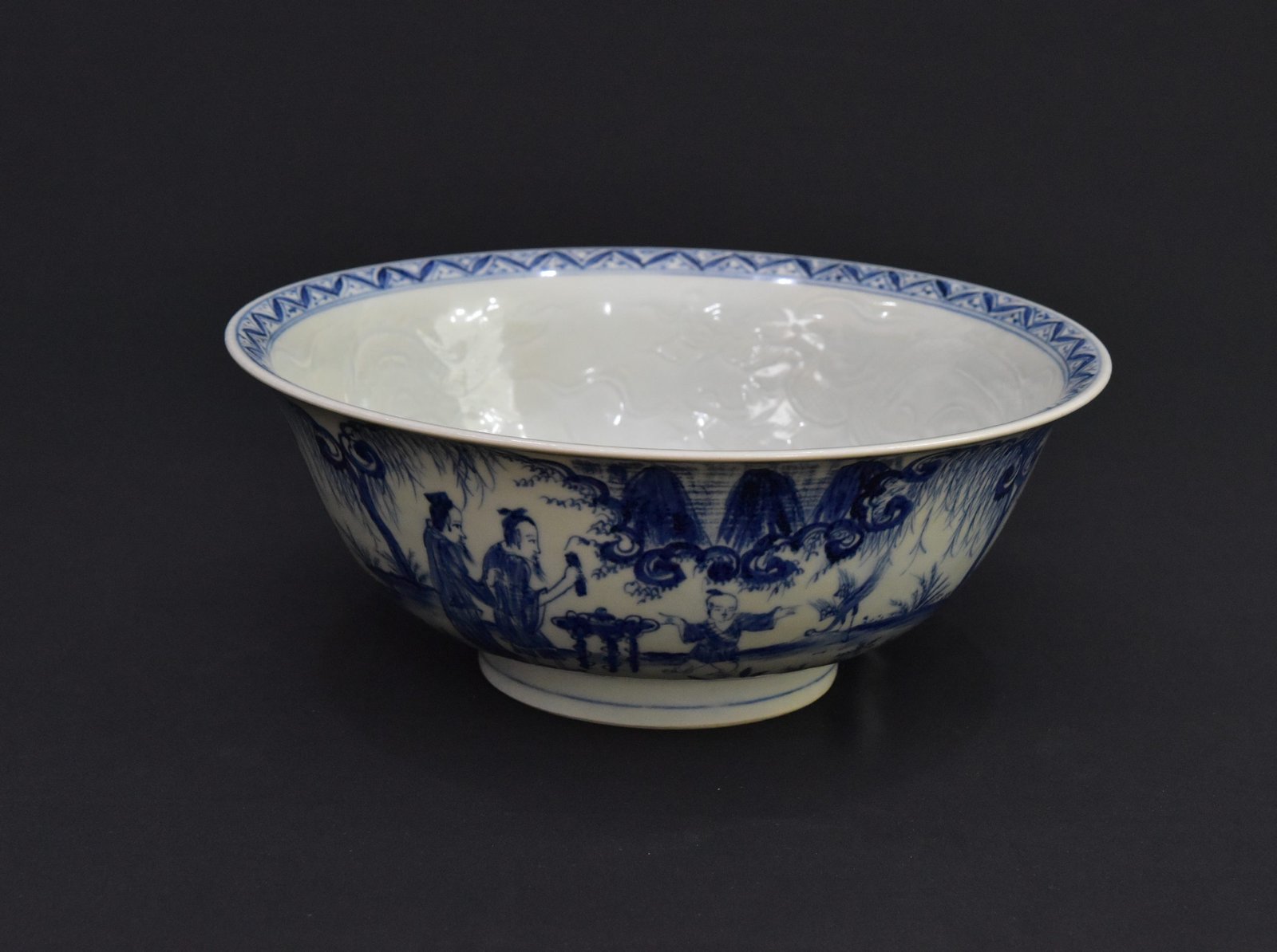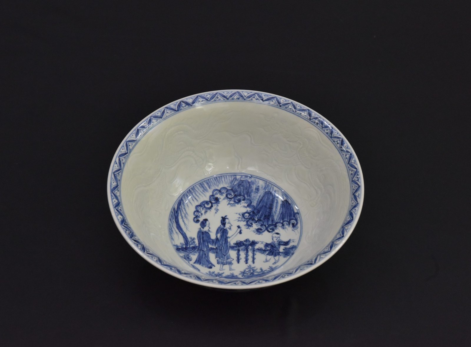 Decoration: Blue and white scholar scene (仕人图) with incised dragon pattern (暗刻龙纹) inside