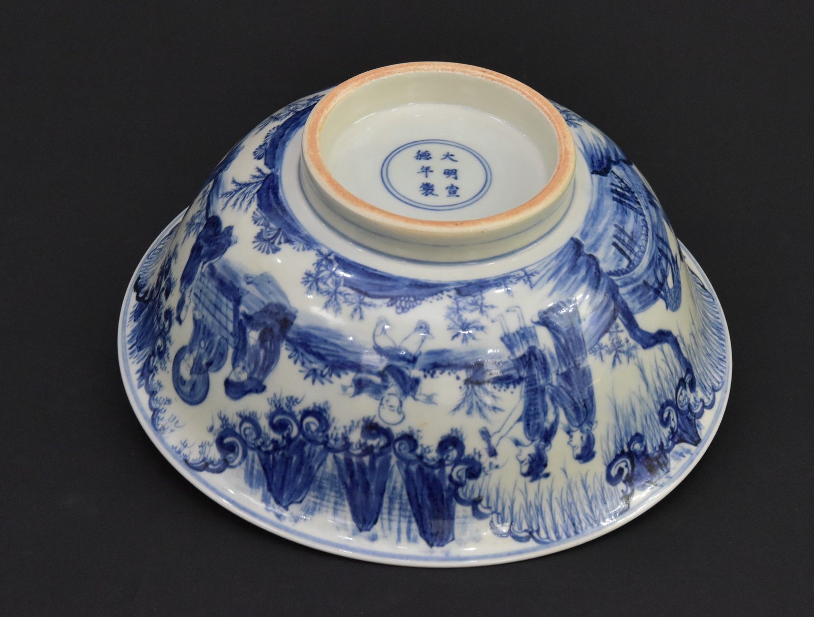 This is a beautiful vintage Chinese porcelain bowl in the style of “仿大明宣德” (Imitation Xuande Period of the Ming Dynasty), dating from the 1980s. The exterior features a finely detailed blue and white “仕人图” (scholar scene) motif, while the interior is subtly adorned with an “暗刻龙纹” (incised dragon pattern), adding depth and elegance.