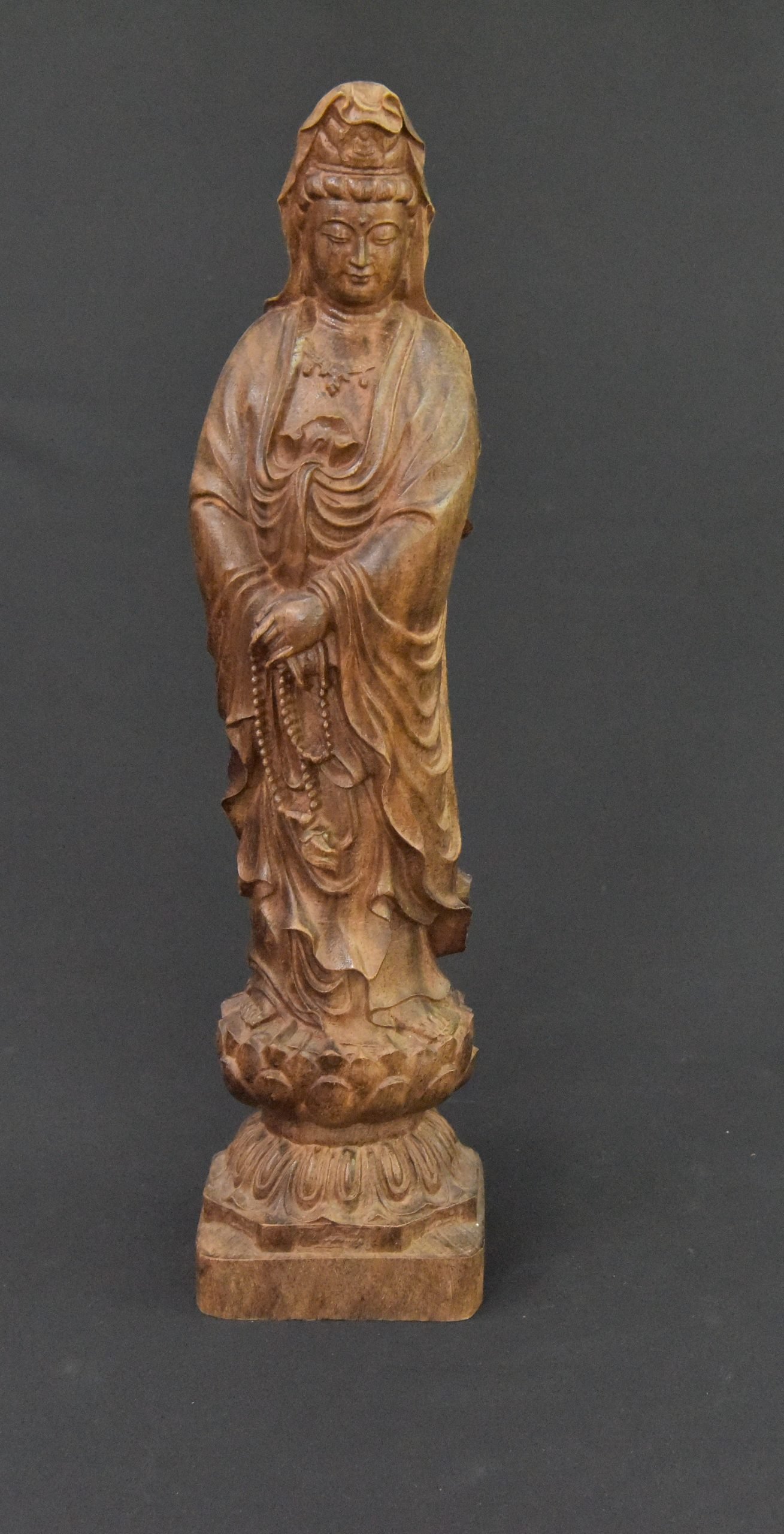 Beautifully carved wooden statue depicting Guanyin, the Bodhisattva of Compassion. This serene figure showcases intricate detailing in the flowing robes and peaceful expression. A wonderful piece of Chinese artistry from the 1990s.