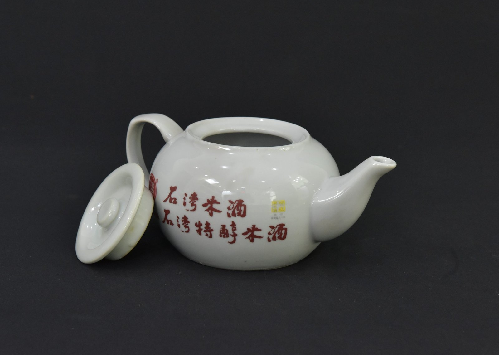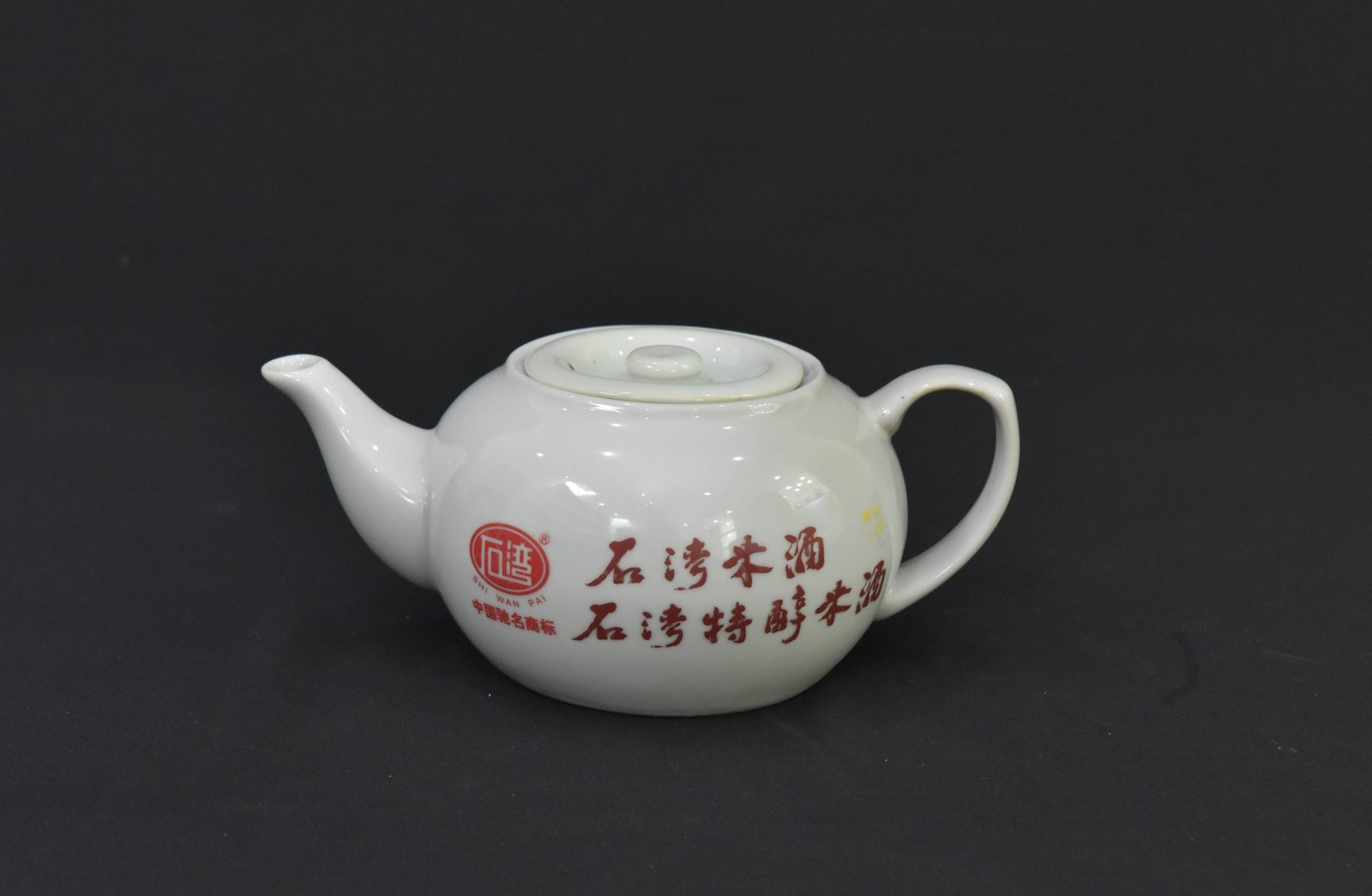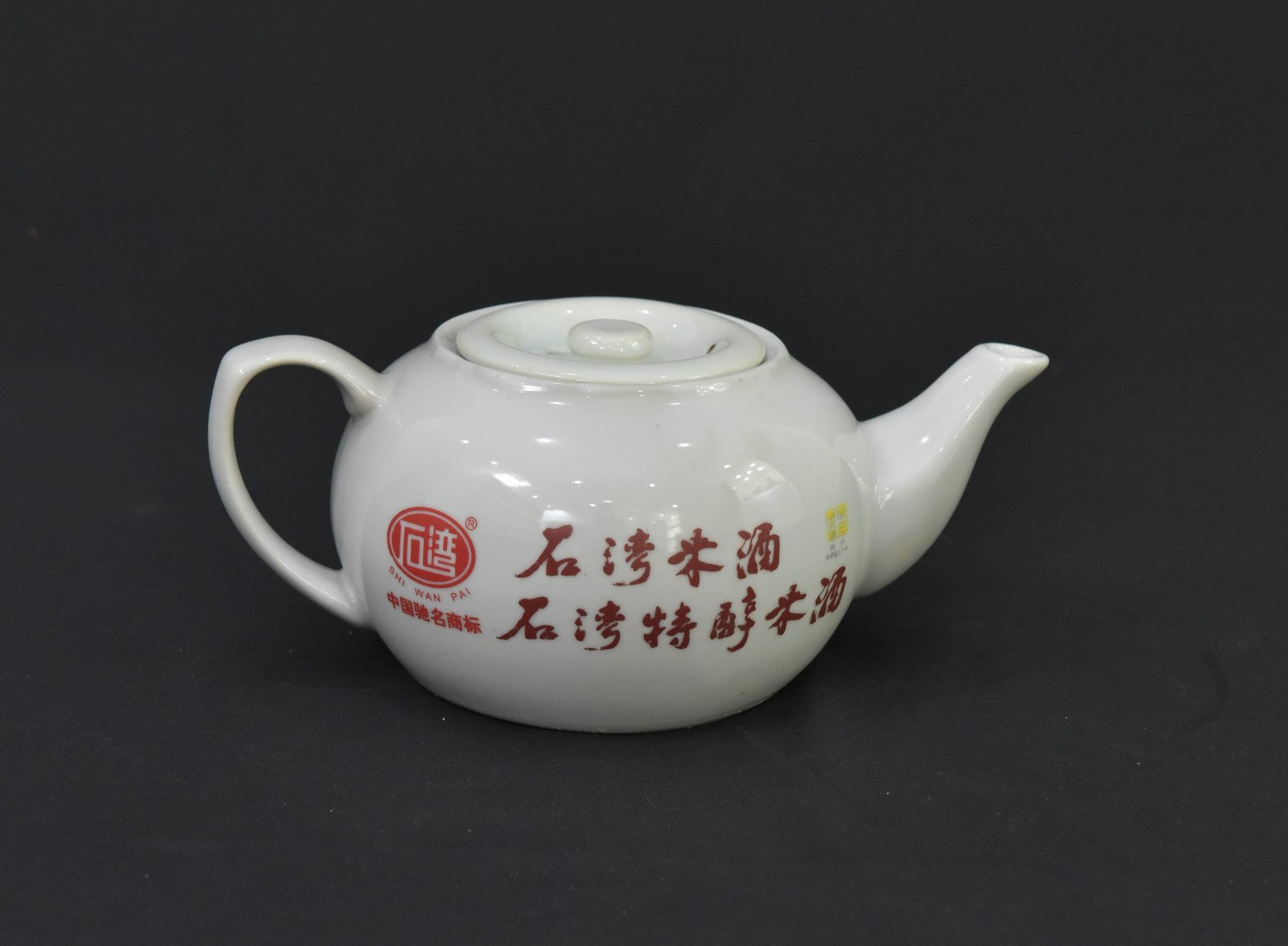 This vintage Chinese ceramic teapot features a classic rounded body with an elegant spout and handle. Adorned with traditional Chinese calligraphy in rich red glaze, it displays the branding of “Shi Wan Pai,” a known name associated with traditional Chinese rice wine. The inscriptions and insignia give it an authentic cultural aesthetic, making it a distinctive addition to any teaware collection or decorative display.