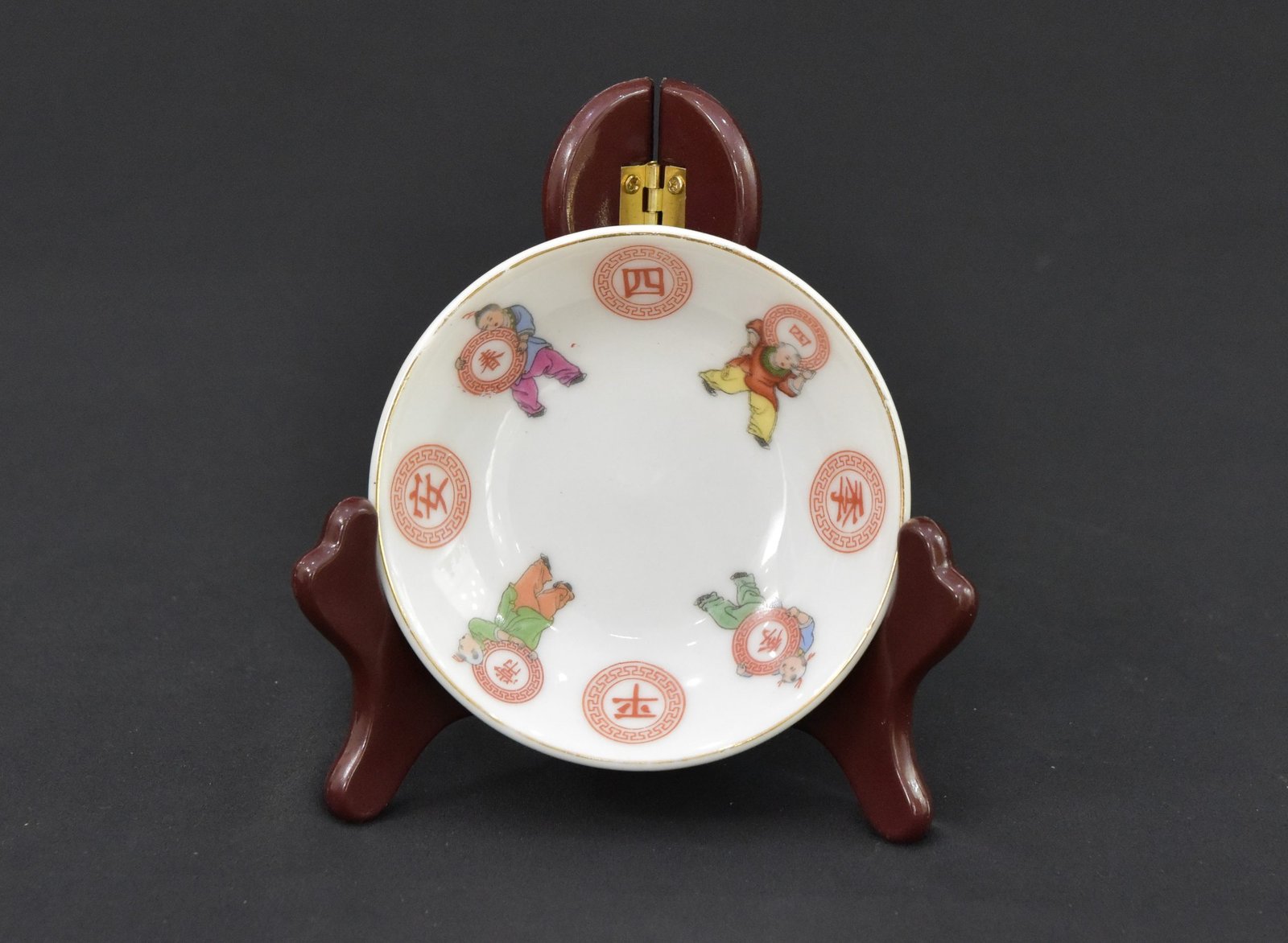 This vintage 1980s Chinese porcelain dish features a classic design with four children depicted in traditional attire, each holding a circular panel with Chinese calligraphy symbols. The outer edge is adorned with red geometric border medallions containing stylized characters, adding a balanced visual and cultural appeal.