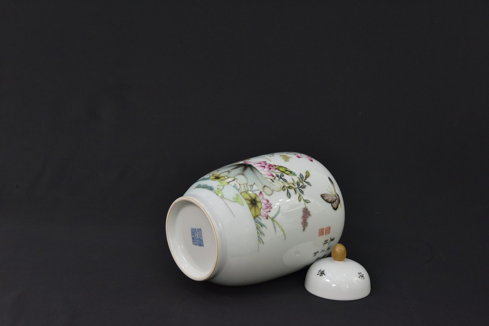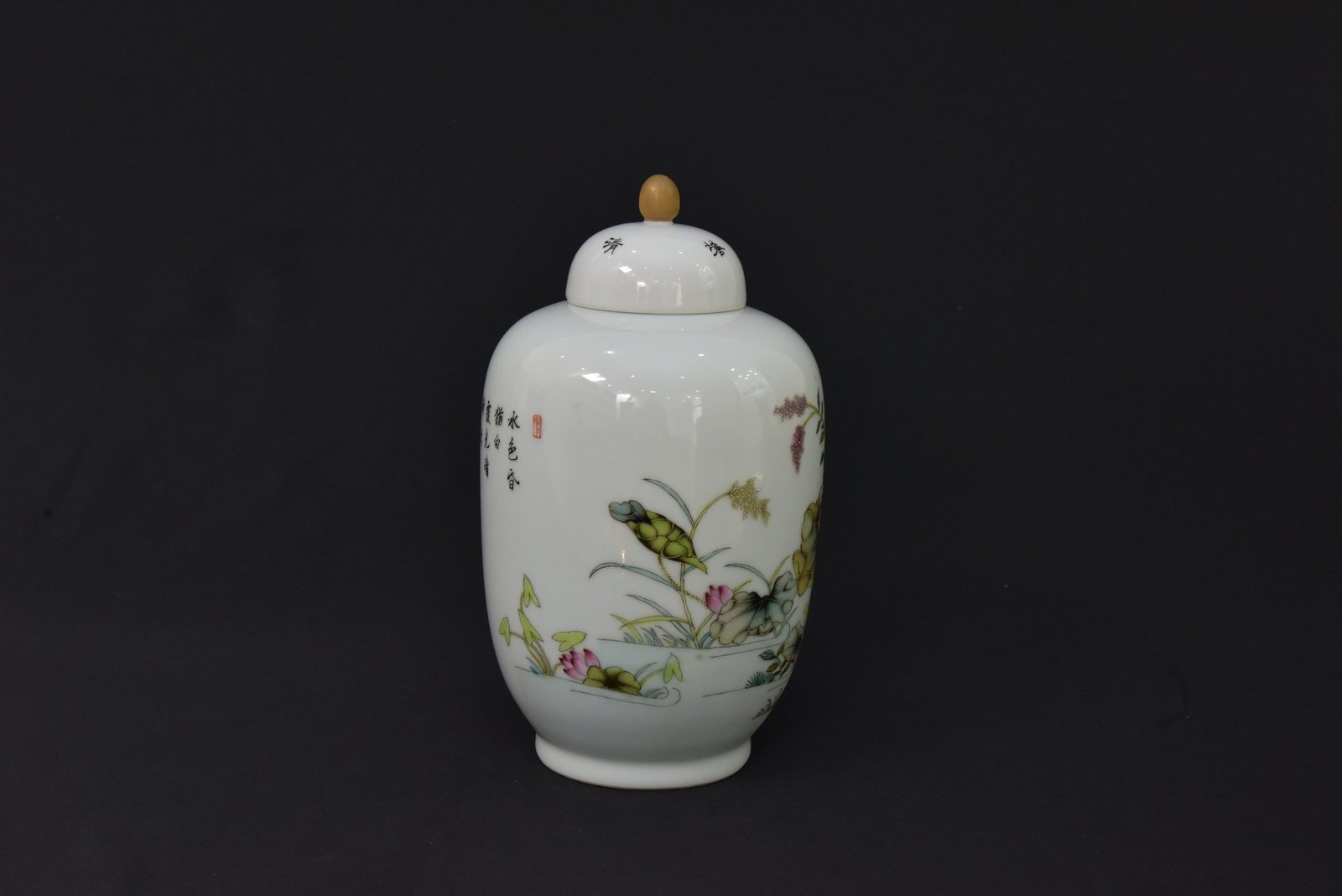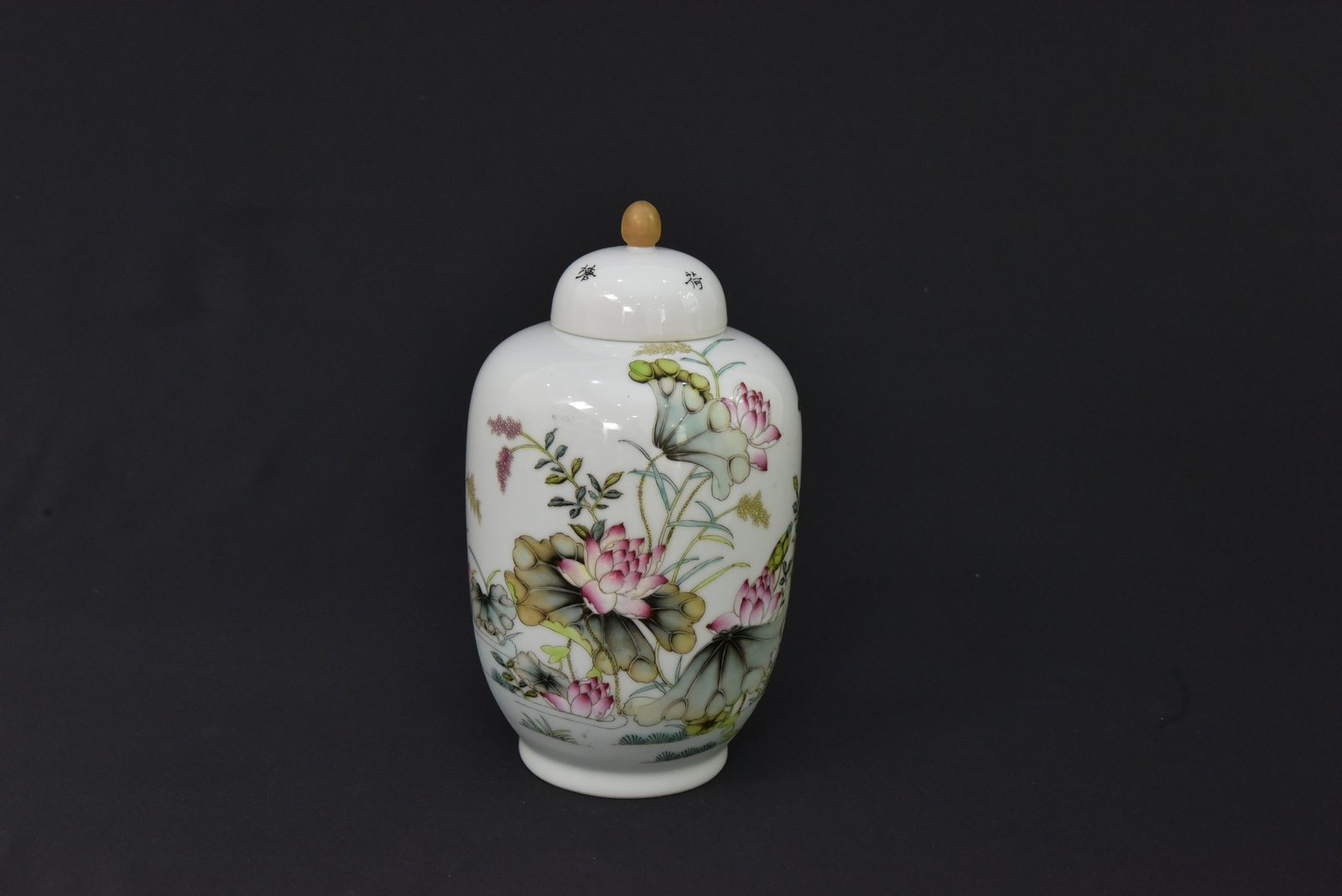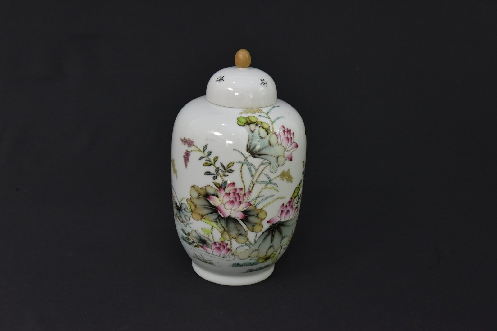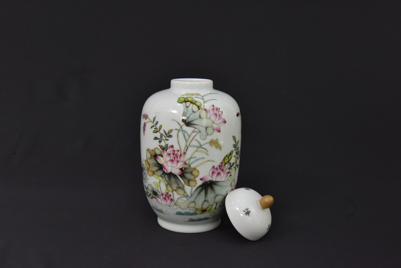 This elegant porcelain jar features a finely detailed lotus flower and foliage design in soft green, pink, and earthy tones. The artwork is beautifully arranged around the body, giving the piece a refined decorative presence. The jar comes with a matching lid topped with a rounded finial, adding to its classic appeal.
