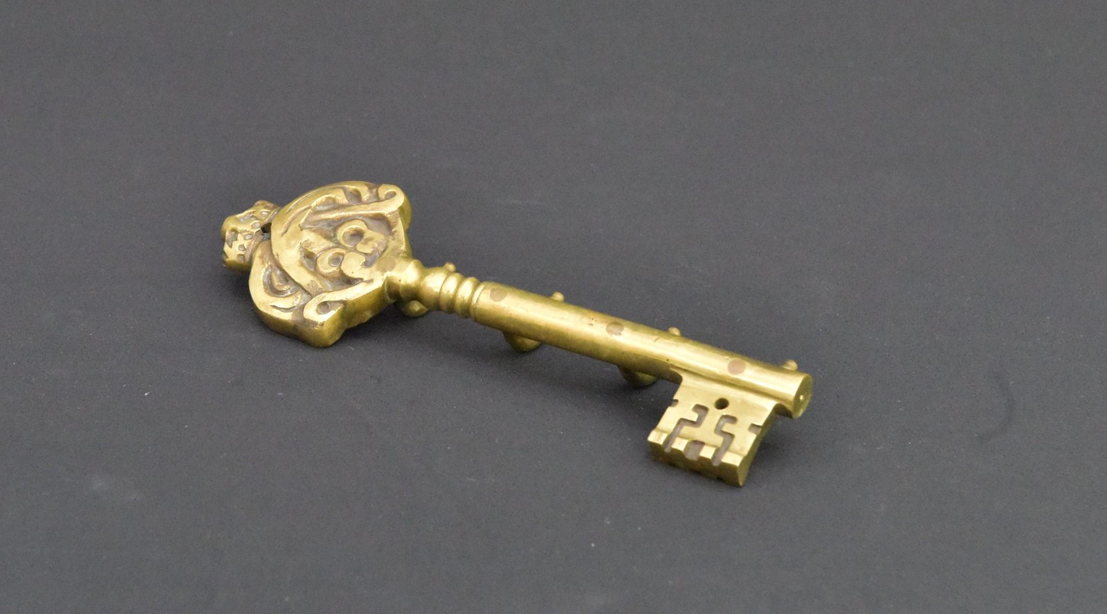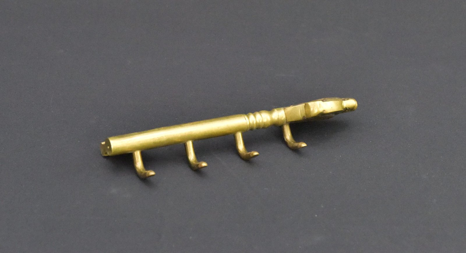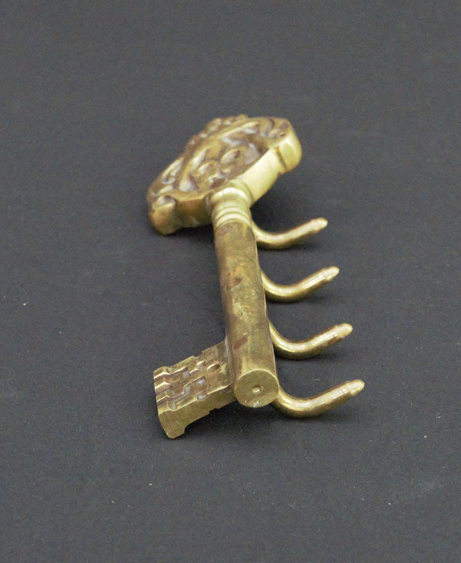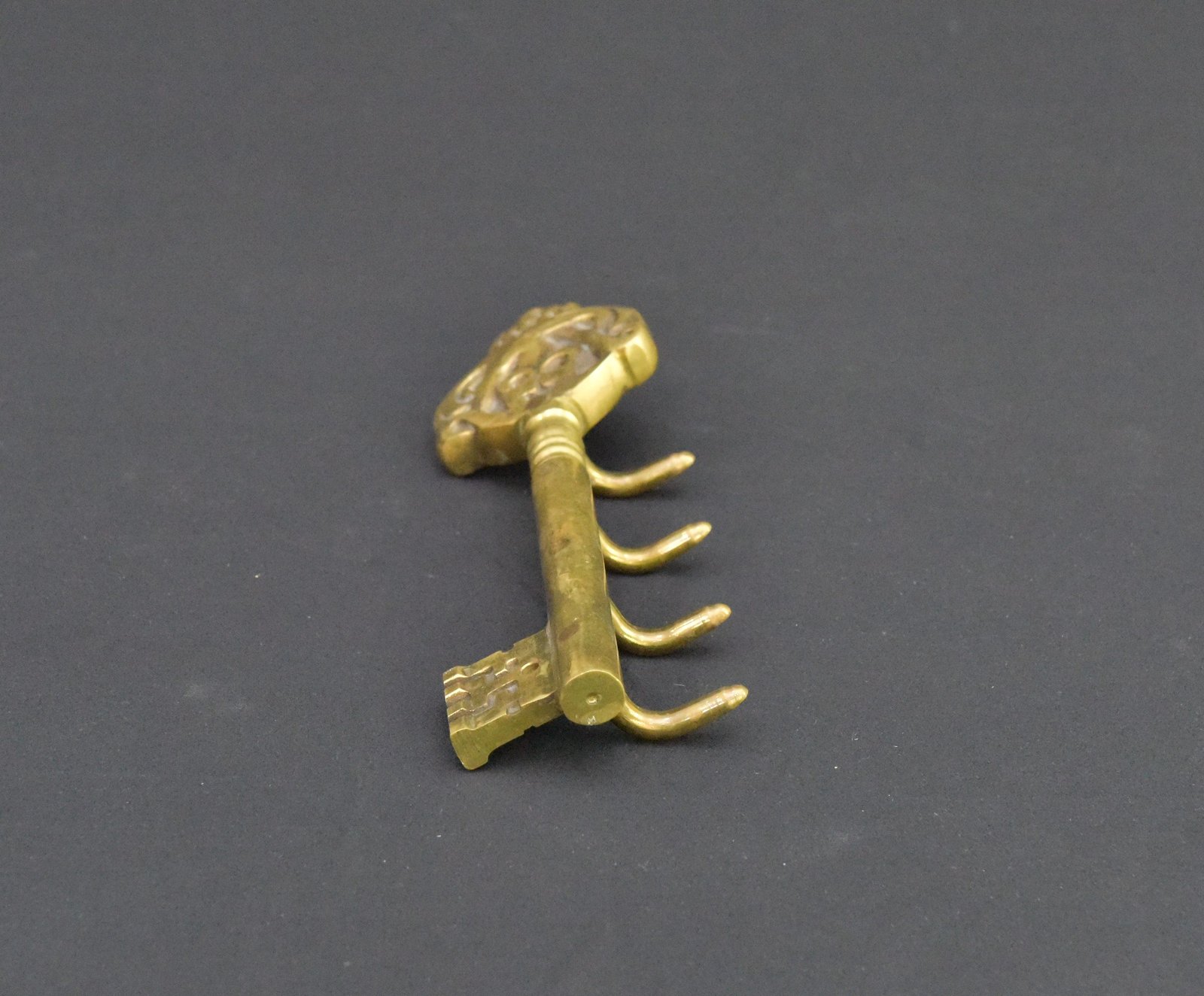 Add a touch of vintage charm to your space with this unique wall-mounted key holder from the 1960s. Crafted from solid metal with a brass finish, this piece features an ornate Chinese-inspired design in the shape of a large skeleton key. The stem of the key serves as the base for four sturdy hooks—perfect for organizing keys, jewelry, or small hanging items.