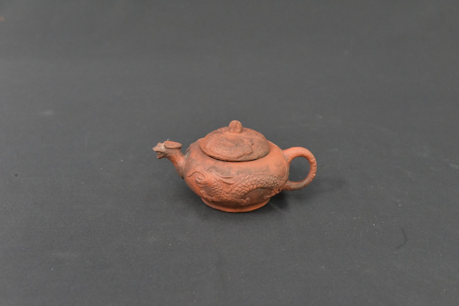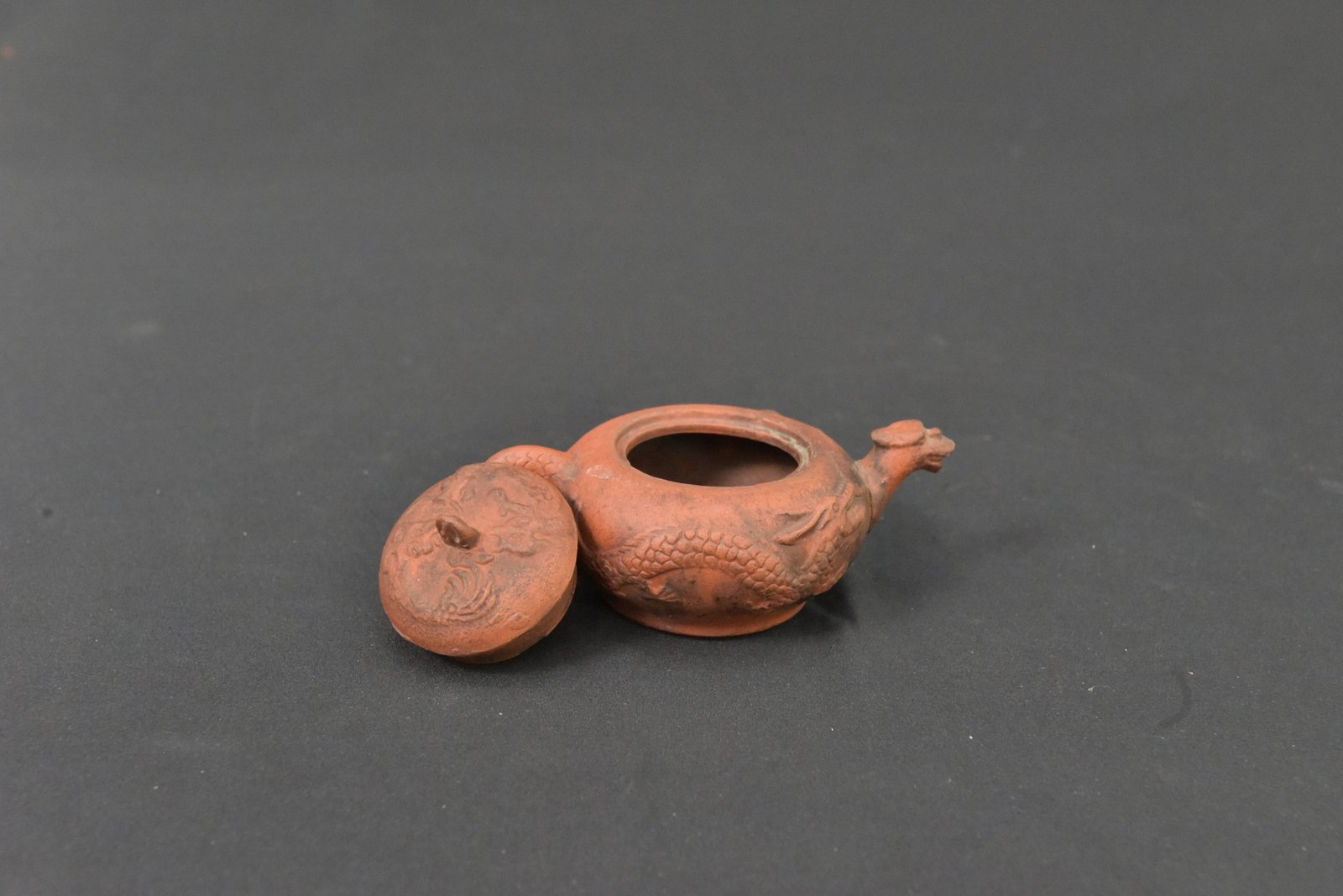 This vintage Yixing teapot from the 1990s features a striking dragon relief design, embodying traditional Chinese symbolism and craftsmanship. The spout is shaped like a mythical beast, complementing the intricate dragon detailing along the body. Made from unglazed Zisha (purple clay), this teapot is known for its porous nature, enhancing the flavor and aroma of tea over time.