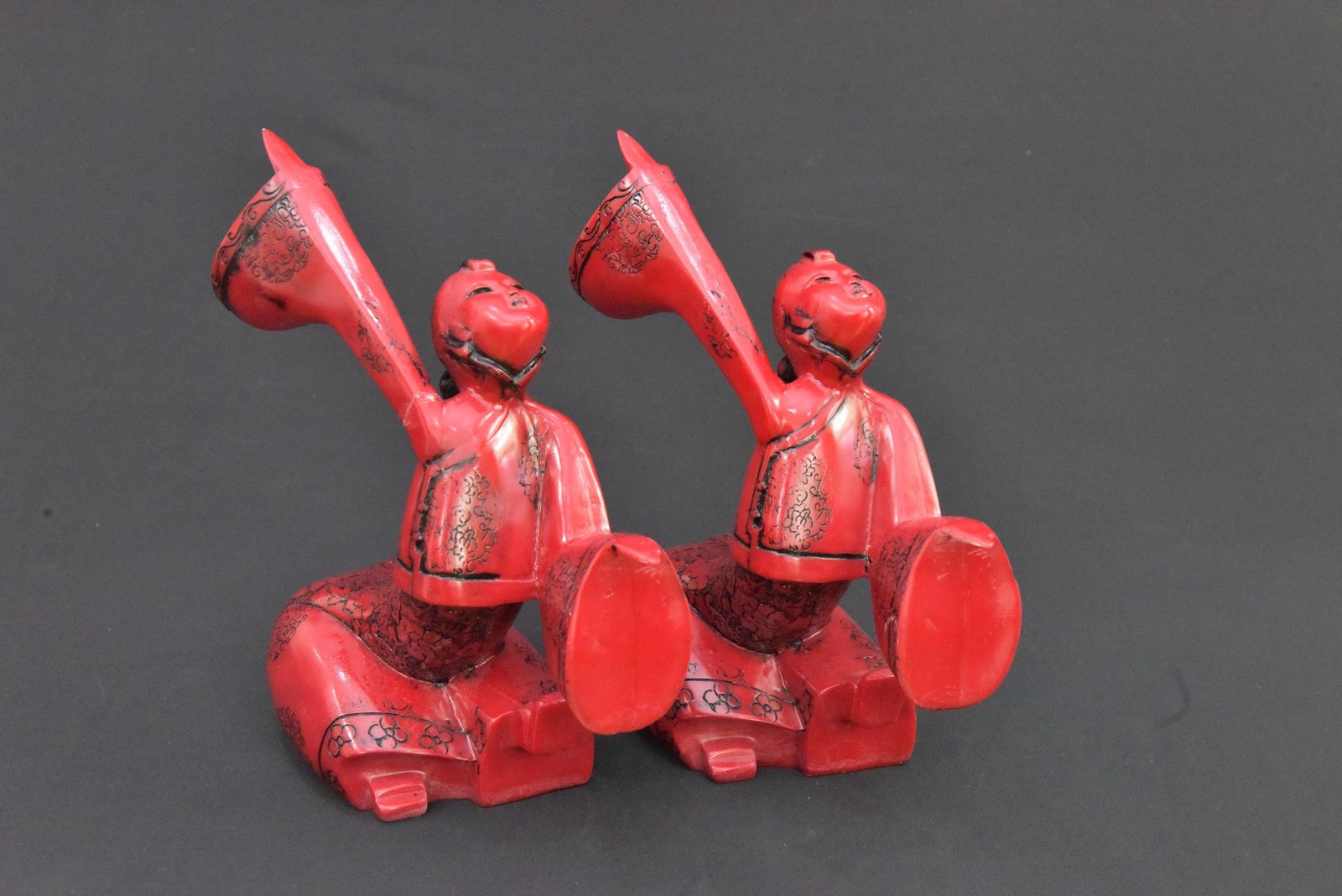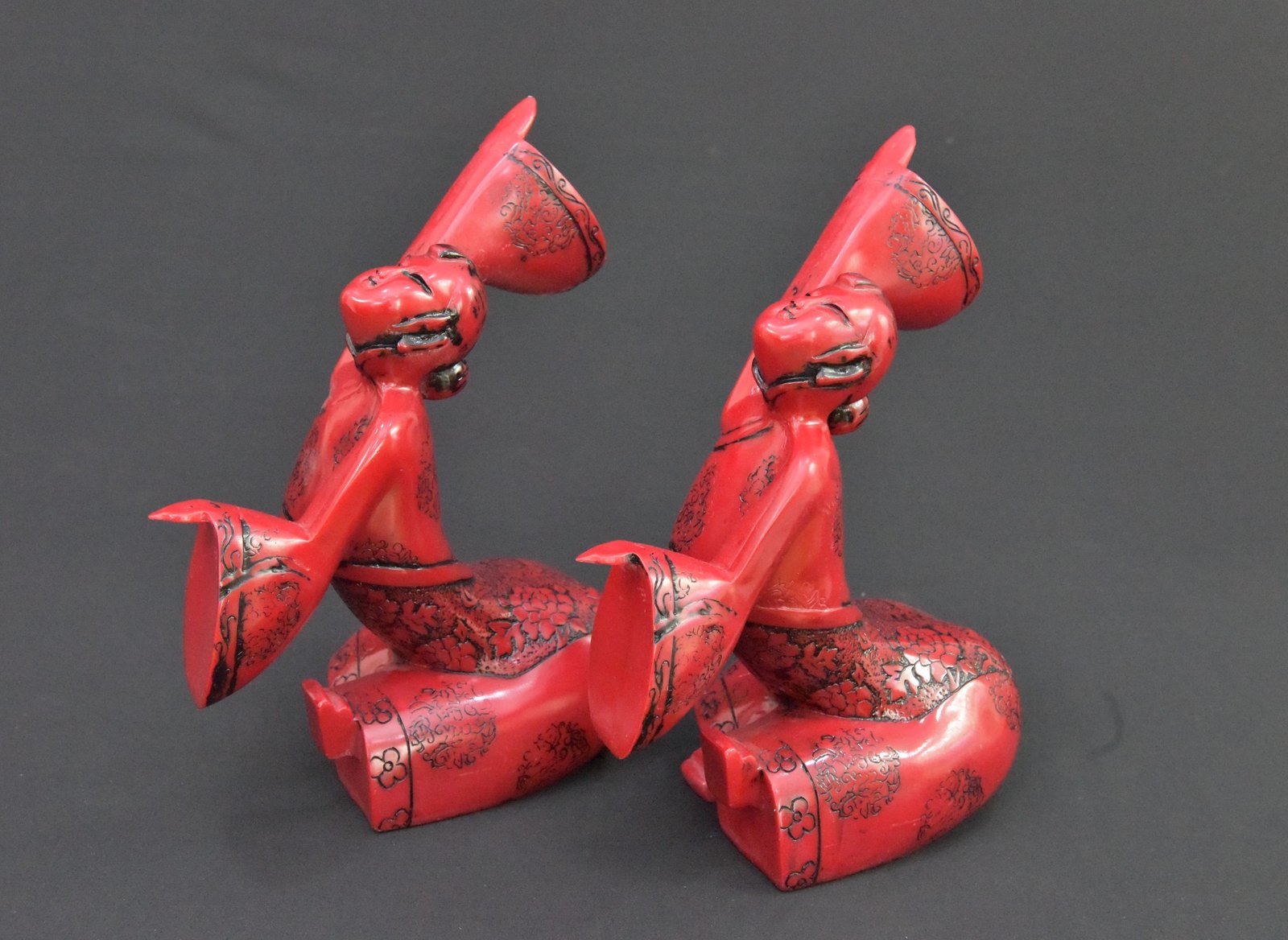 This listing features a beautifully detailed pair of vintage red figurines depicting traditional Chinese dancers in elegant robes. Each figure is posed in a dramatic stance with one arm raised, capturing a moment of expressive movement. Fine black etched detailing enhances the flowing garments.
