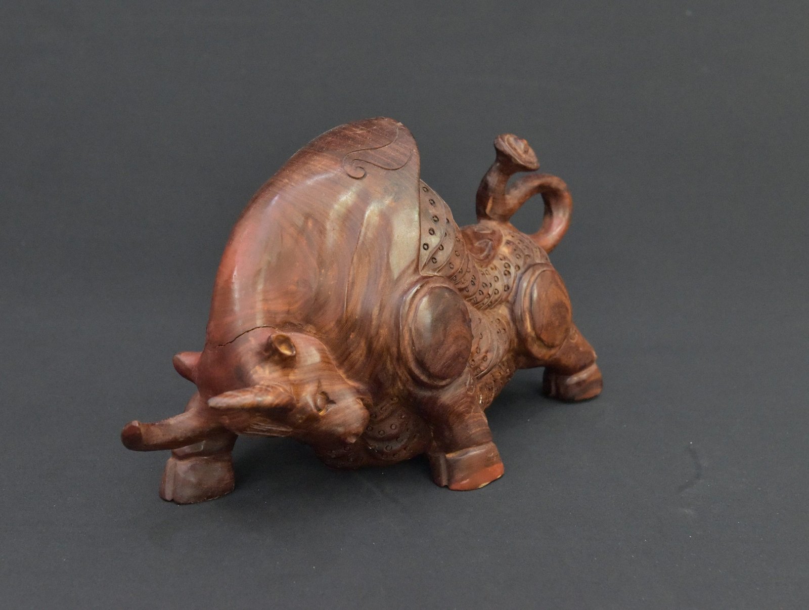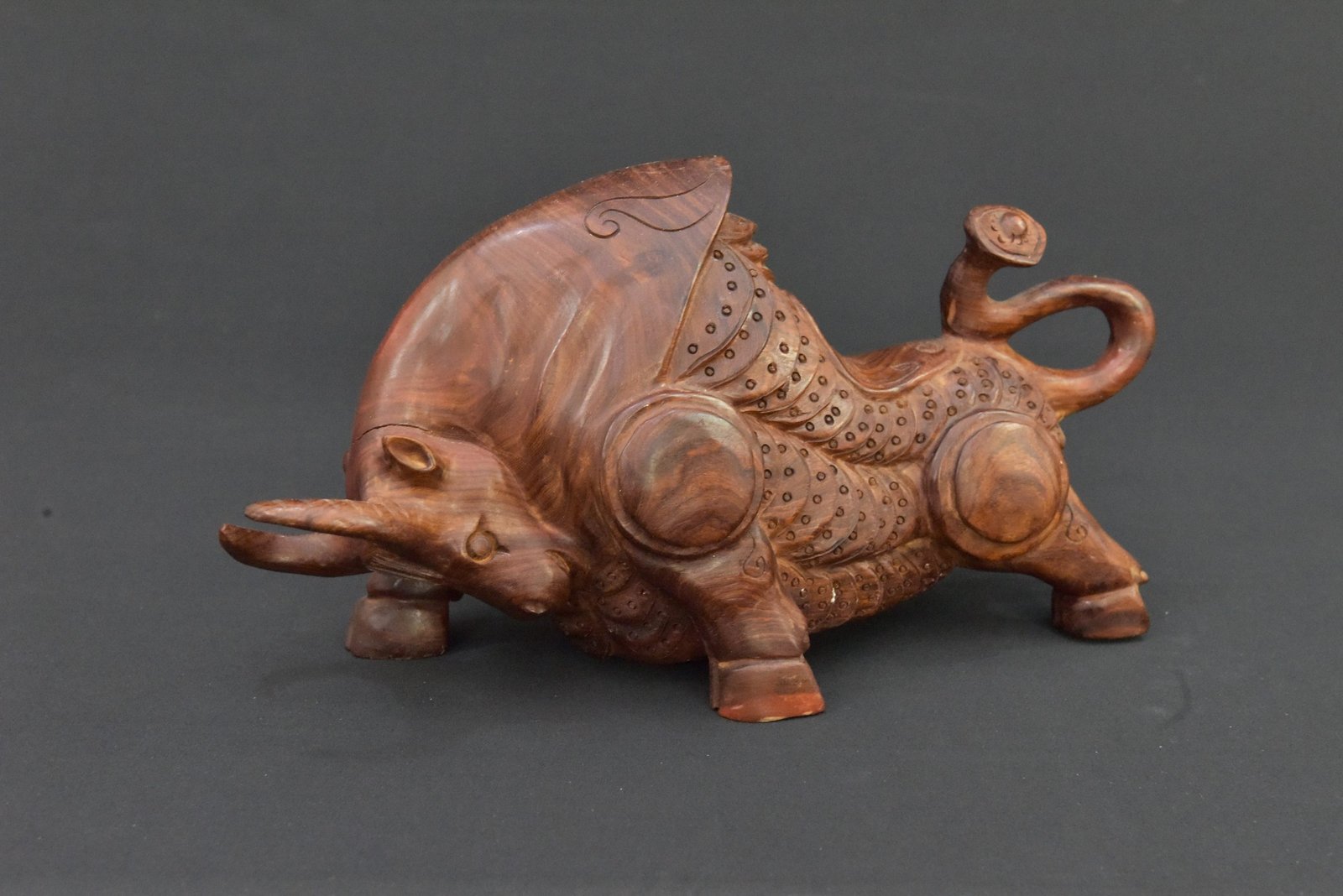 This unique wooden money bull figurine from the 1990s showcases detailed craftsmanship and a bold, dynamic design. Carved from solid wood, it features a stylized form with intricate etched patterns across its body, evoking strength and prosperity. The figure’s powerful stance and coiled tail add a sense of movement and character, making it an eye-catching addition to any collection or decor.