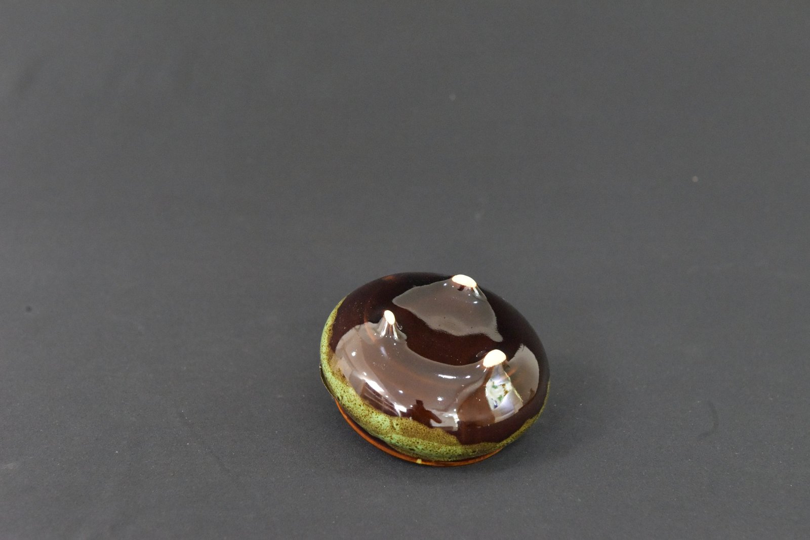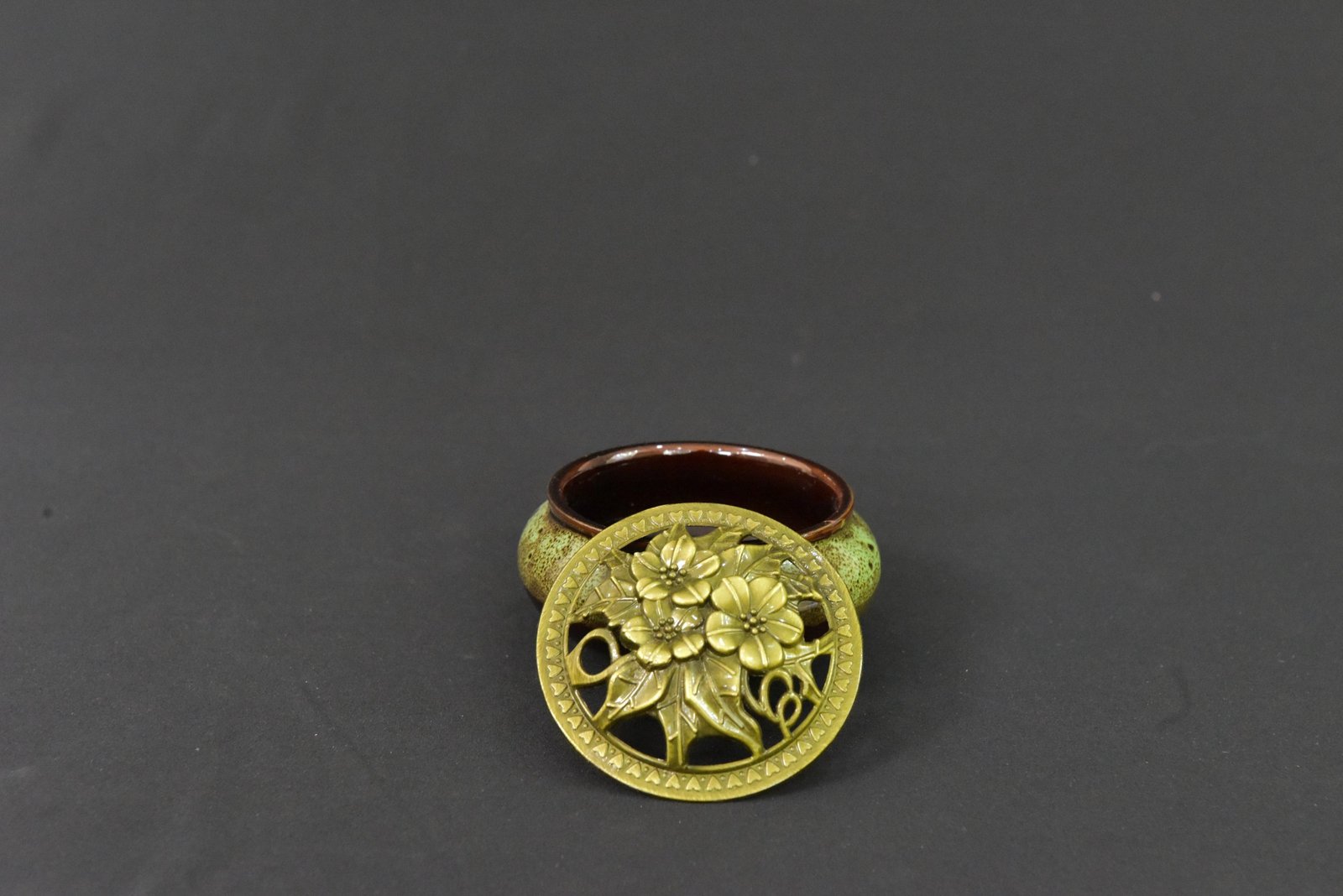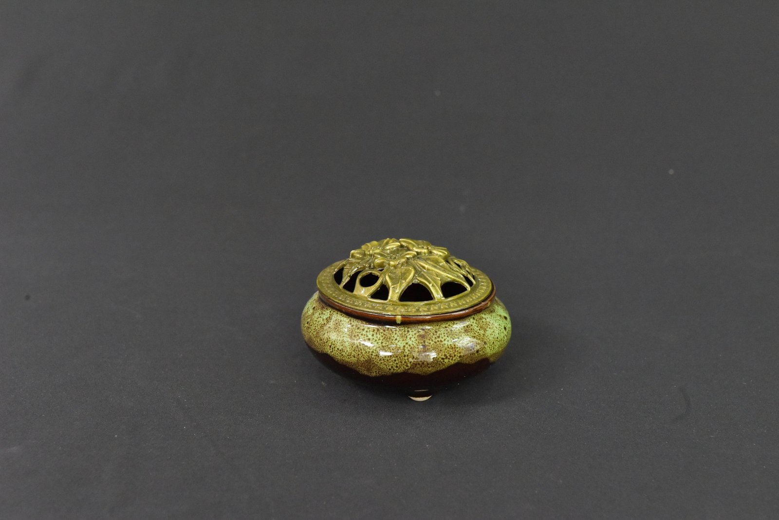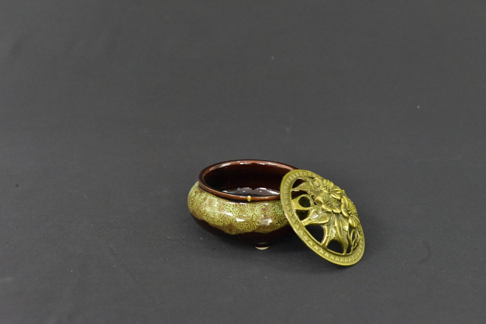 This elegant incense burner features a smooth ceramic body with a speckled green glaze and warm brown interior. The removable brass lid is intricately crafted with an openwork floral motif, allowing incense smoke to gently escape while adding a decorative touch. Ideal for use with cone or charcoal incense, it also serves beautifully as a decorative accent.